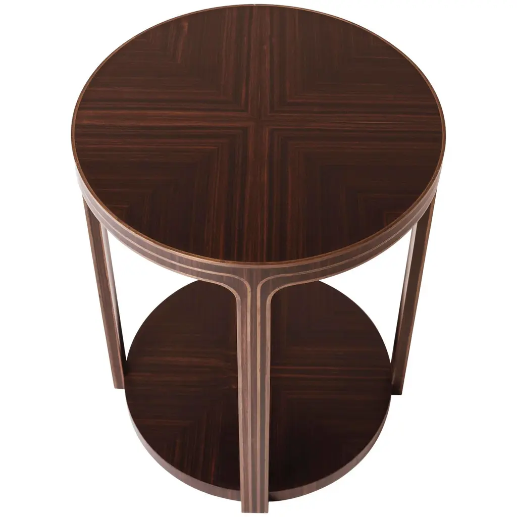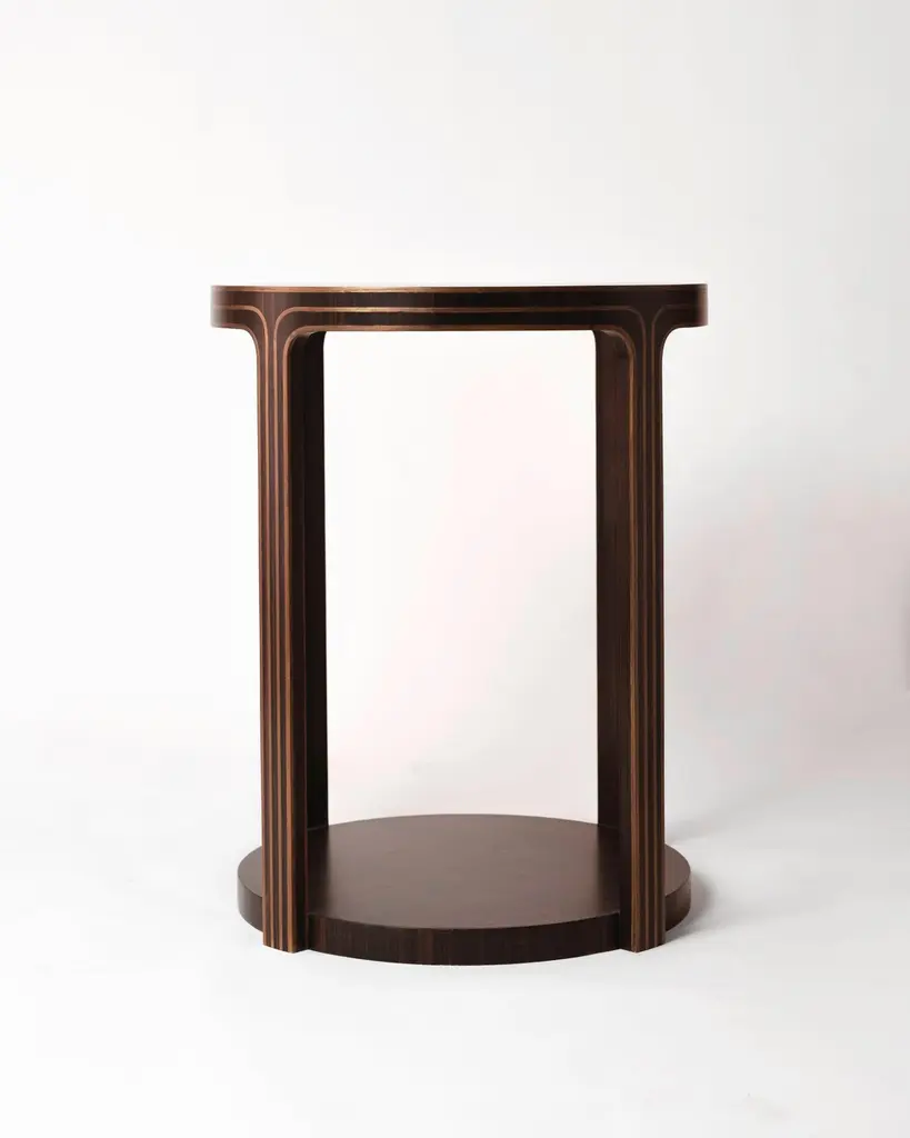 Wood side table with round tops and made from ebony veneer with bronze inlays.This table was titled after the famous building Palais de Tokyo in Paris, dedicated to modern and contemporary art. This cultural palace was built in the 1930s. We were inspired by the proportions of Empire style and wanted to use ebony wood which is very representative in Art Deco furniture. American Empire is a French-inspired Neoclassical style of American furniture and decoration that takes its name and originates from the Empire style introduced during the First French Empire period under Napoleon's rule. One of the most recognizable features of this particular style were curved forms as well as the use of woods like mahogany and ebony.Custom sizes are available, you can inquire via message.