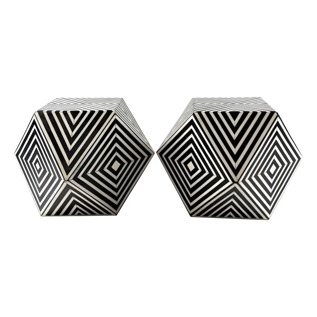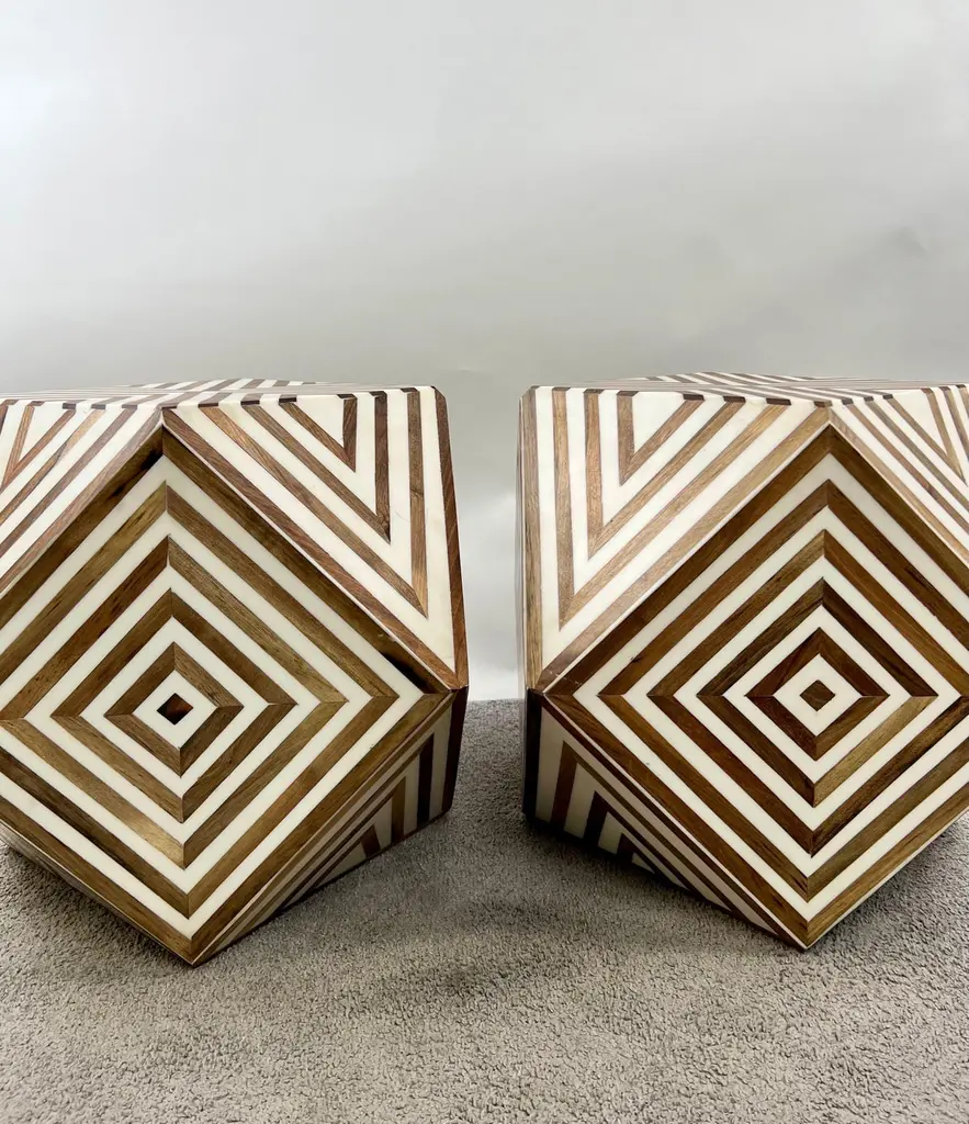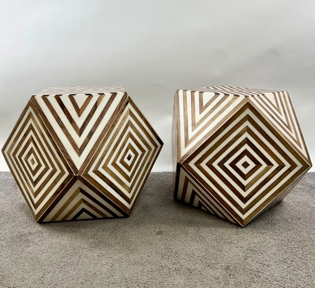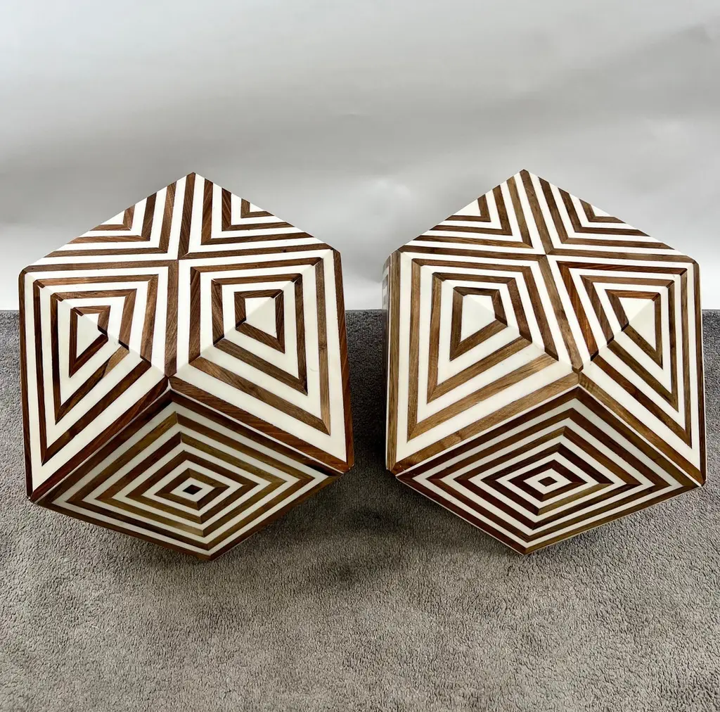 A pair of Art Deco Style Brown & White Sculptural Resin & Walnut Side or End Tables: A striking pair of sculptural side tables embodies the bold geometric elegance of Art Deco design, seamlessly fused with a contemporary edge. Crafted from high-quality resin and walnut in a striped pattern, these hexagonal forms captivate with their mesmerizing brown and white inlaid pattern, creating a dynamic visual rhythm reminiscent of Op Art influences. The intricate linear design converges into hypnotic diamond motifs, accentuating the tables' architectural form while playing with depth and perspective. Their sculptural presence makes them not only functional as side or end tables but also versatile enough to serve as statement pedestals. When paired with a glass top, they transform into a stunning and unconventional base, further elevating their aesthetic appeal. Perfect for modern, eclectic, or avant-garde interiors, these pieces offer a seamless balance between bold artistic expression and refined sophistication, making them a captivating focal point in any space.Dimensions: 18" H 22.75" W 22.75 DTable Top: 12" x 12"