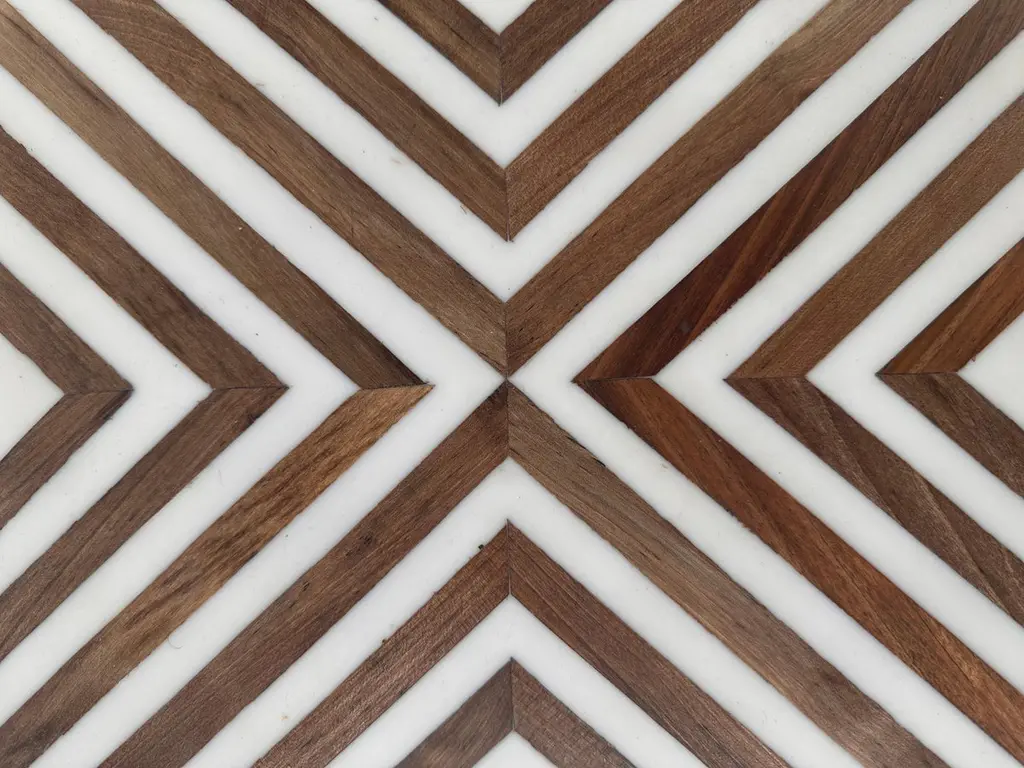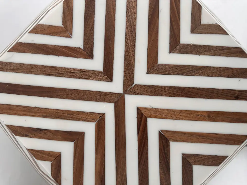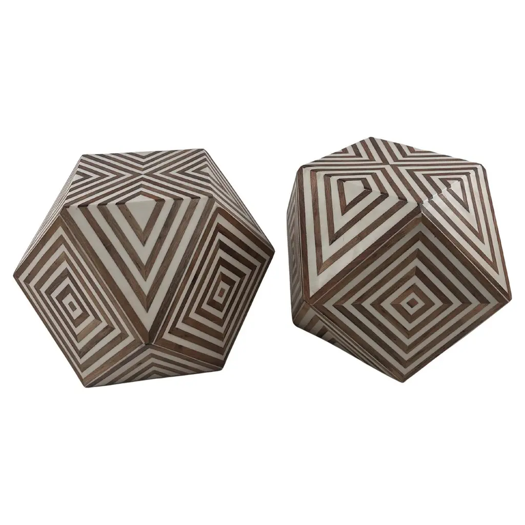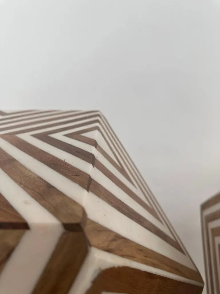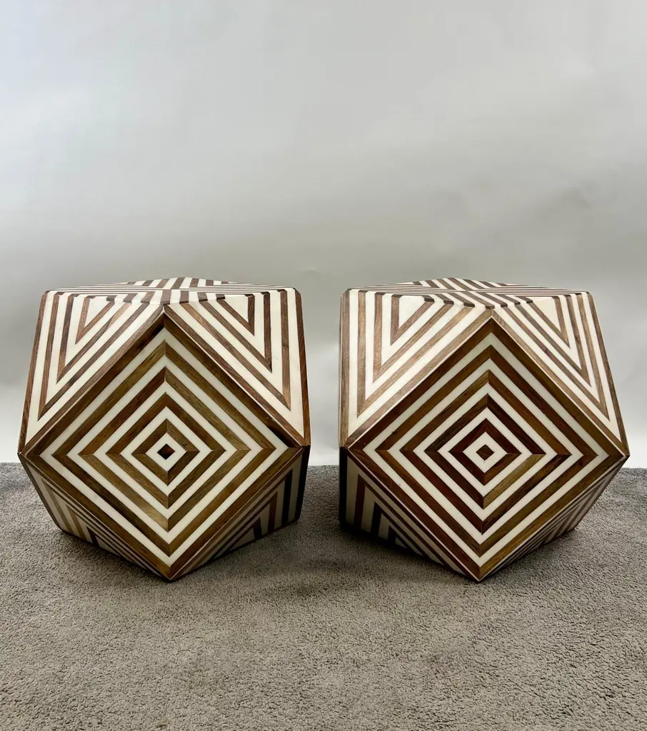 A pair of Art Deco Style Brown & White Sculptural Resin & Walnut Side or End Tables: A striking pair of sculptural side tables embodies the bold geometric elegance of Art Deco design, seamlessly fused with a contemporary edge. Crafted from high-quality resin and walnut in a striped pattern, these hexagonal forms captivate with their mesmerizing brown and white inlaid pattern, creating a dynamic visual rhythm reminiscent of Op Art influences. The intricate linear design converges into hypnotic diamond motifs, accentuating the tables' architectural form while playing with depth and perspective. Their sculptural presence makes them not only functional as side or end tables but also versatile enough to serve as statement pedestals. When paired with a glass top, they transform into a stunning and unconventional base, further elevating their aesthetic appeal. Perfect for modern, eclectic, or avant-garde interiors, these pieces offer a seamless balance between bold artistic expression and refined sophistication, making them a captivating focal point in any space.Dimensions: 18" H 22.75" W 22.75 DTable Top: 12" x 12"