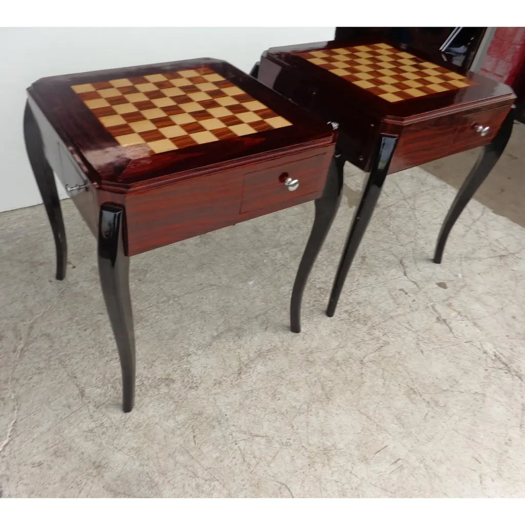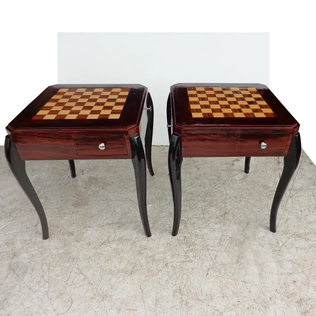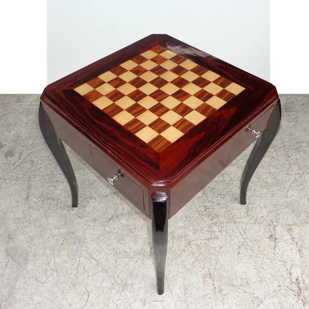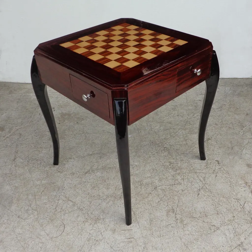 Art Deco style game side tableRosewood veneer paired with ebonized cabriole legs and chess/checkboard top. Four drawers with nickel pulls.2 available.