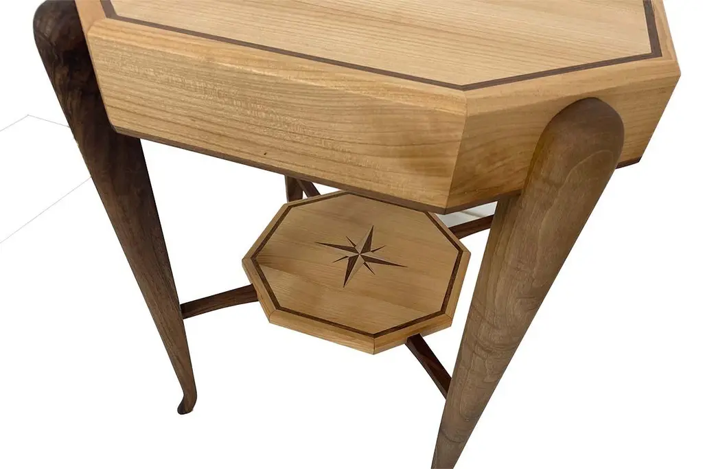 Art Deco style side table inspired by Ruhlmann. Beautiful filigree table with intricate details and fantastic shapes. This table is made entirely of solid wood - even the inlay work! Only fine woods were used: cherry, walnut, maple, selected and perfectly processed by our Ebenist. Each of these 20 pieces of furniture is unique and is signed accordingly.