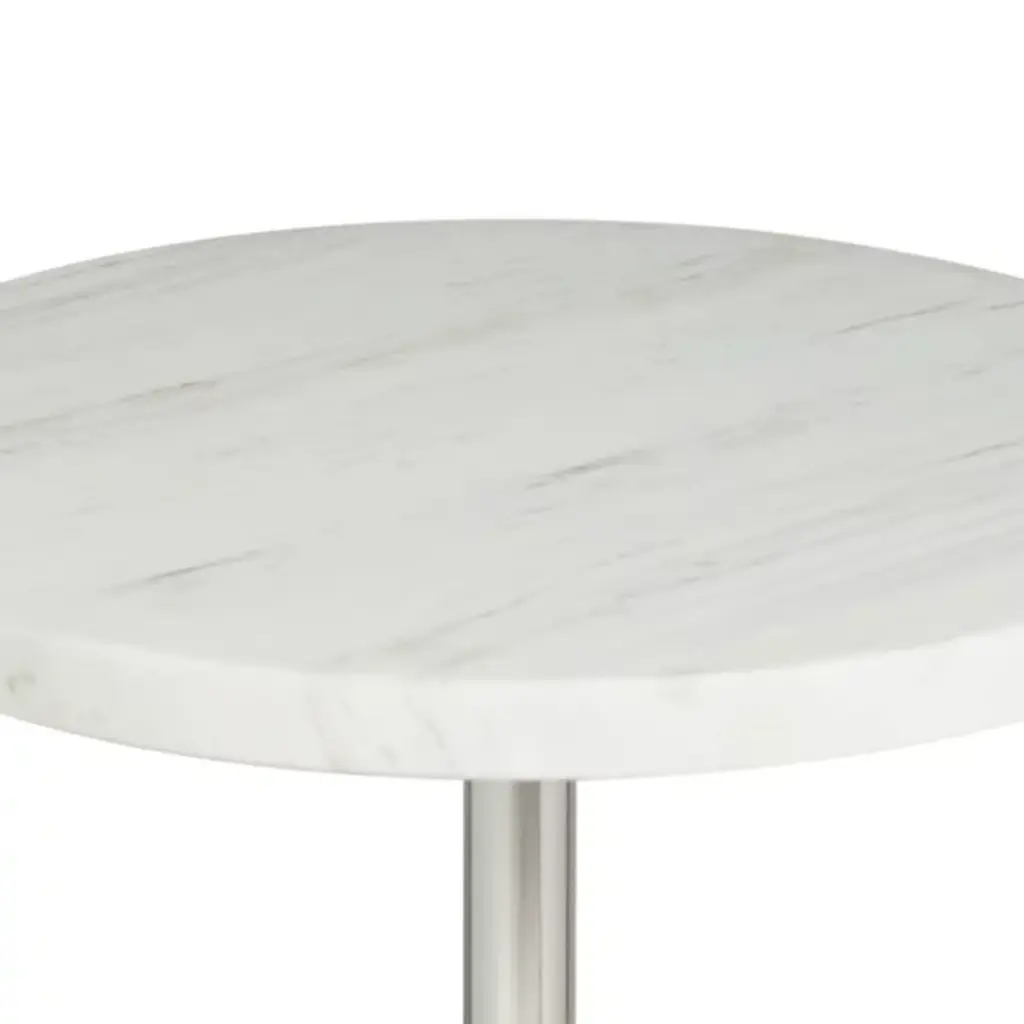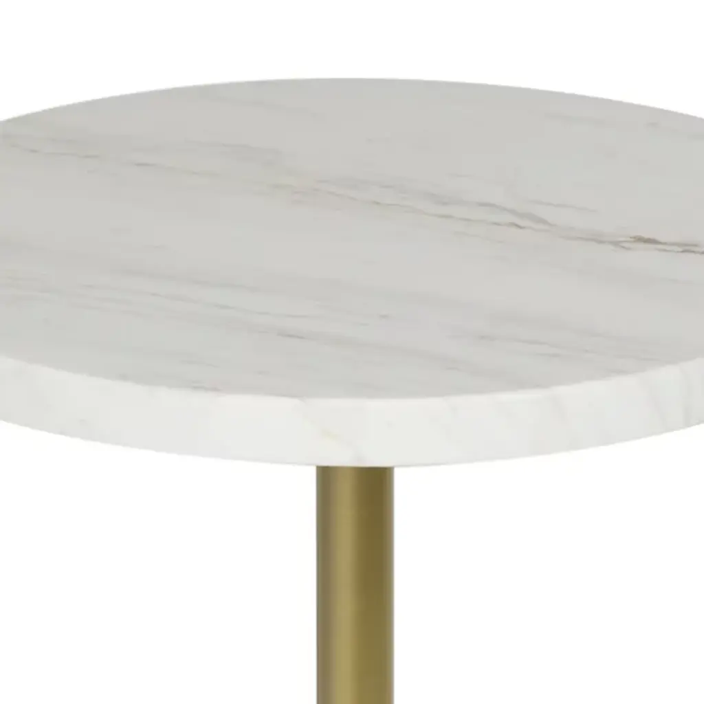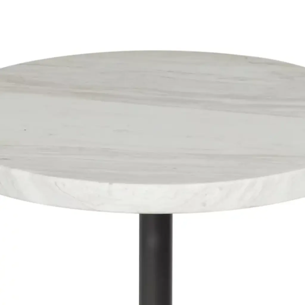 The Arthur Accent Table from Regina Andrew combines a round marble surface with a goblet-shaped steel pedestal base. The natural stone top brings genuine texture and unique veining patterns that make each piece one-of-a-kind, while the curved metal support underneath provides stable, sculptural interest. This side table fills that perfect spot next to reading chairs or sofas where you need a reliable surface for books, drinks, or decorative objects. The proportions work well in smaller spaces where traditional four-legged tables might feel too heavy or crowded.