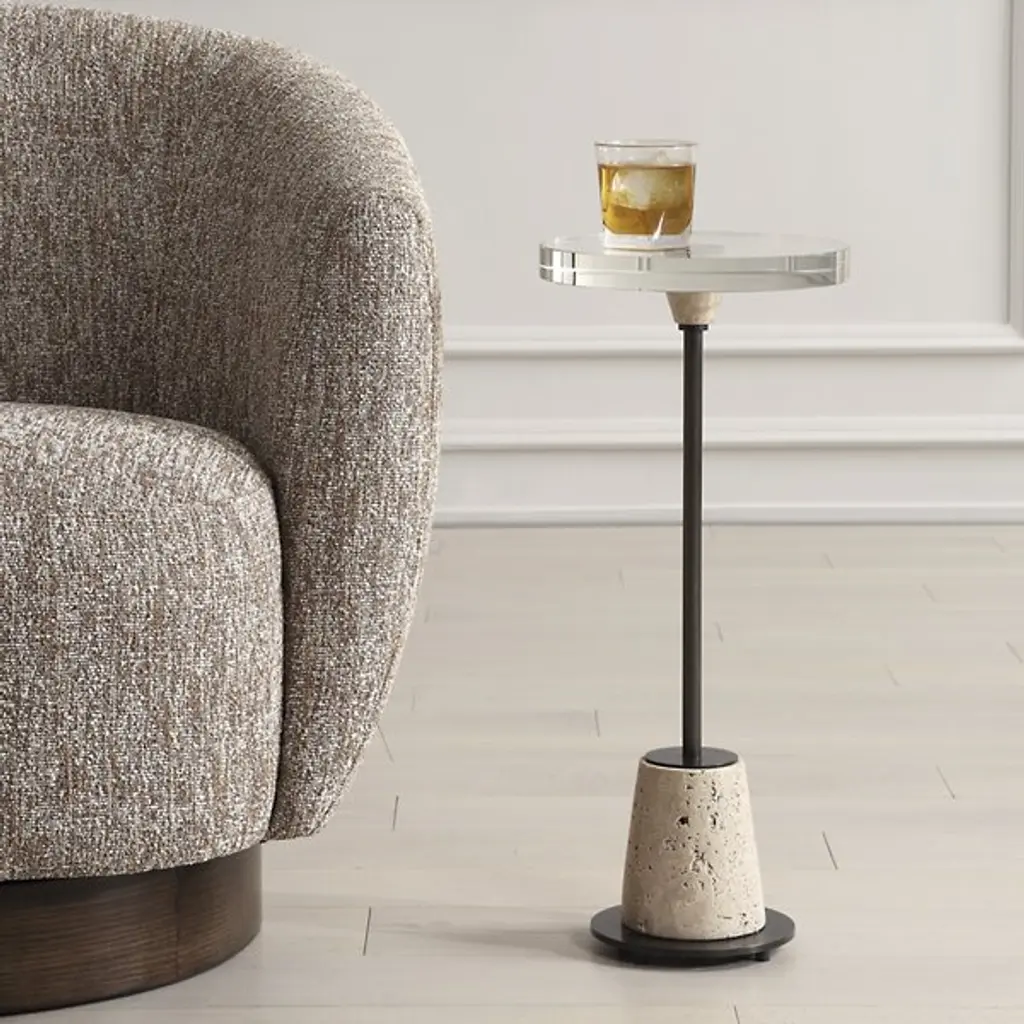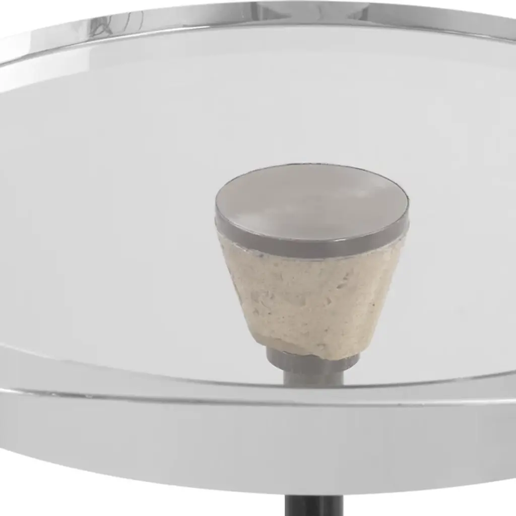 The Arthur Drink Table from Uttermost, designed by John Kowalski, brings together three distinct materials in perfect harmony. The crystal surface appears to float above its natural stone section, while the metal framework provides a strong foundation. Each material complements the others, creating a table that makes a statement through its thoughtful design rather than unnecessary ornamentation. The table’s proportions work together to create a piece that holds its own in any setting while maintaining its primary function as a practical surface for drinks and décor.