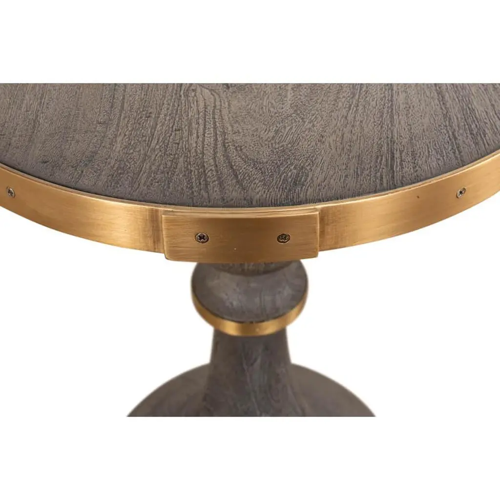 A true conversation starter with its unique 'wine goblet' silhouette and contrasting textures. The table's base, with its bulbous form and intricate wood grain, is finished in a deep, rich tone that highlights the natural beauty of the wood.A slender neck adorned with a subtle gold band leads up to the top, where a delicate, brass-edged circular surface offers just enough space for your evening drink or a treasured ornament.This table marries the rustic charm of handcrafted woodwork with a touch of opulence, making it a versatile addition to any room needing a splash of intrigue and artistry.Dimensions: 16" W x 16" D x 24" H