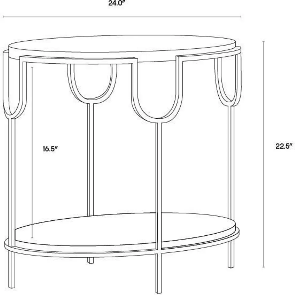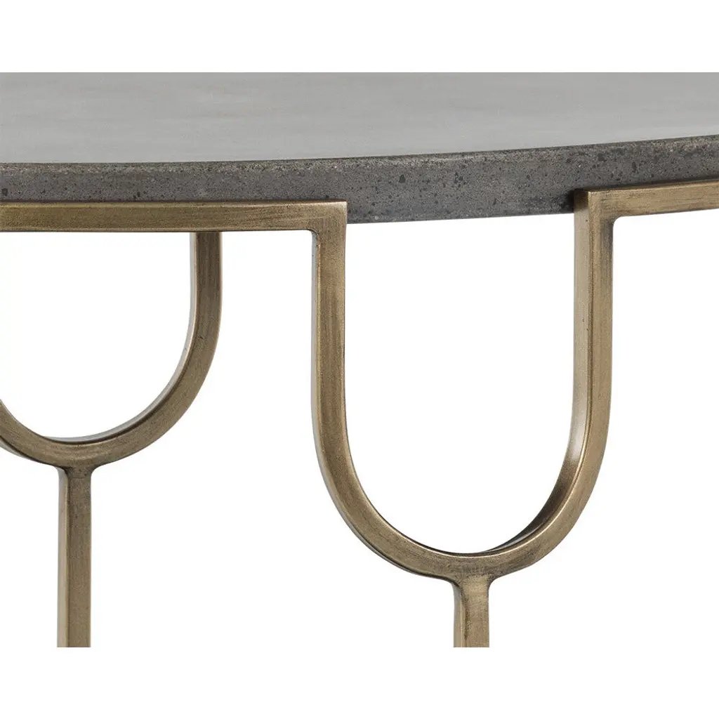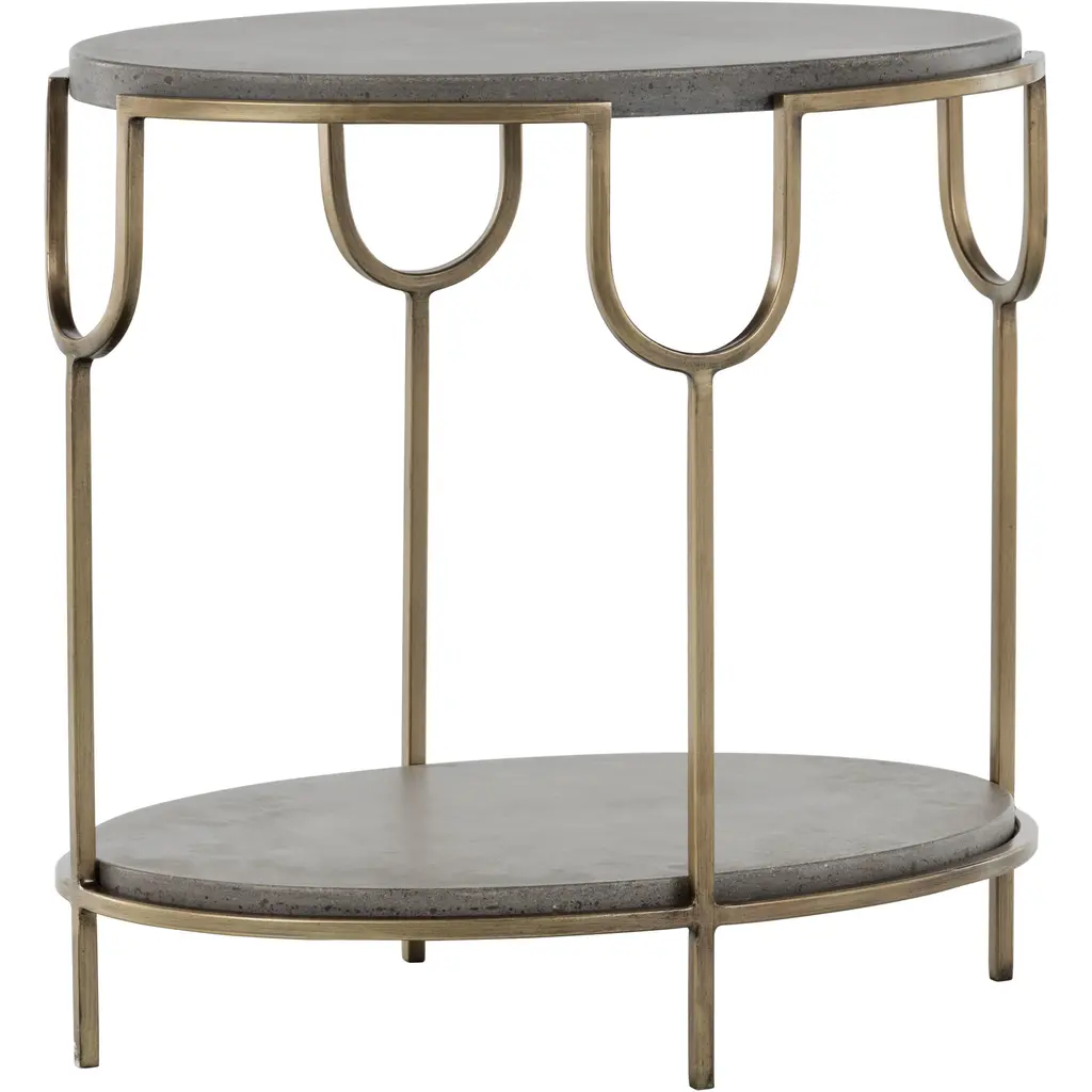 This oval shaped end table features a beautifully structured antique brass iron frame with a concrete top and shelf. A dramatic yet refined contemporary piece. Crafted from a natural concrete mix, each piece will look different. Variations in colour, texture, imperfections, surface scratches and non-structural hairline cracks are considered inherent and valued qualities of the material.