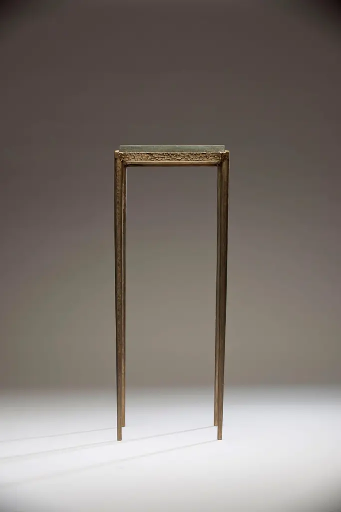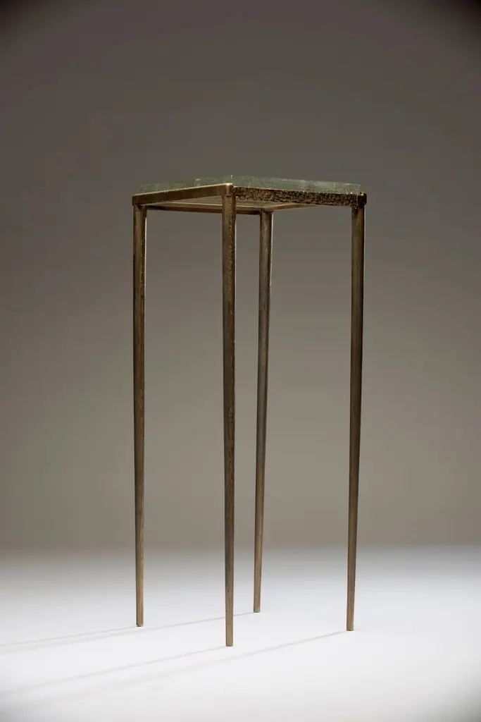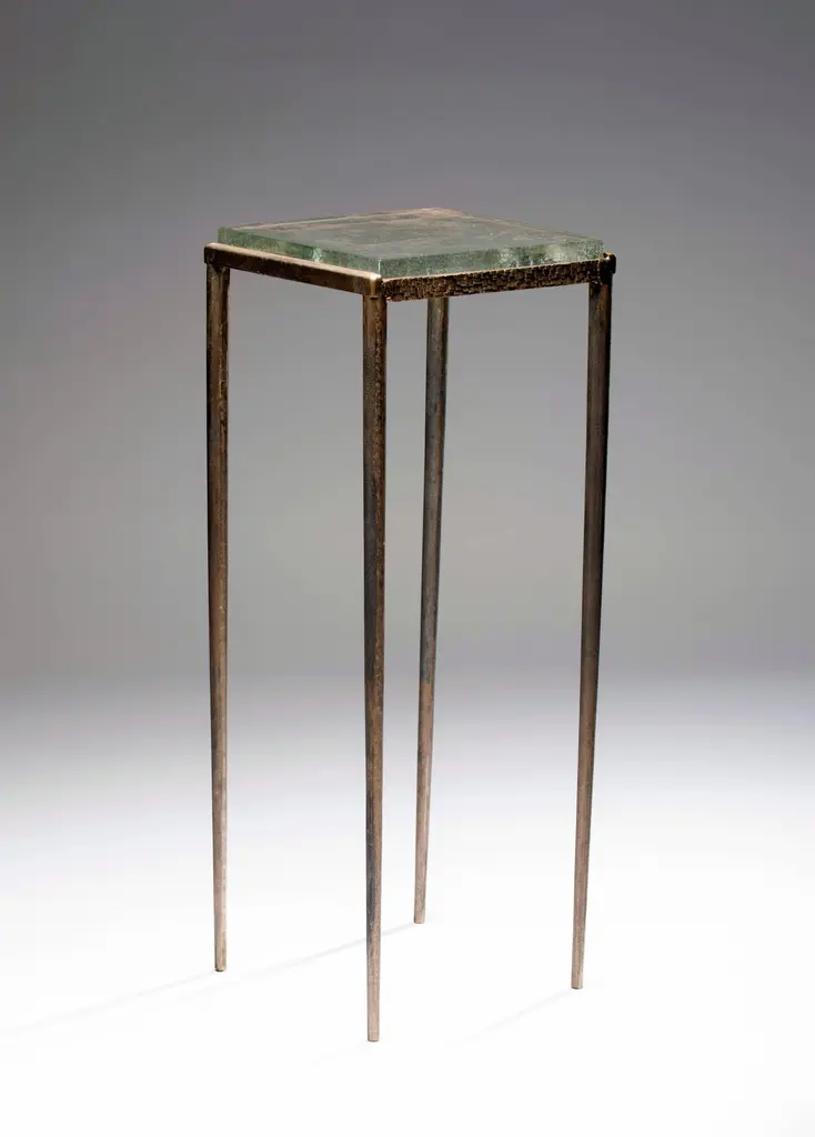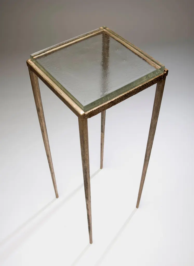 Cast Glass is a timeless material that is celebrated here with the Artists "Ash Side Table" These Cast bronze tables are made to order by the Artist in their 18th century Foundry. The Hand Cast Glass top is a beautiful 1" thick casting in American Crystal. Custom configurations into sections, Longer tables, and nesting tables are all Options. Please contact us about your custom sizes and features, and of course we can also accommodate any custom patination including a high polish, or even a Nickel Silver cast version!