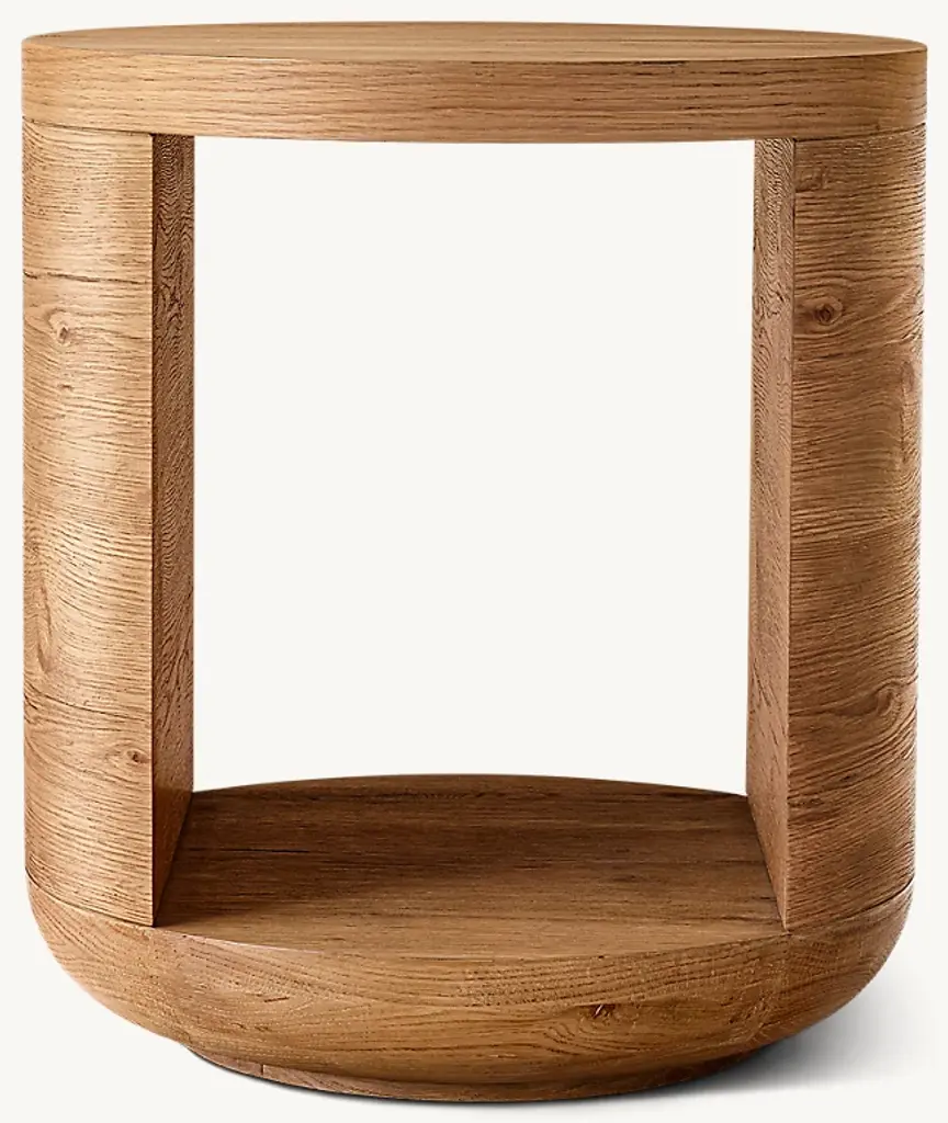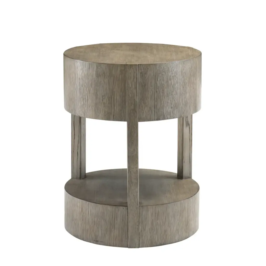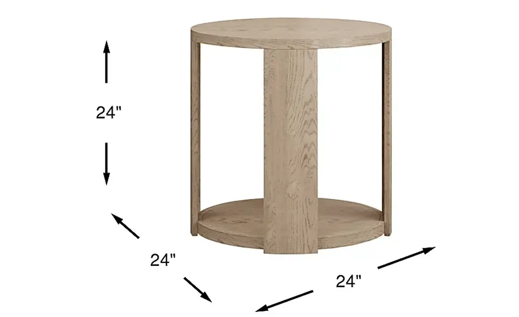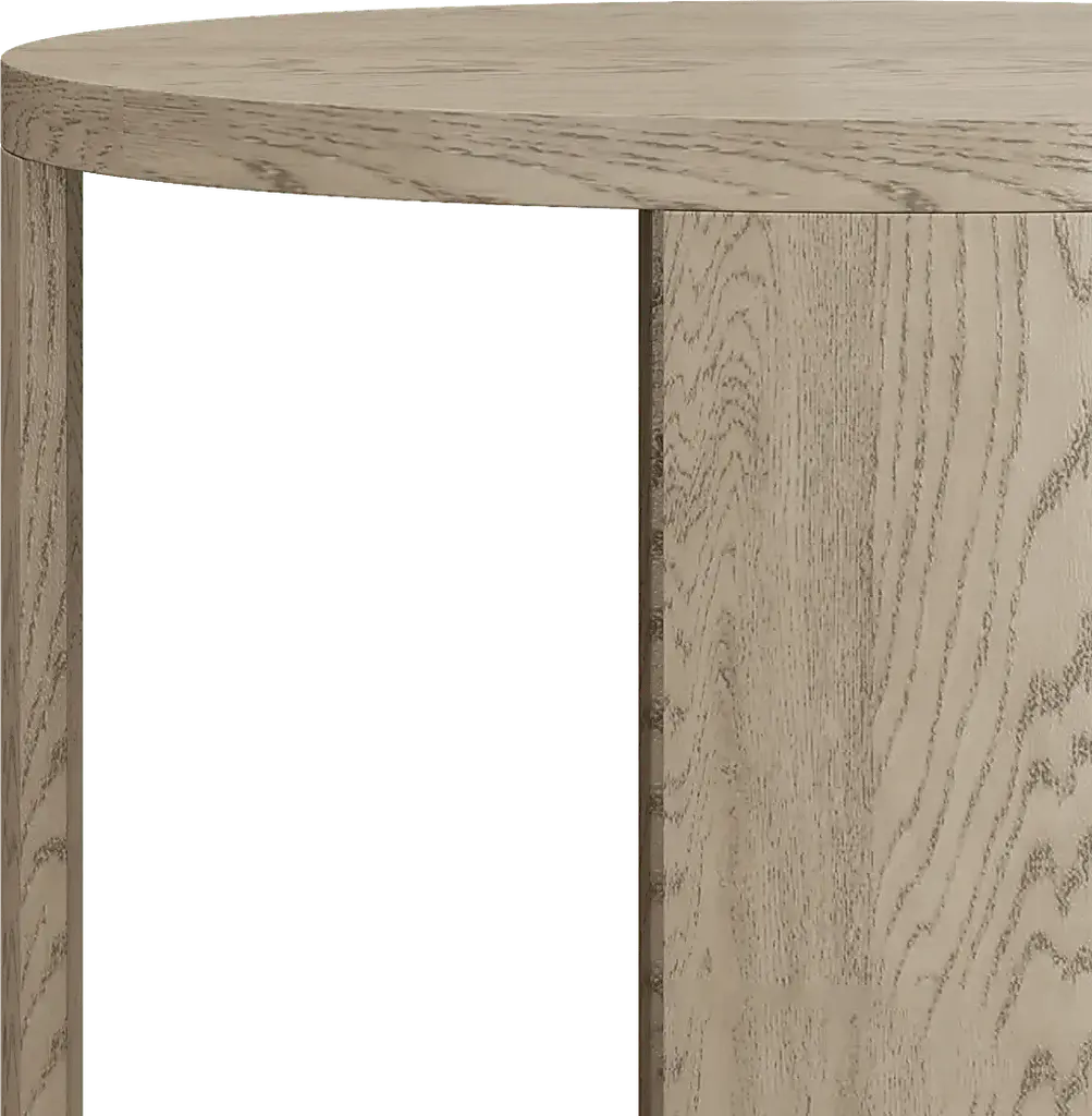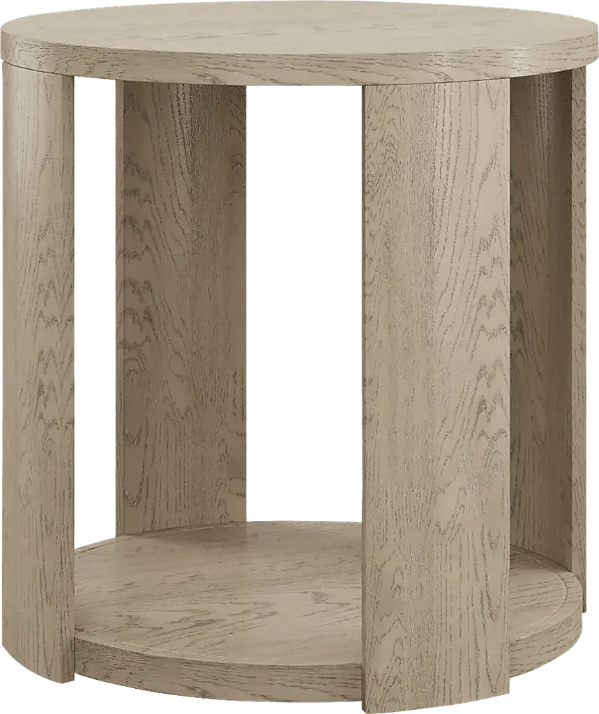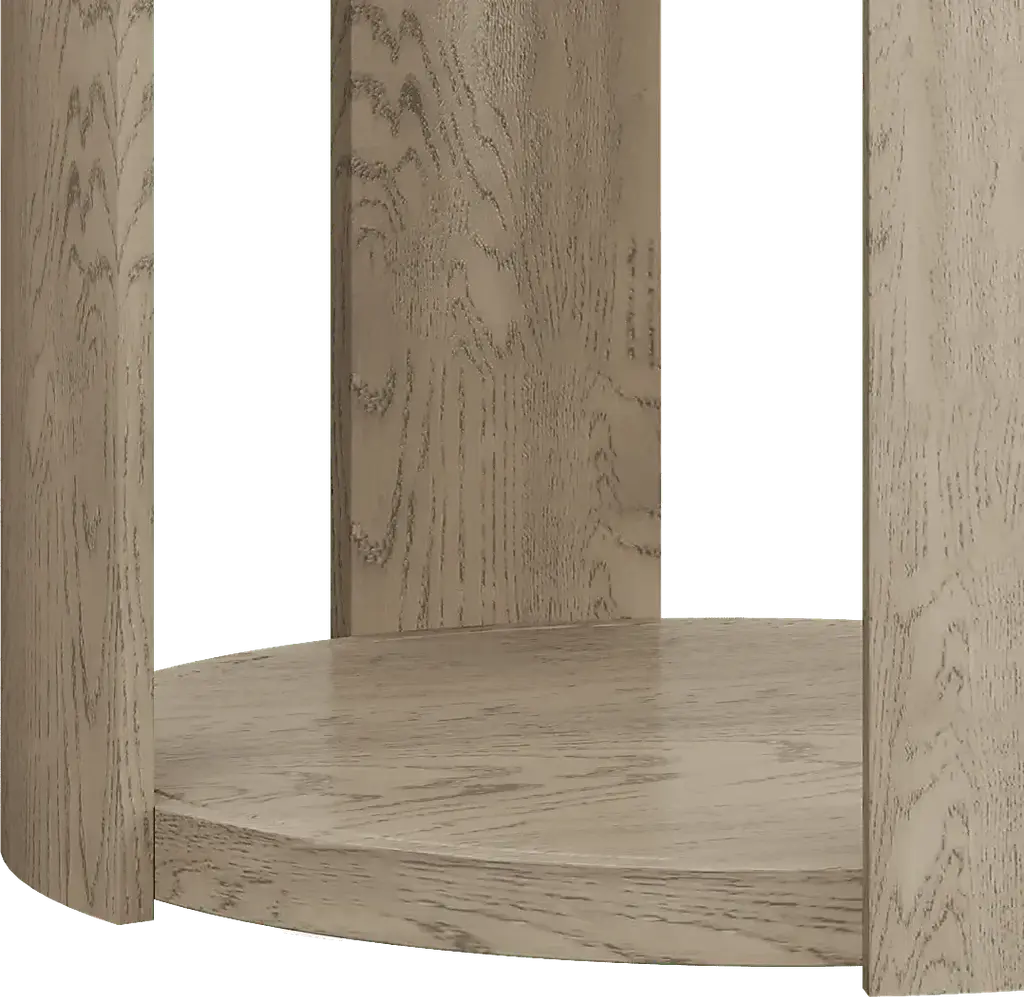 Timeless yet versatile with a transitional look that brings warmth and ease into your home, the Aspen Grove end table features clean lines and a soft tan finish that highlight the piece's oak veneers. A lower shelf adds both balance and utility, while the round, free-formed design delivers a sublime look that complements a wide array of living room styles.