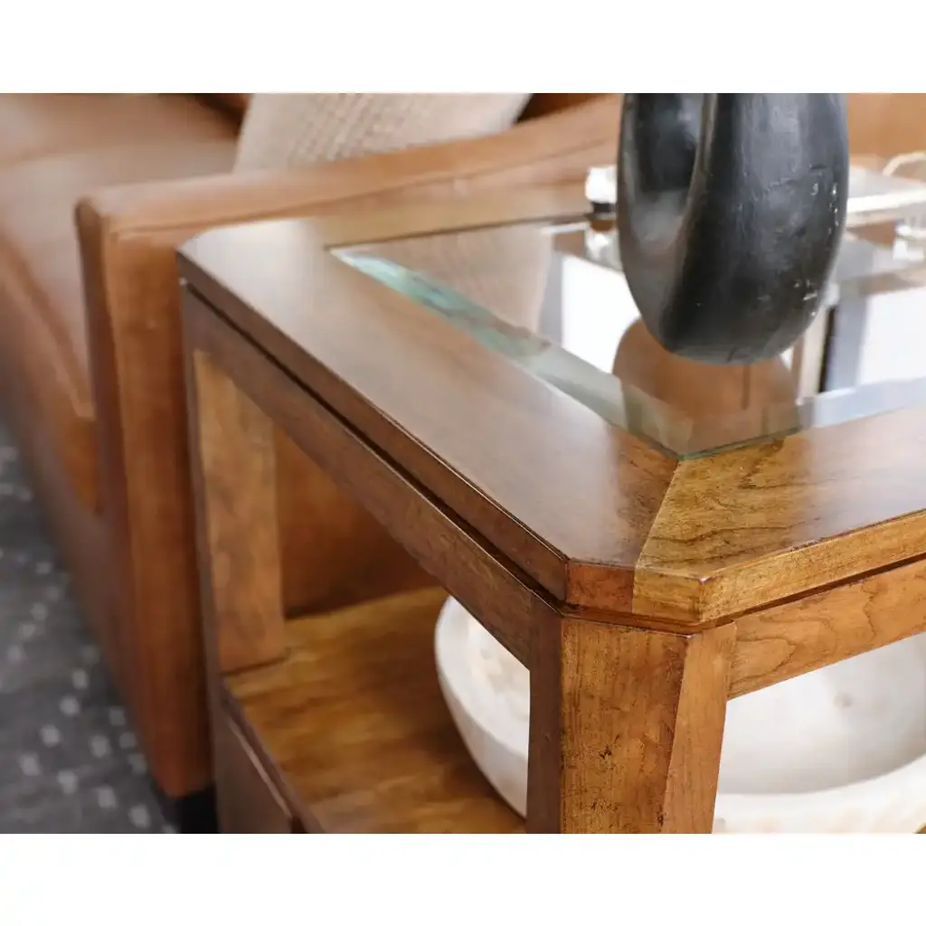The Clarity Drawer End Table from the Aspire Collection embodies refined elegance through its solid cherry construction and thoughtful design. The signature profile posts that give the collection its name frame this sophisticated piece, showcasing the wood's natural beauty. A sleek beveled glass top crowns the table, while a full-depth drawer and convenient shelf beneath offer practical storage solutions. The clean, transitional style is enhanced by framed solid wood end-panels and custom inset hardware, creating an enduring piece that seamlessly blends timeless craftsmanship with modern functionality. Perfect as an accent piece, this end table brings both grace and purpose to any room setting.