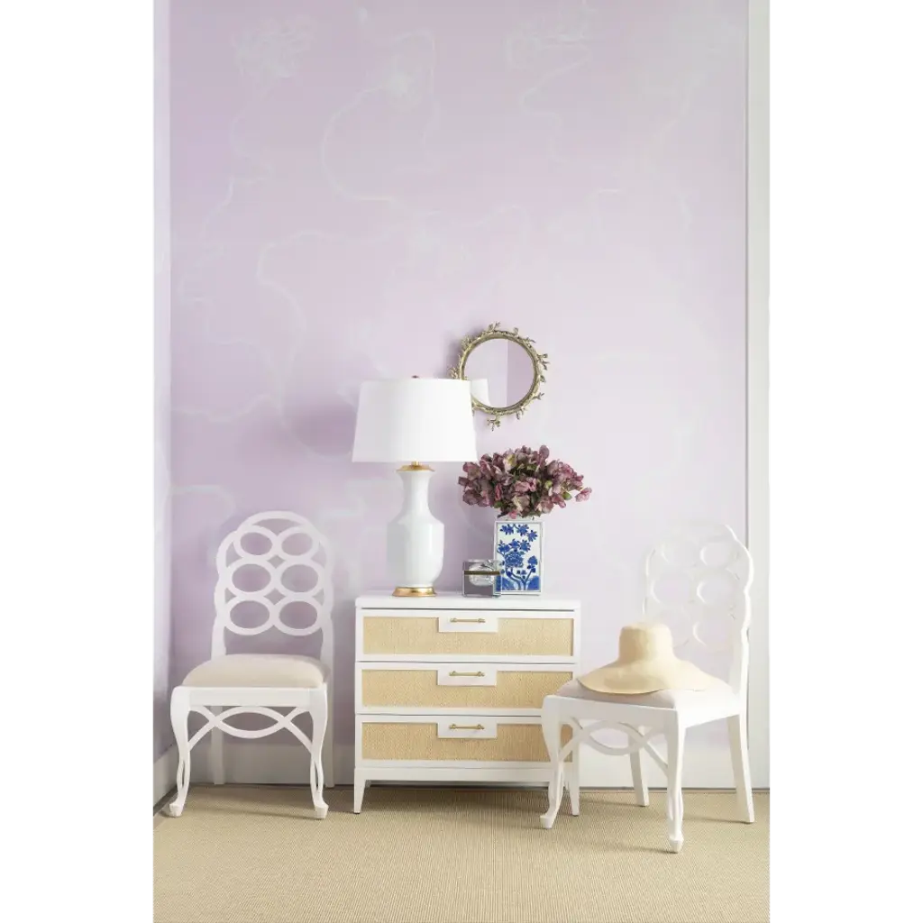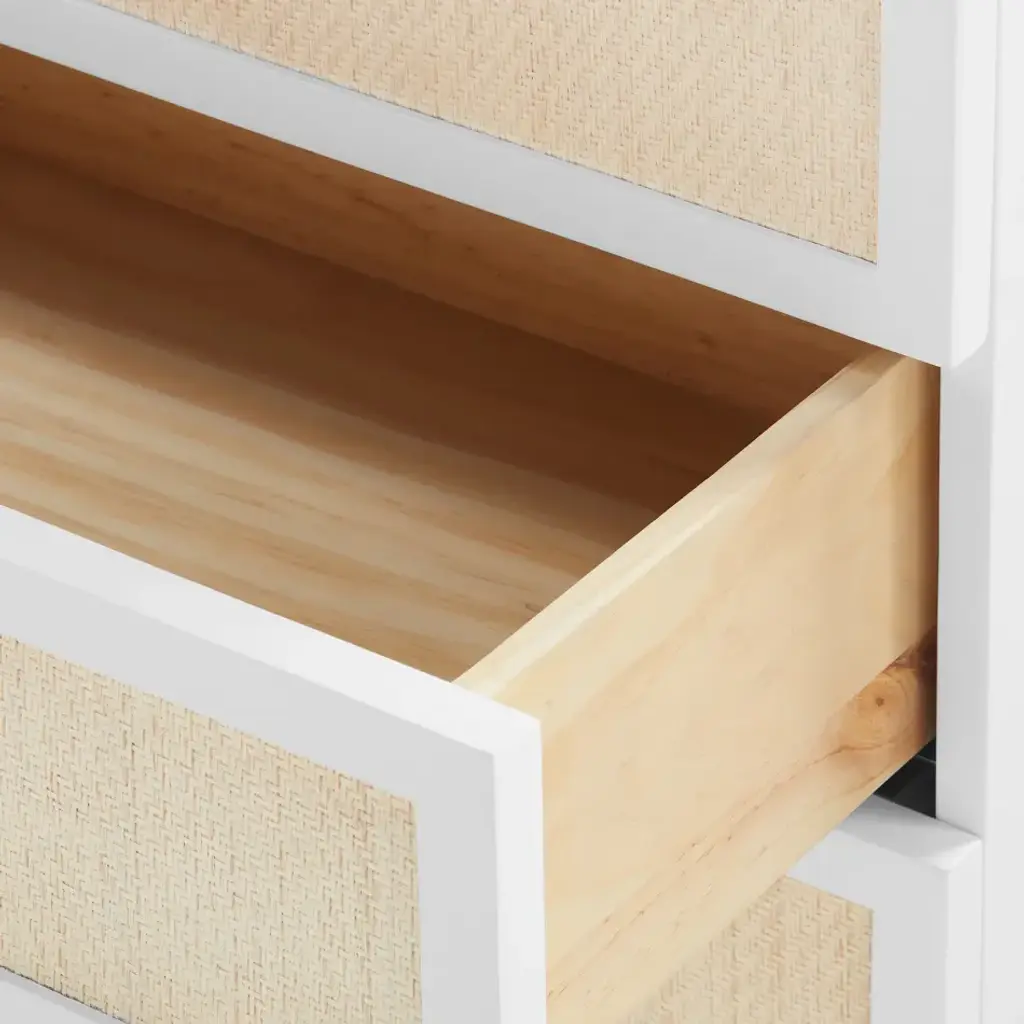 "Modern minimalism meets Eastern romance in our Astor Collection, inspired by the elegance of Chinoiserie design. The Astor 3-Drawer Side Table, available in a rich black or white lacquer, features panels of finely-woven grasscloth which add a natural element. Its three soft-closing drawers of veneered wood boast custom brass pulls as the perfect finishing touch, securing its status as a chic and sumptuous piece of work. Add to a study, living room, bedroom or hall with worldly ambitions.
