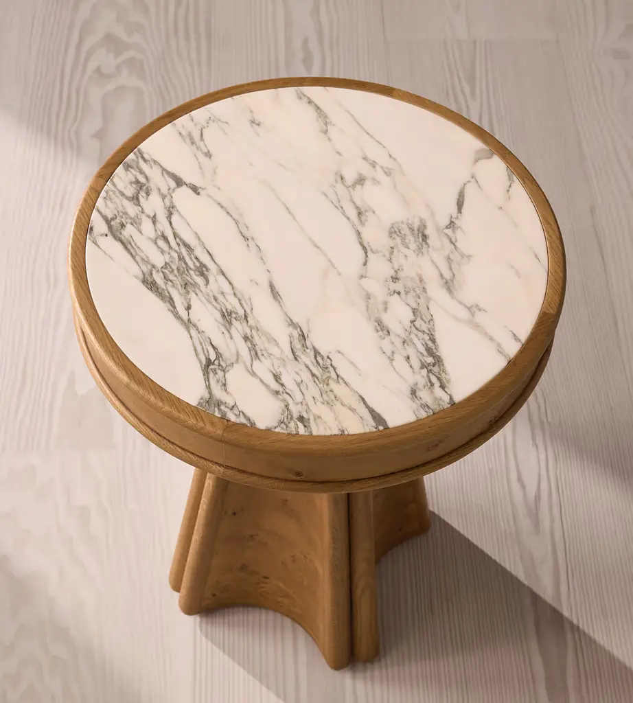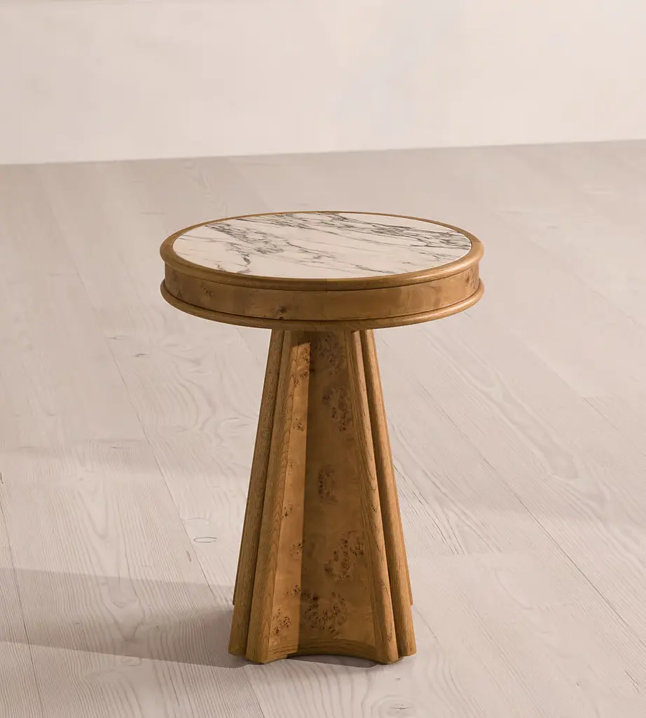 A solid oak and mappa burl frame supports a circular, honed Arabescato marble top. The circular Arabescato marble top of the Astoria side table rests within a solid oak and mappa burl frame, creating a striking contrast. This sits atop a tapered, concave base to give the piece a sculptural finish.