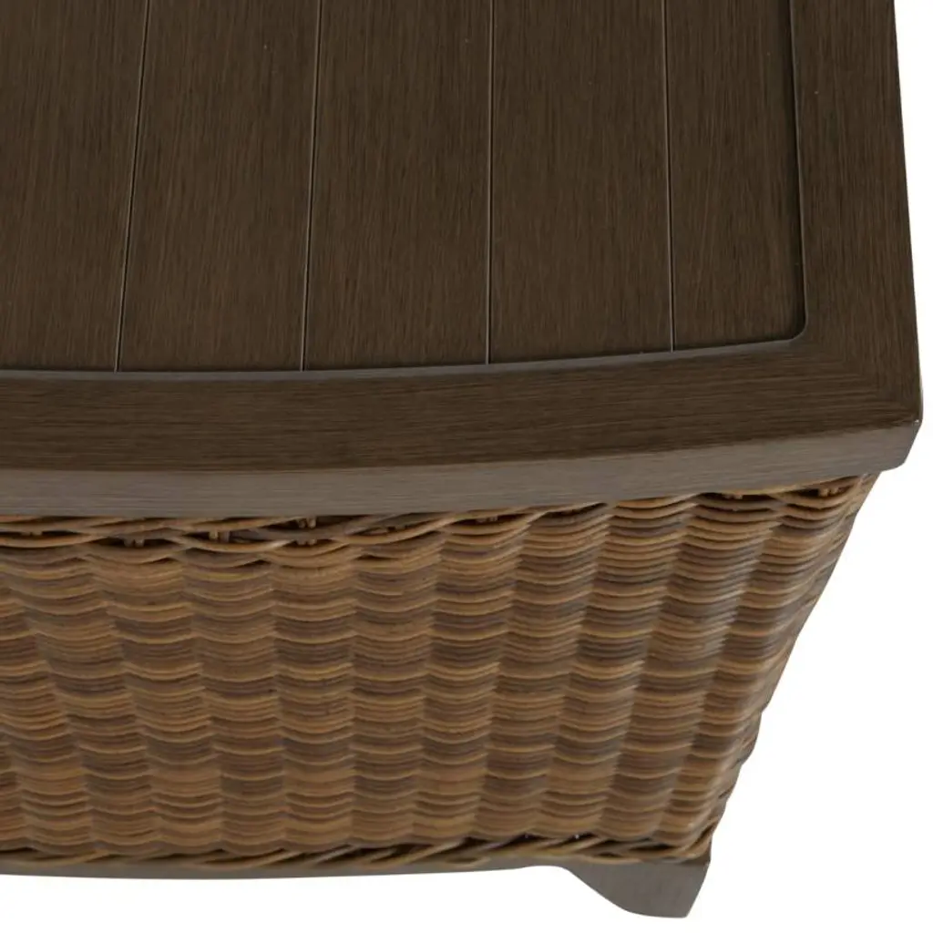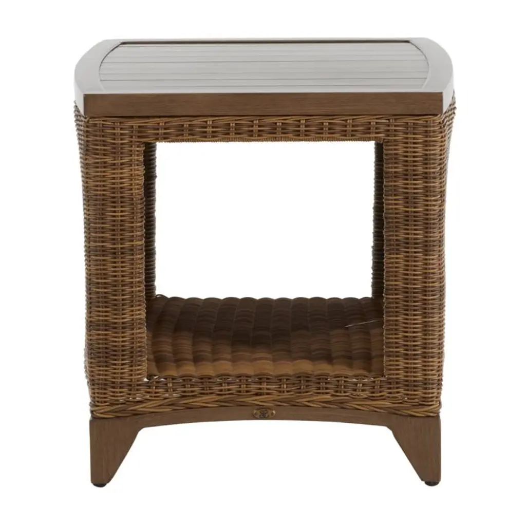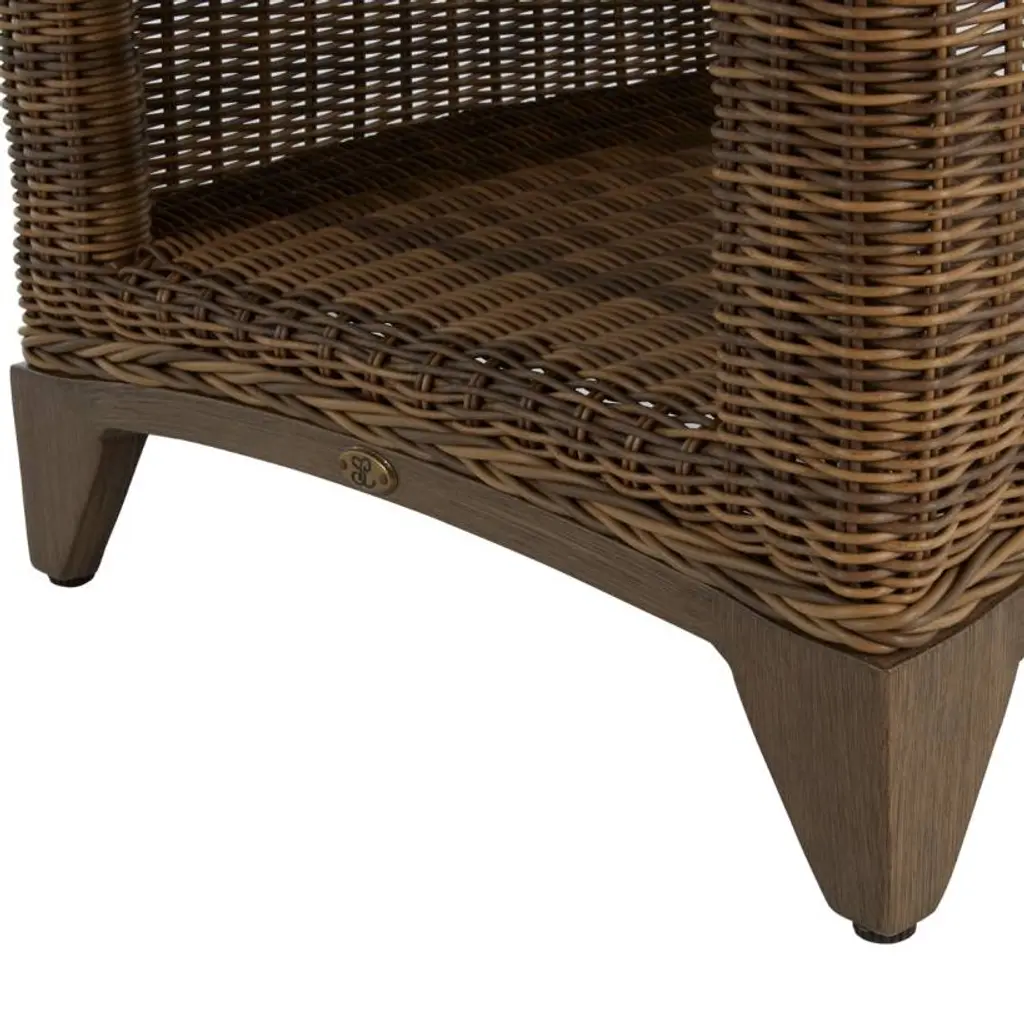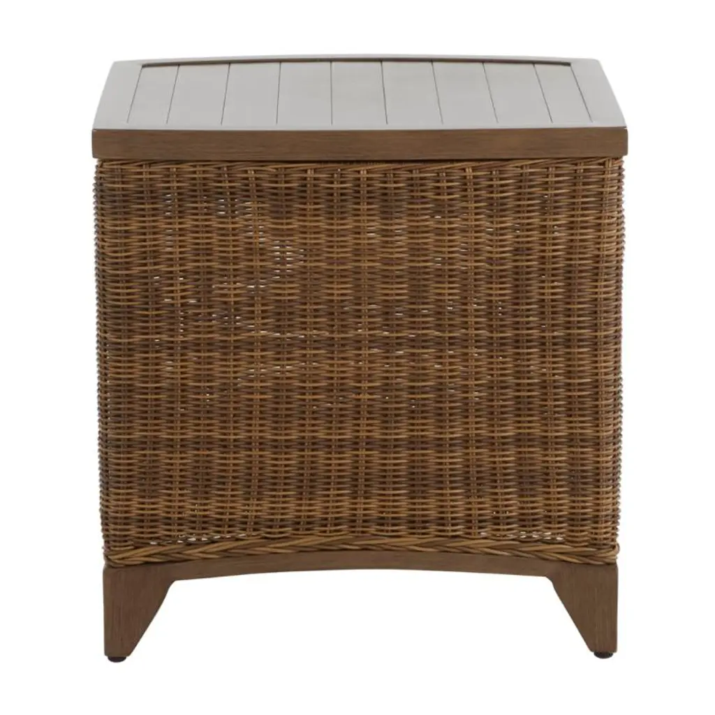 The Astoria End Table is a Parsons-style outdoor accent table with a convenient storage shelf. The subtly curved aluminum top is complemented by the woven resin wicker base and is designed to endure the outdoor elements for long-lasting beauty and enjoyment.