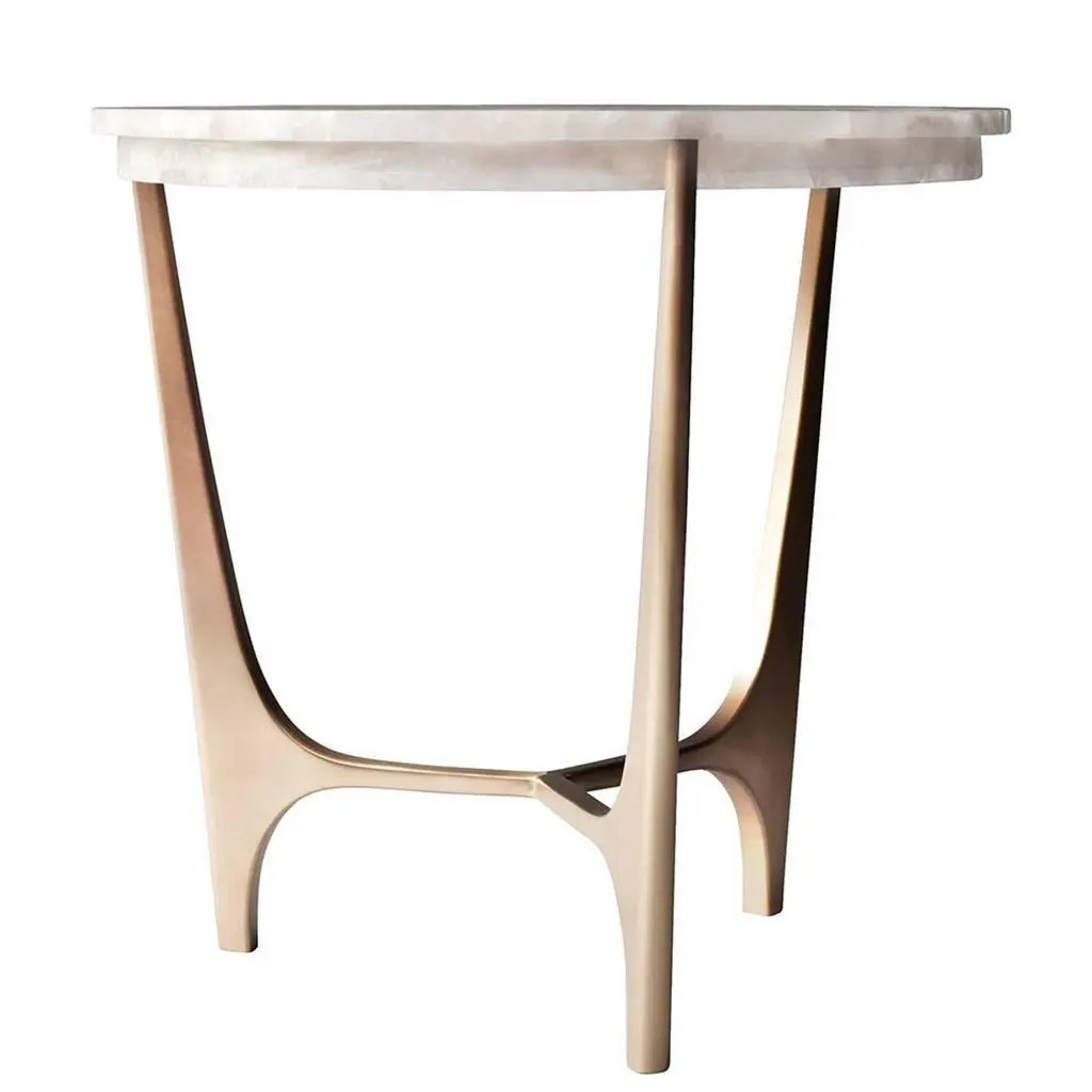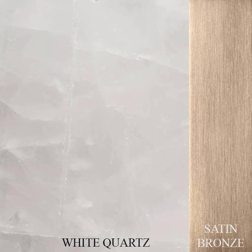 The Athena side or end table by DeMuro Das has a circular top in White Quartz supported by a sculptural, hand-cast solid Bronze base. The White Quartz has a semi-translucent quality that highlights the subtle variations of color within the stone.