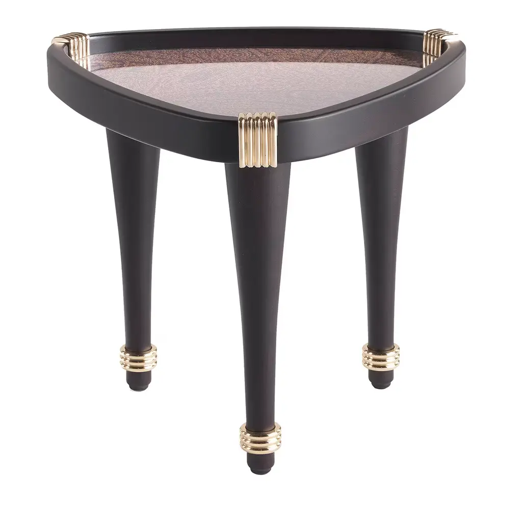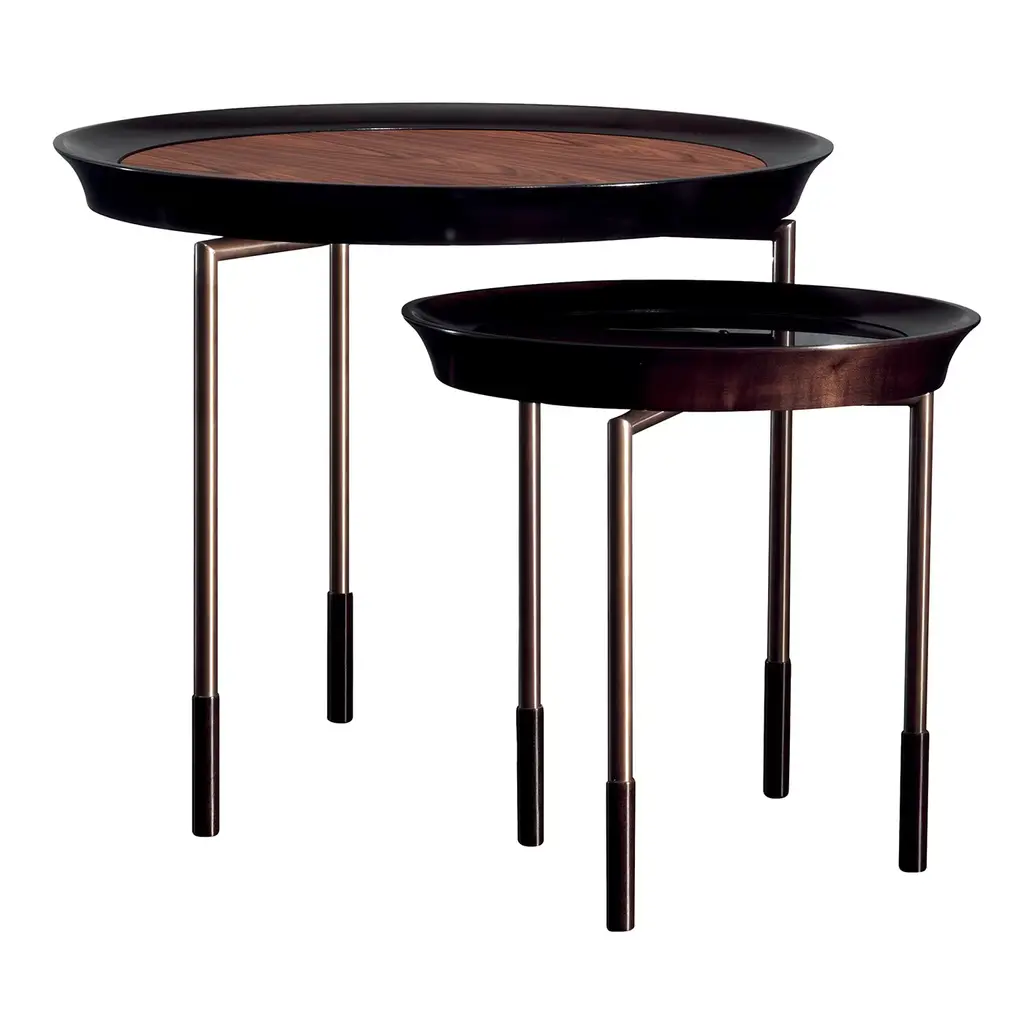 The Athene side tables are a series of sleek and elegant designs of timeless sophistication. Displaying a round top enriched with a polished Pau-ferro wood insert and tall edges handmade of polished solid maple, it rests on bronze-lacquered metal, finished with a satin, protective varnish. The feet are in polished solid maple. Please refer to the Concierge for questions on available sizes and customizations.