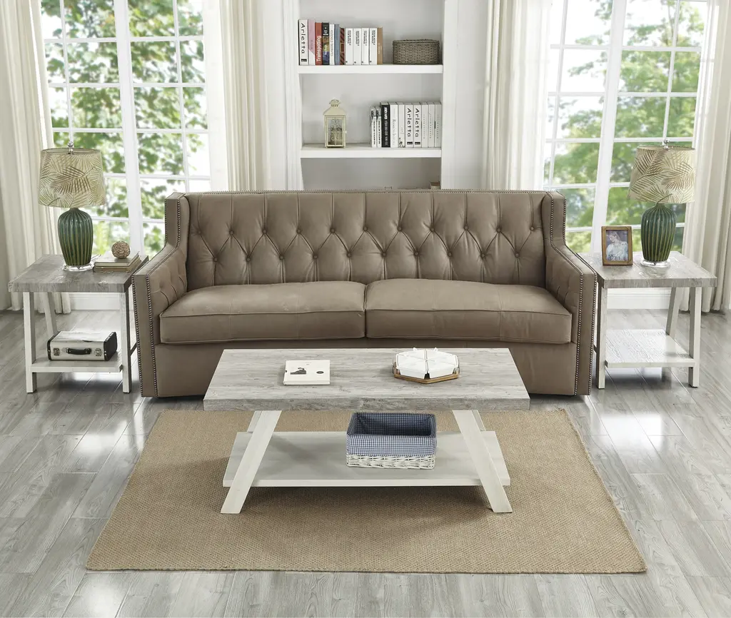 The set includes a coffee table and two end tables, features an overextended rectangular top and a splayed-leg look; A shelf underneath the table top provides extra storage space; Crafted of particle board with vinyl finish; Some assembly required.