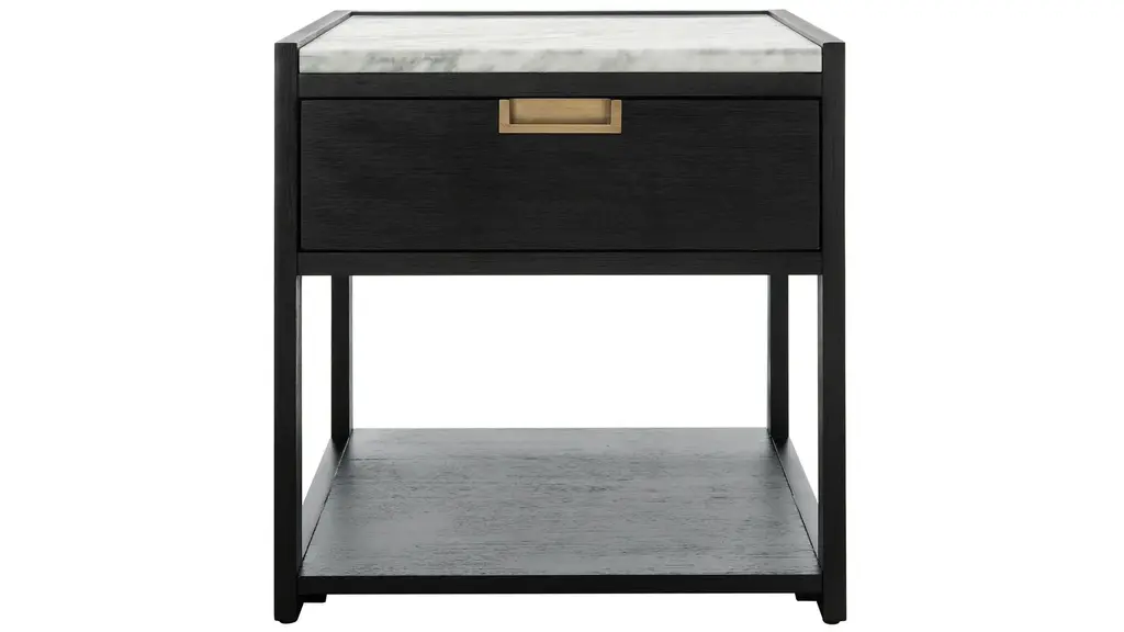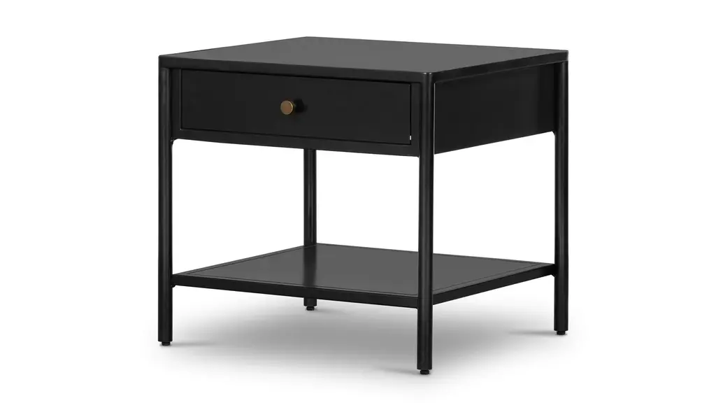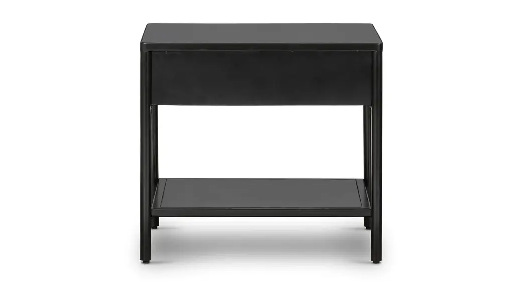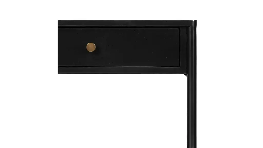Work a softened industrial look into the bedroom with a simple black-finished iron console table featuring bronzed iron hardware for modernity. A single drawers and open lower shelving bring bonus storage to the bedside. Made in Vietnam.