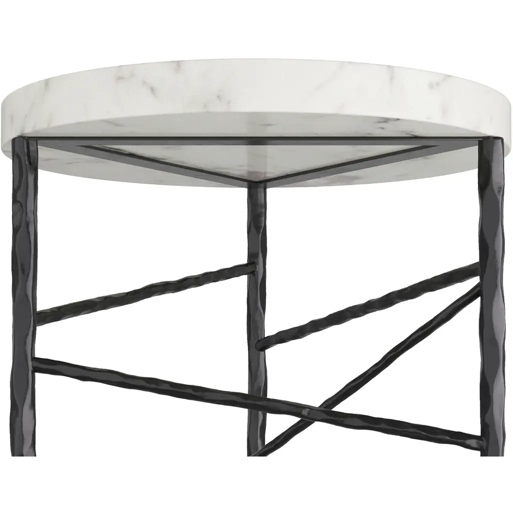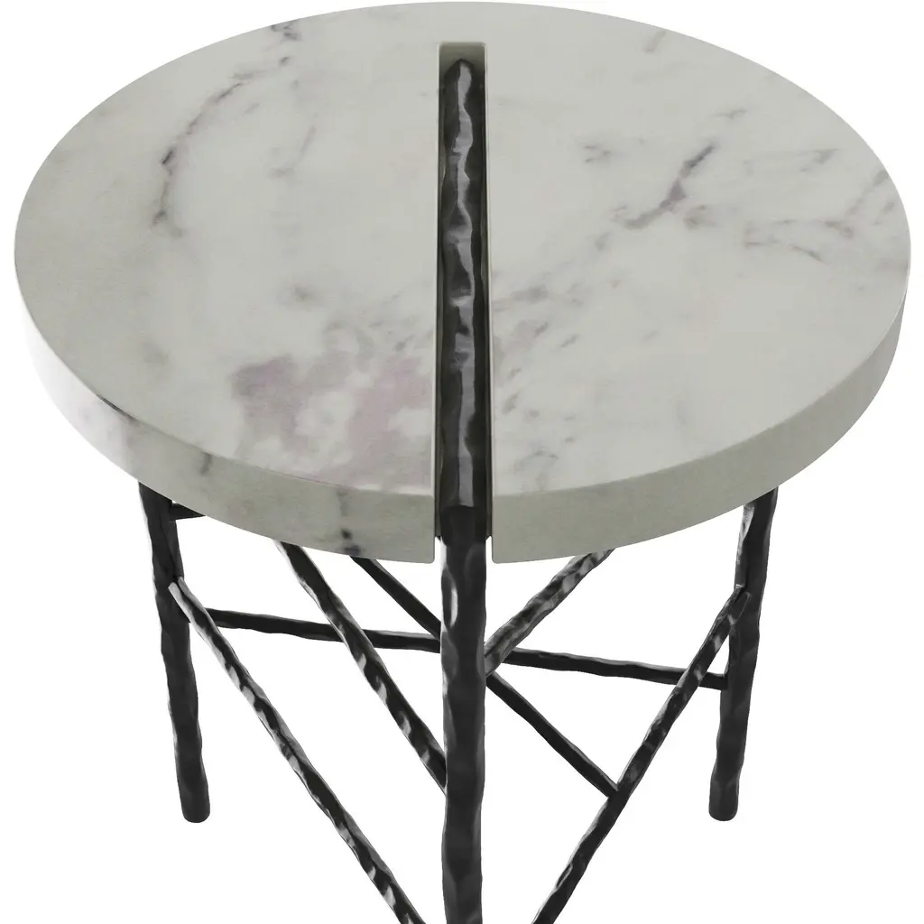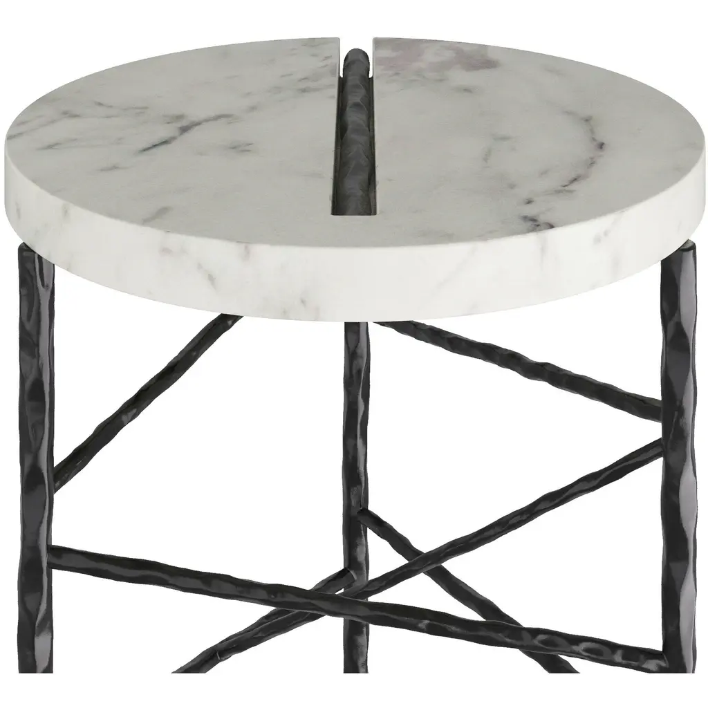 When simple forms meet luxe materials, the result is our elegant Atlas. Intersected by a bar of forged iron, a cool circle of white marble balances on a trio of blackened iron legs. Intersecting accents of iron reminiscent of wrapped string zig and zag playfully about the base.?Marble will vary.