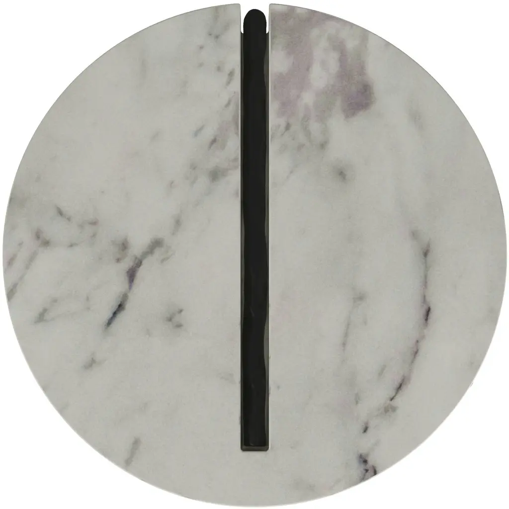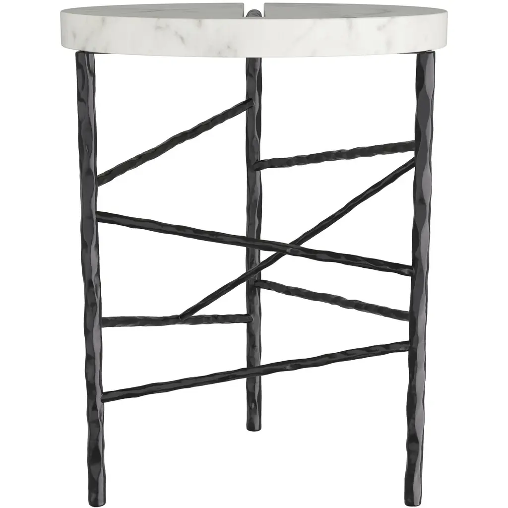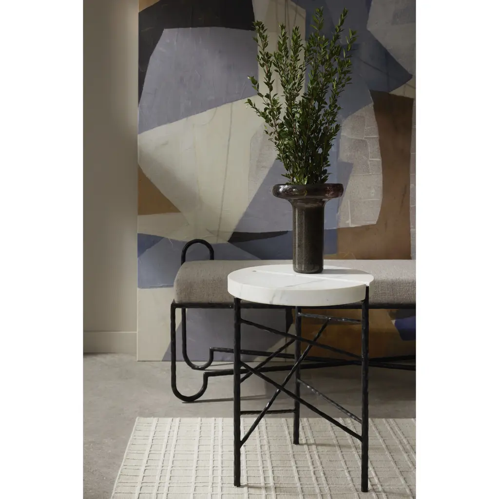 When simple forms meet luxe materials, the result is our elegant Atlas. Intersected by a bar of forged iron, a cool circle of white marble balances on a trio of blackened iron legs. Intersecting accents of iron reminiscent of wrapped string zig and zag playfully about the base.?Marble will vary.