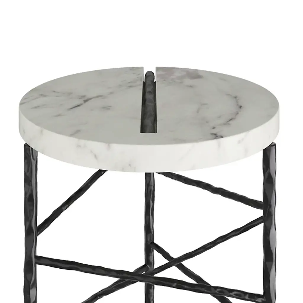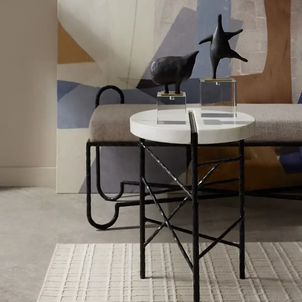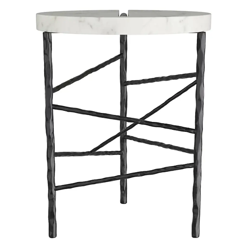 The Atlas Side Table from Arteriors transforms its surroundings with the inspired use of luxurious materials in a simple array. Forged vertical bars and slimmer horizontal crossbars are twisted and beaten into rustic shapes, setting a circular tabletop fashioned out of white marble atop it. The natural grain of the marble contrasts well with the intricate iron below the top, threading a single claw-like iron appendage into a central channel to offer a final element of contrast and retention.