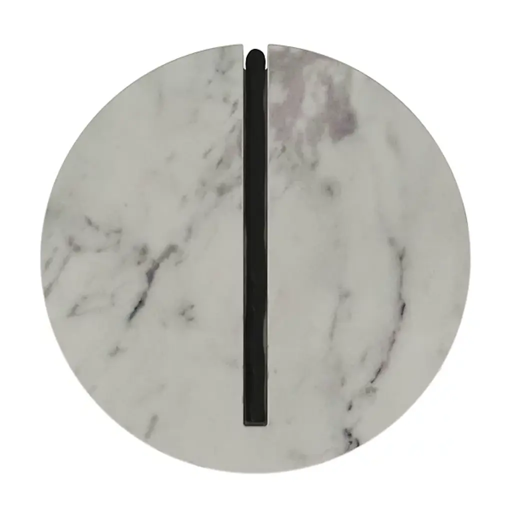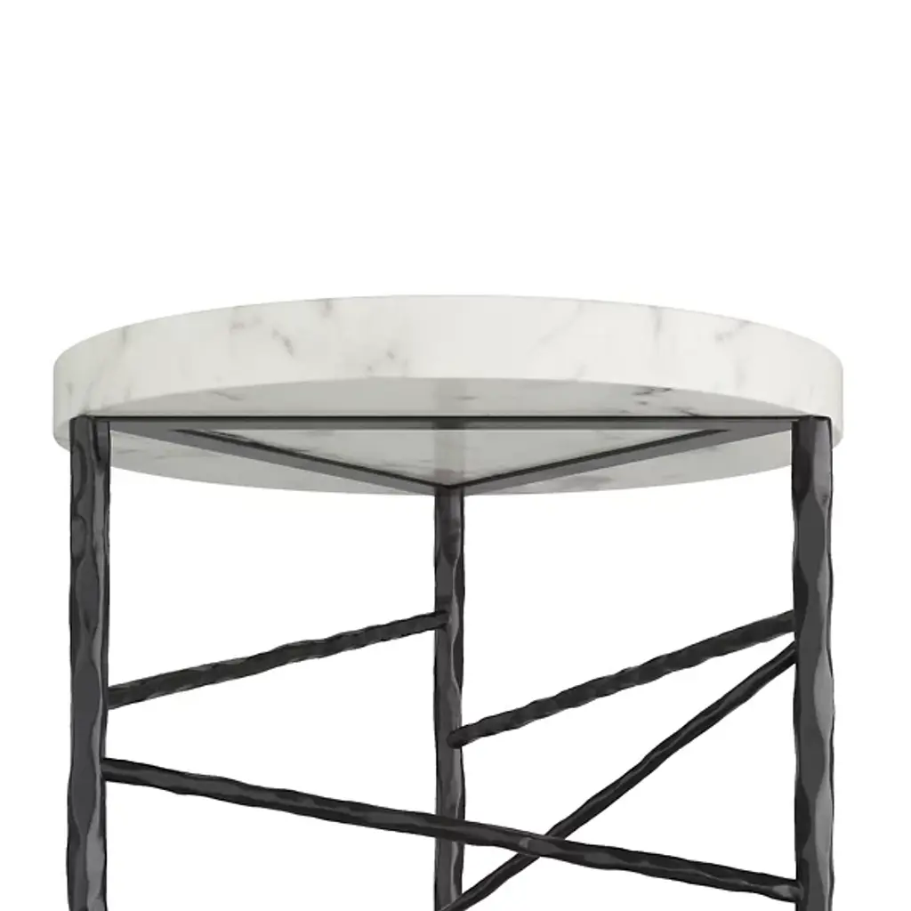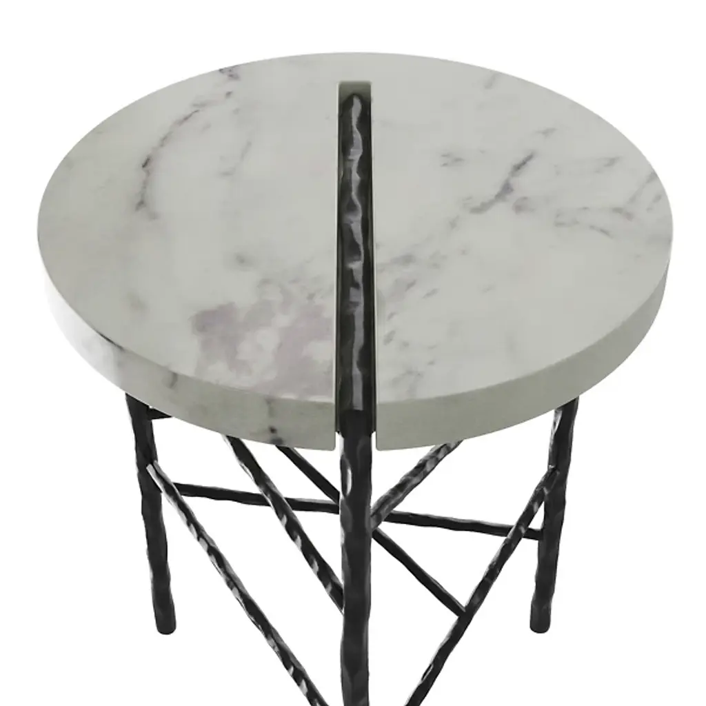 The Atlas Side Table from Arteriors transforms its surroundings with the inspired use of luxurious materials in a simple array. Forged vertical bars and slimmer horizontal crossbars are twisted and beaten into rustic shapes, setting a circular tabletop fashioned out of white marble atop it. The natural grain of the marble contrasts well with the intricate iron below the top, threading a single claw-like iron appendage into a central channel to offer a final element of contrast and retention.