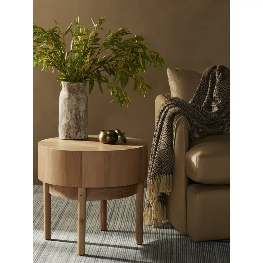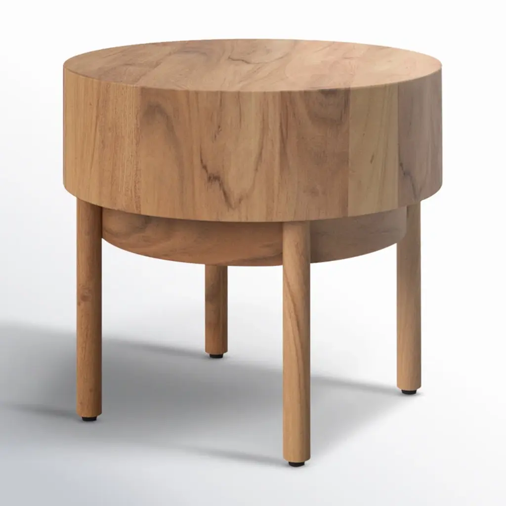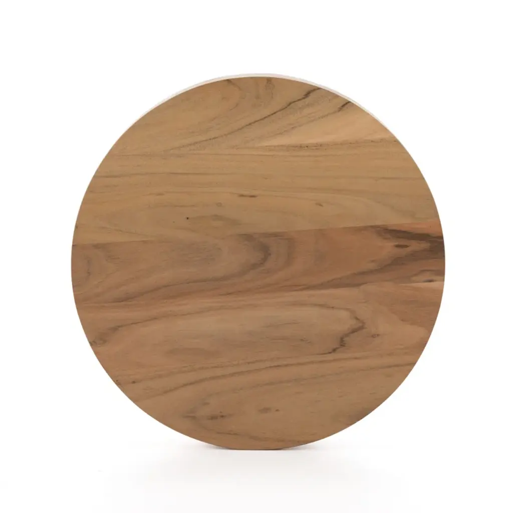 March to the beat of a drum-style table with nested dowel legs and solid acacia top.