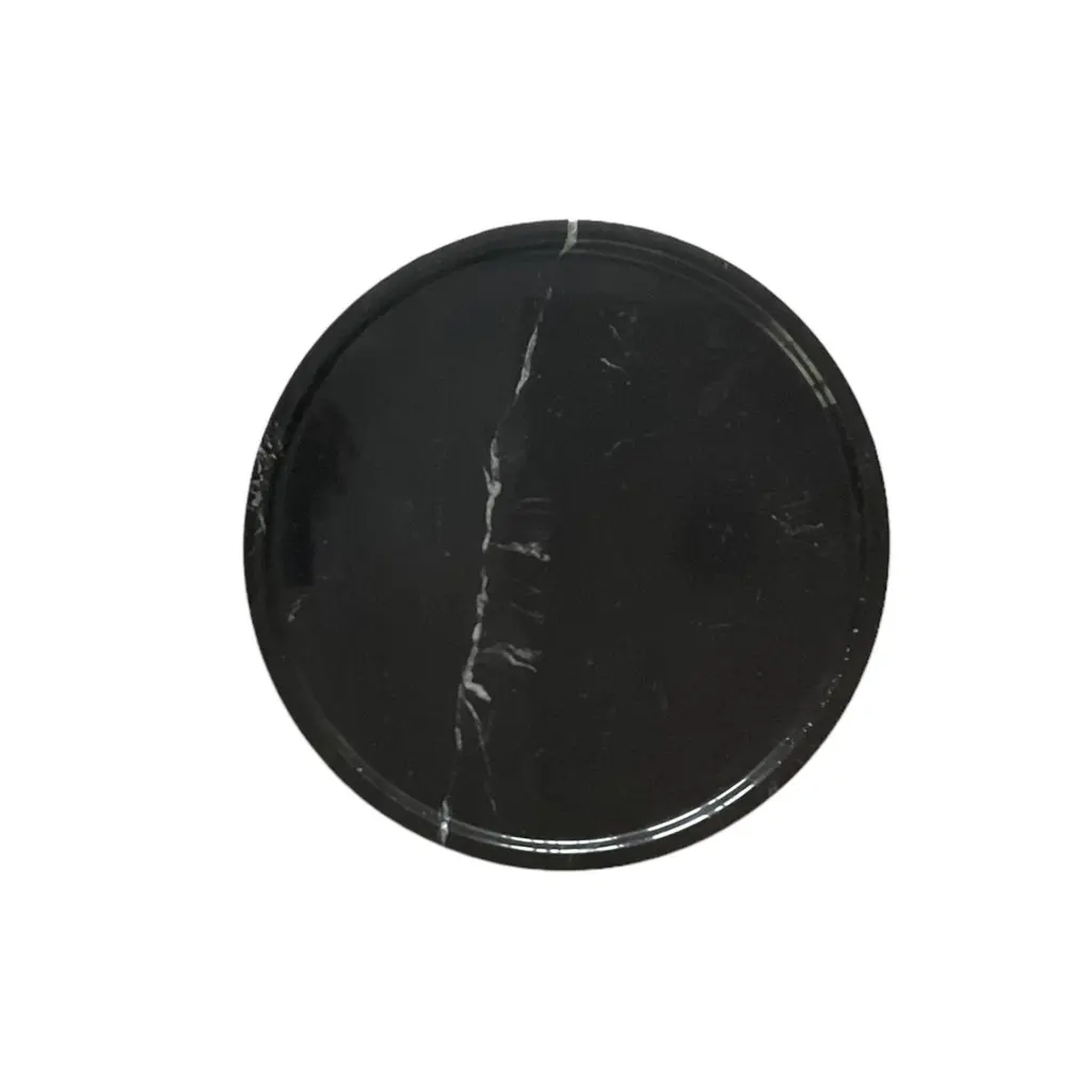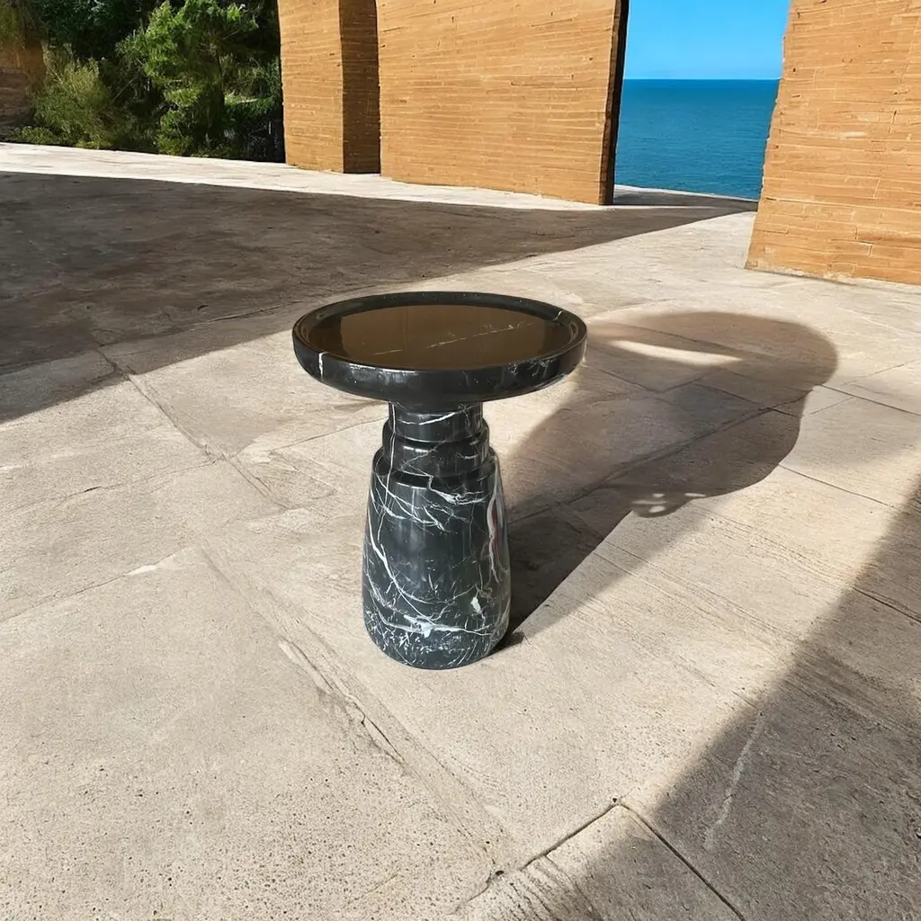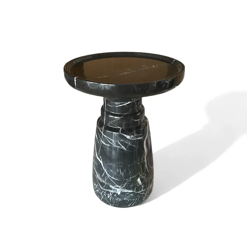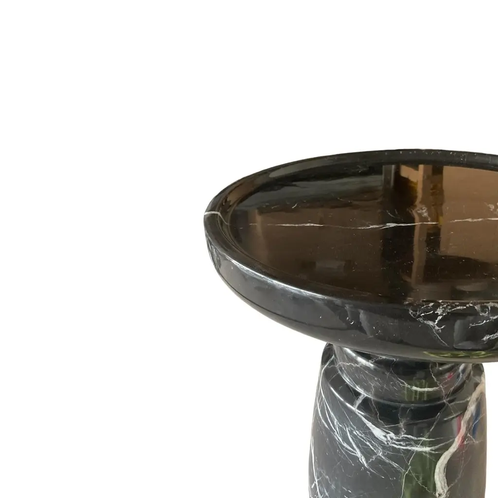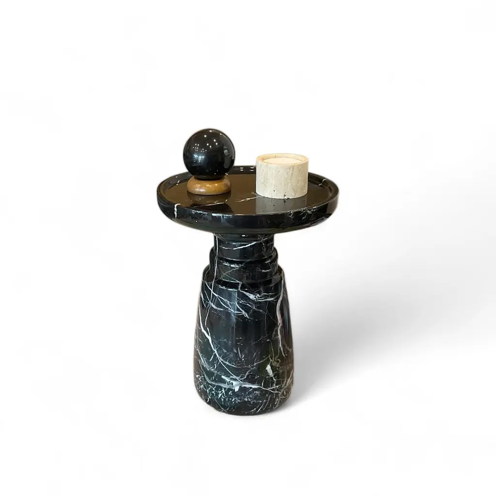 ‘Aurea’ Side Table by HAAND, crafted from premium black Nero Marquita marble stone. This exquisite piece measures 13.8 inches in diameter and 18.5 inches in height, with a substantial weight of 80 lbs.The Aurea Side Table is a testament to superior design and craftsmanship, embodying HAAND’s commitment to quality. Its polished finish and exceptionally smooth surface give it a luxurious feel—like touching velvet.Its sleek, modern silhouette and natural stone finish make it a versatile addition to any living space. While it functions beautifully as a side table, its versatility extends beyond this. Use it as:1.A Statement Piece: Place it in your living room to hold decorative items like vases, sculptures, or candles, enhancing your room’s aesthetic.2.A Nightstand: Its sturdy design makes it perfect for a bedroom nightstand, providing ample space for a lamp, books, and a glass of water.3.An Accent Table: Ideal for your office or hallway, where it can display art pieces, houseplants, or serve as a convenient spot for your keys and mail.4.A Plant Stand: Elevate your indoor garden by using it as a stylish plant stand, showcasing your favorite plants in a unique way.5.A Patio Table: Its robust construction allows it to be used outdoors, making it a great option for a patio or balcony table, perfect for holding drinks and snacks during gatherings.With its enduring elegance, velvet-like touch, and robust construction, the Aurea Side Table promises to be a timeless addition to your home decor, seamlessly blending function and style.For custom size requests, please send us a message.