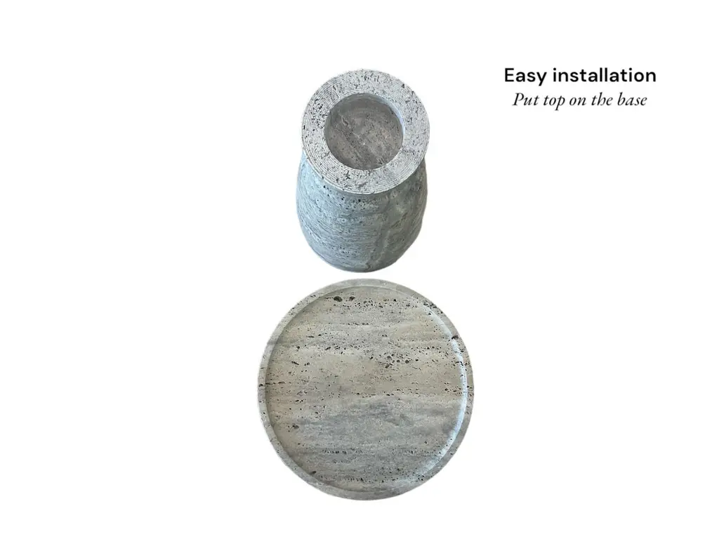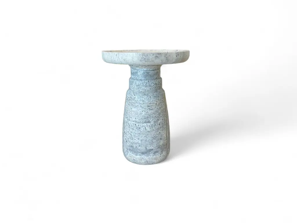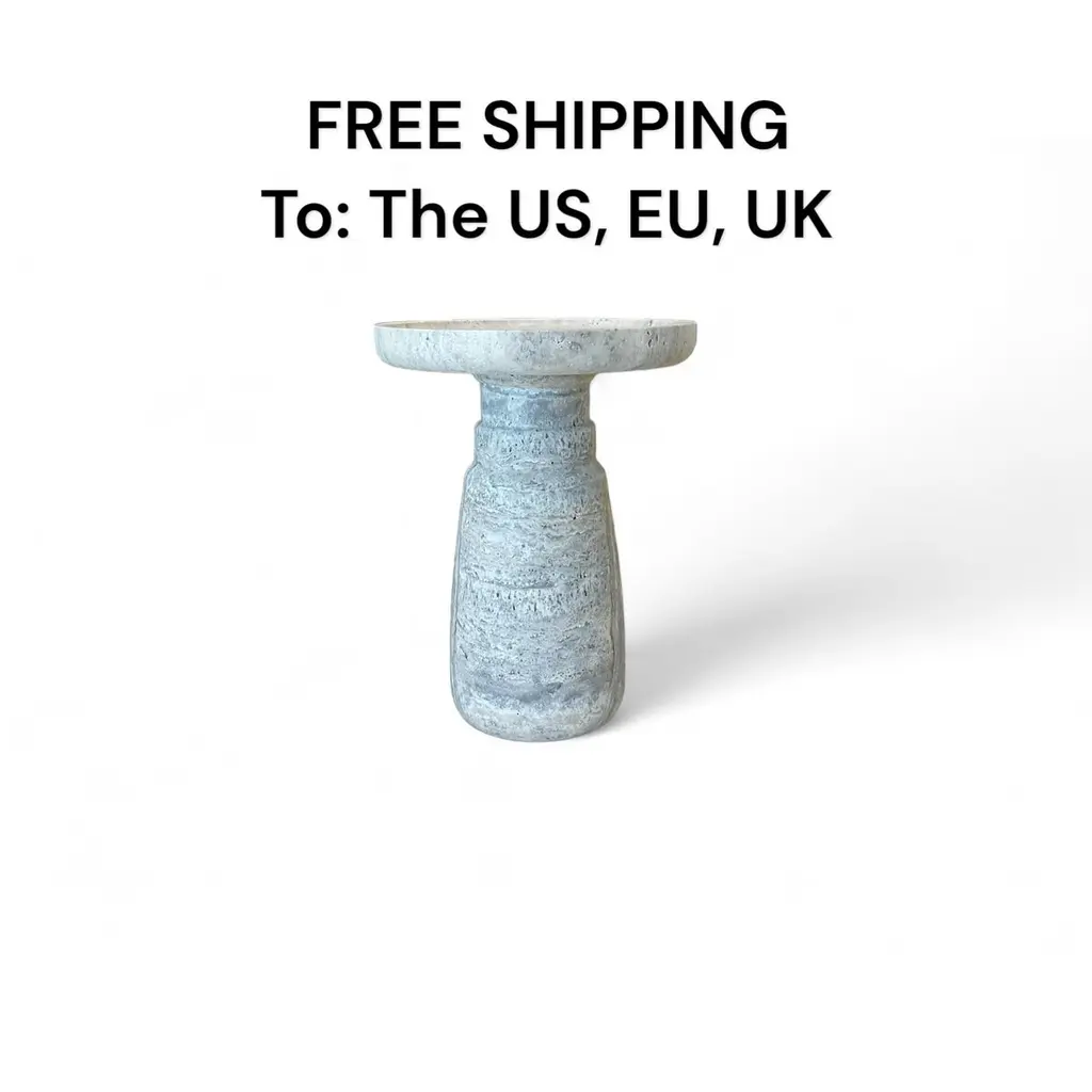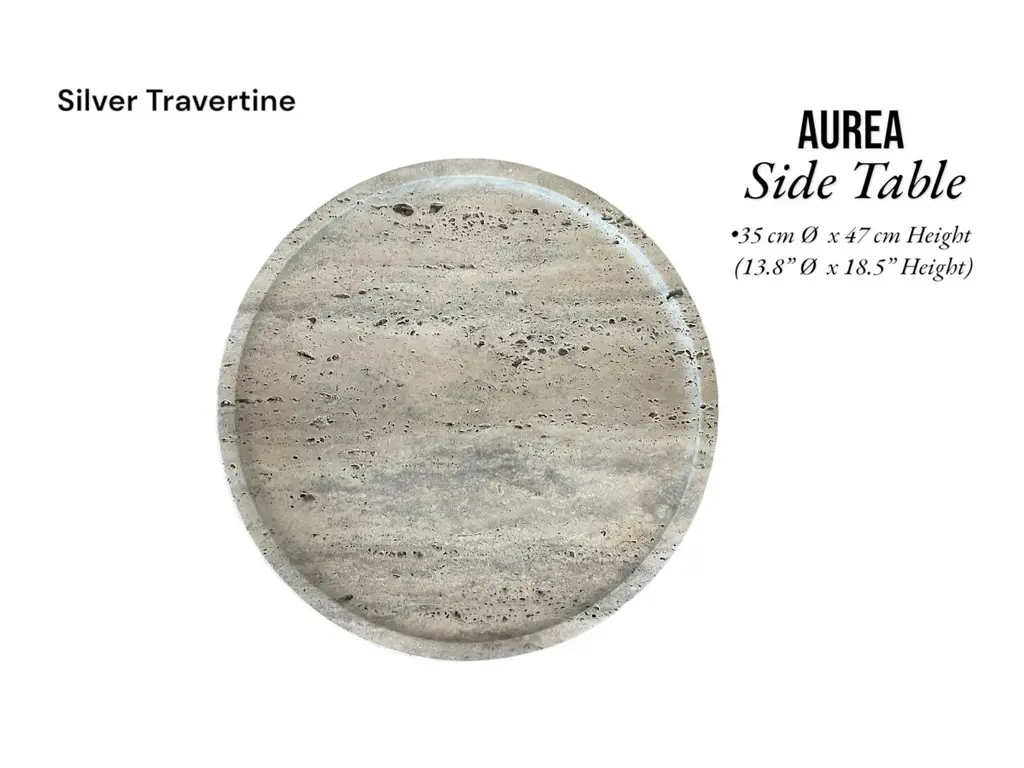 ‘Aurea’ Side Table by HAAND, crafted from premium silver travertine. This exquisite piece measures 13.8 inches in diameter and 18.5 inches in height, with a substantial weight of 80 lbs.The Aurea Side Table is a testament to superior design and craftsmanship, embodying HAAND’s commitment to quality. Its honed finish and exceptionally smooth surface give it a luxurious feel—like touching velvet.Its sleek, modern silhouette and natural stone finish make it a versatile addition to any living space. While it functions beautifully as a side table, its versatility extends beyond this. Use it as:1.A Statement Piece: Place it in your living room to hold decorative items like vases, sculptures, or candles, enhancing your room’s aesthetic.2.A Nightstand: Its sturdy design makes it perfect for a bedroom nightstand, providing ample space for a lamp, books, and a glass of water.3.An Accent Table: Ideal for your office or hallway, where it can display art pieces, houseplants, or serve as a convenient spot for your keys and mail.4.A Plant Stand: Elevate your indoor garden by using it as a stylish plant stand, showcasing your favorite plants in a unique way.5.A Patio Table: Its robust construction allows it to be used outdoors, making it a great option for a patio or balcony table, perfect for holding drinks and snacks during gatherings.With its enduring elegance, velvet-like touch, and robust construction, the Aurea Side Table promises to be a timeless addition to your home decor, seamlessly blending function and style.For custom size requests, please send us a message.