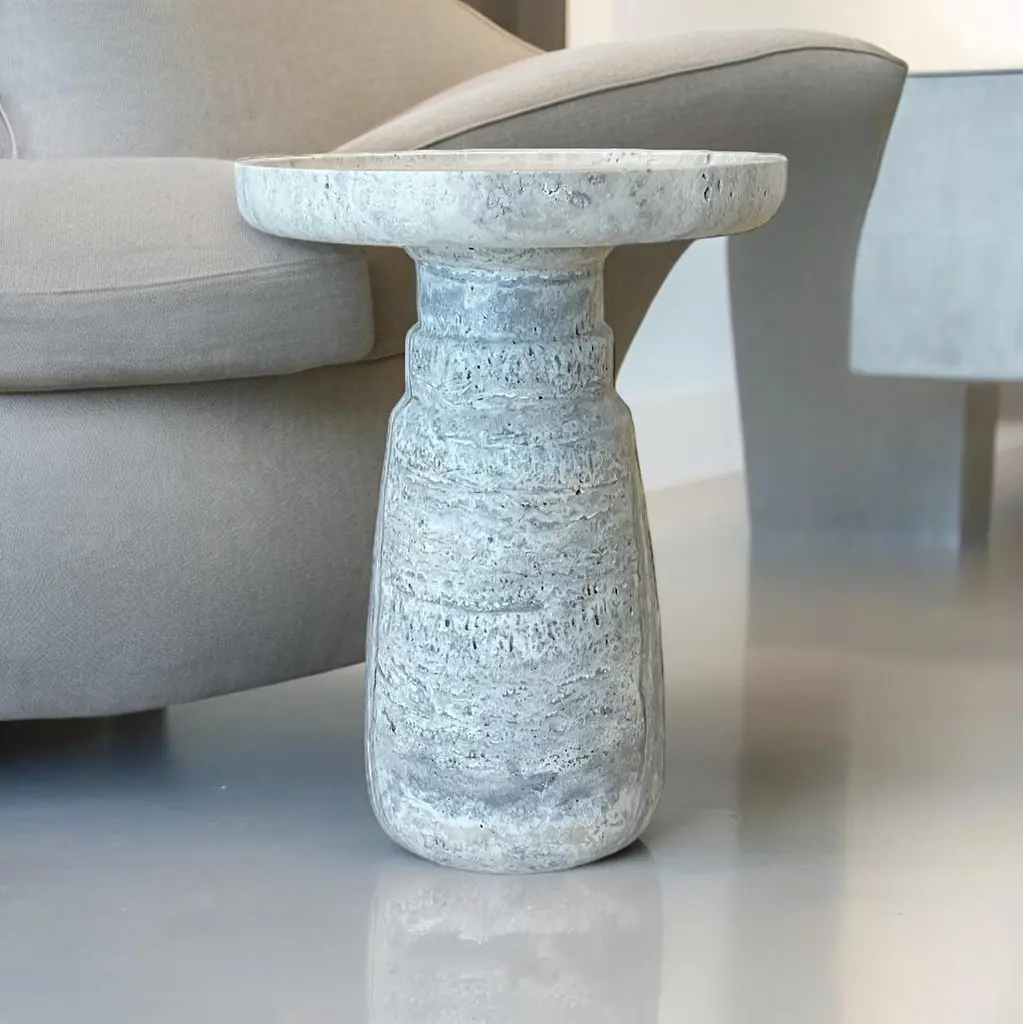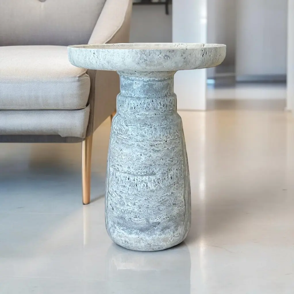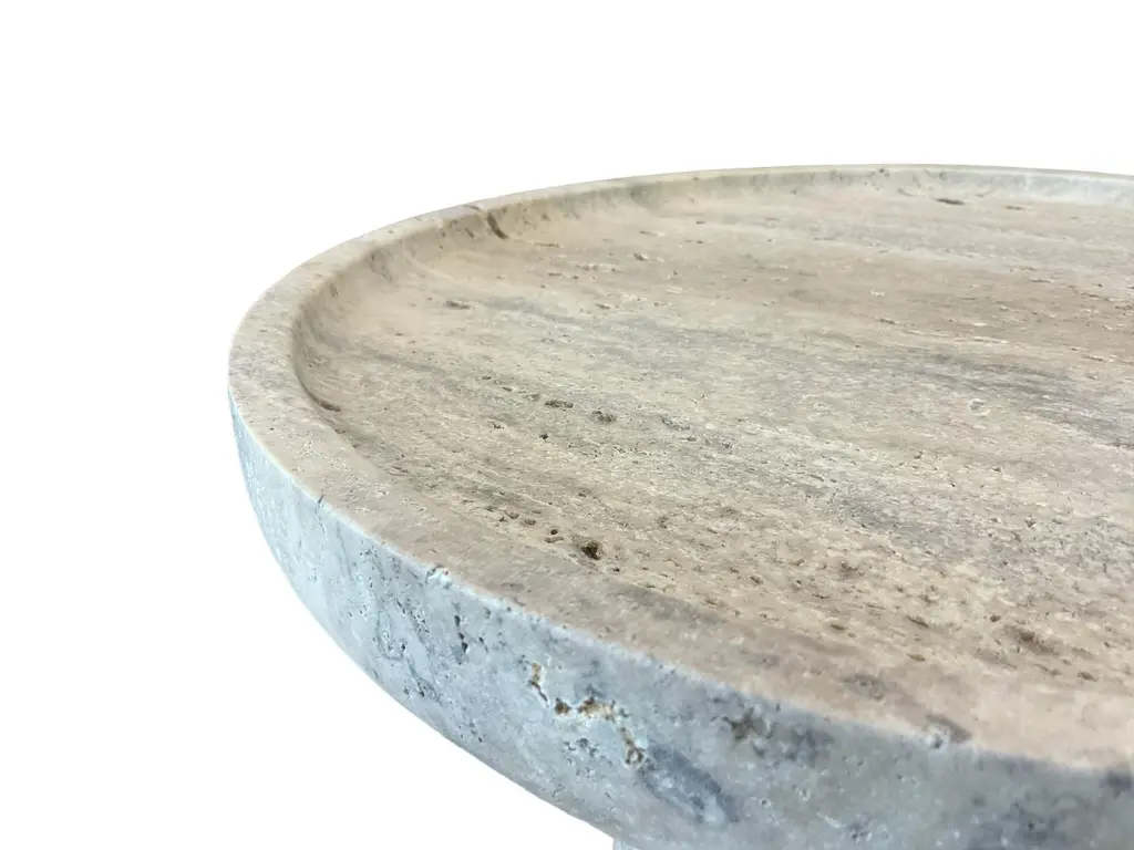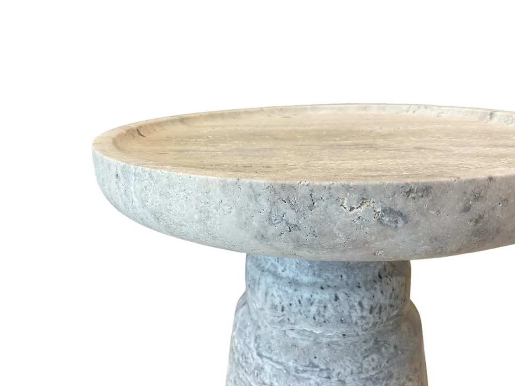 Aurea Side Table, Silver Travertine Stone Round Side Table For Living Room Decor