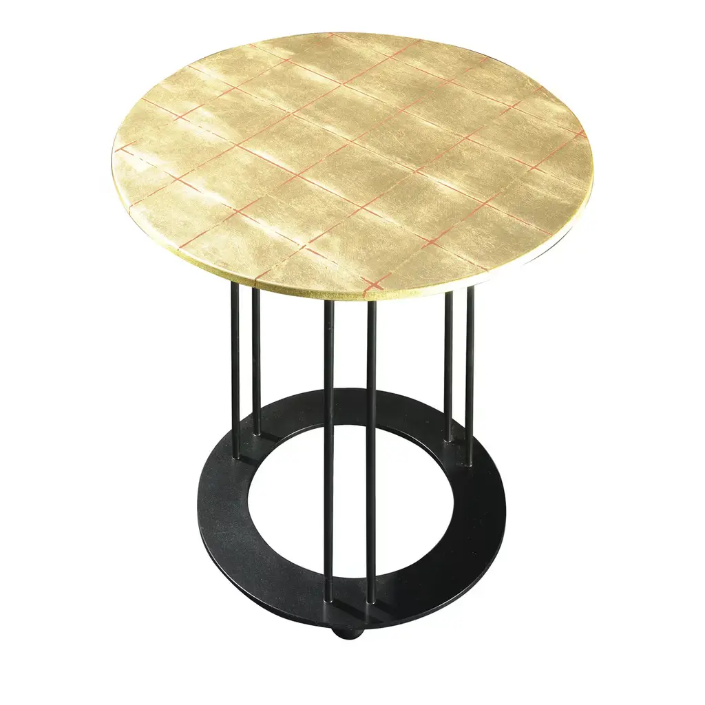 This coffee table is a unique piece of sophisticated allure exquisitely crafted with a clean, essential silhouette marked by simple geometric lines. The black coated metal structure is composed of three elongated, slim legs mounted on a base with the shape of a ring adding balance to the piece. The top is made of wood and is finished with silver leaf that gives it a shiny and mesmerizing hue.