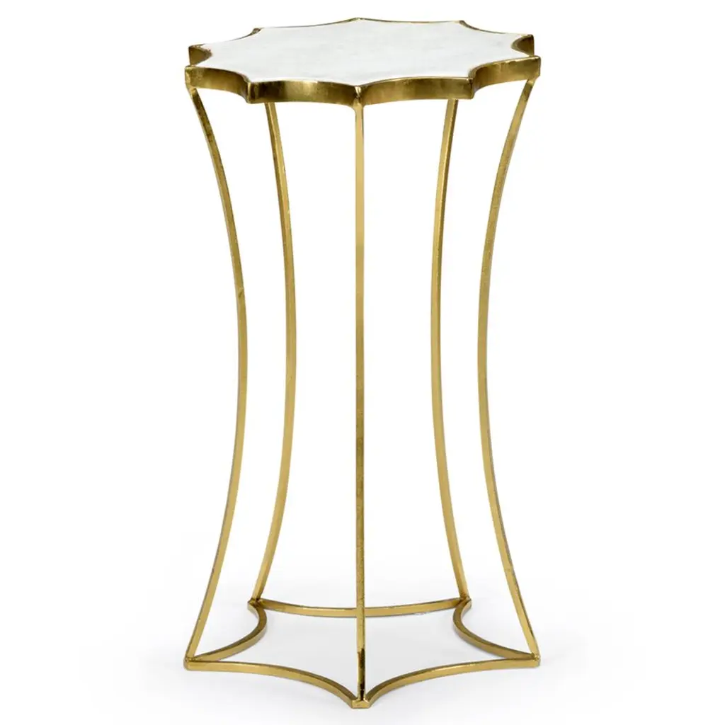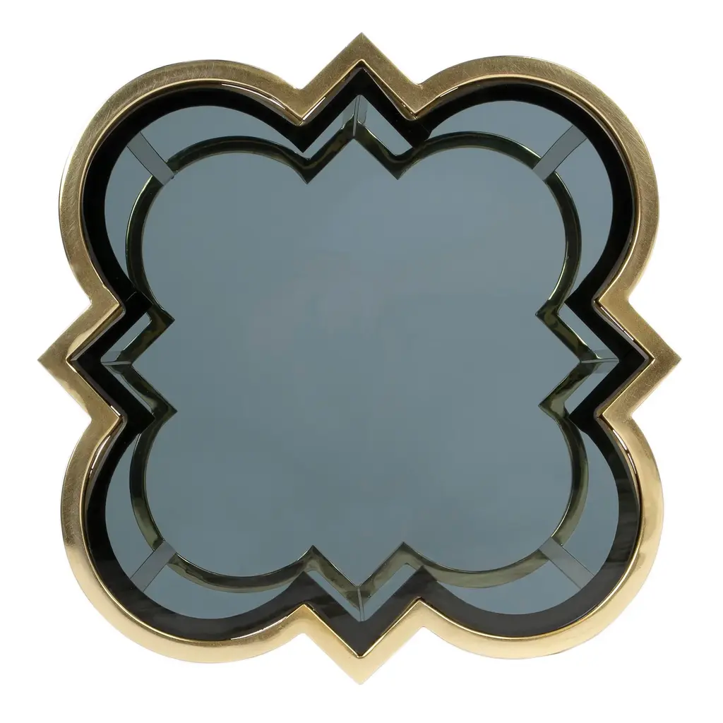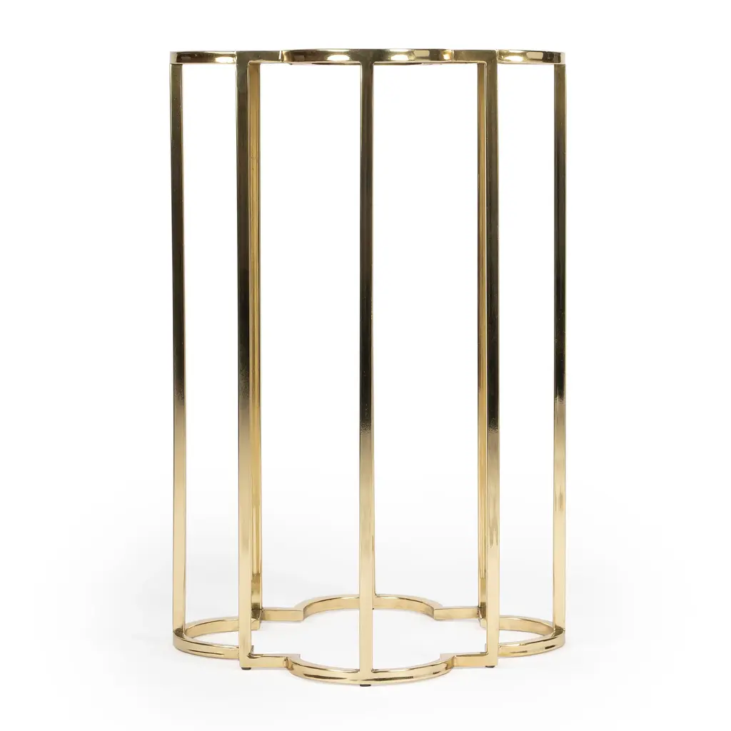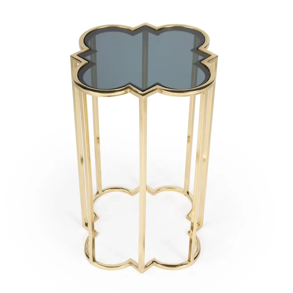 Designed for small spaces, this elegant table juxtaposes vintage bohemian design with modern design. It boasts a polished gold stainless steel base with a quatrefoil shaped black glass top. Amplify any living room, bedroom, or office with this accent table. Durably Constructed With: Stainless Steel, Black Glass Product Construction Features: Finish Distressing Product Assembled Measurement & Weight: 23.5" H x 15.75" W x 15.75" D -- 11.0 lbs. 30 lbs. Suggested weight capacity Item Arrives: Needs Assembly N/A Photo may slightly differ from actual item in terms of color/finish due to the lighting during photo shoot or the monitor's display.