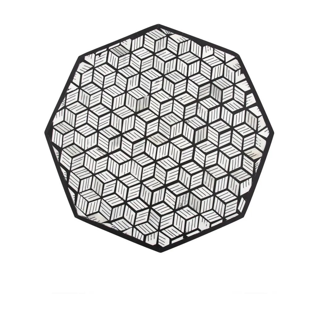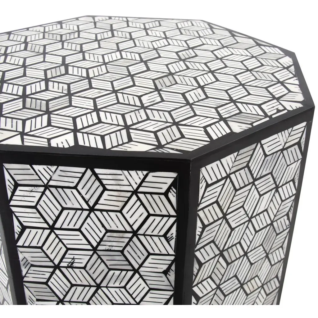 This small octagon shaped end table has become an interesting study of black and white geometric shapes. The optics of these patterns are taken to a new depth with bone being inlaid into the shapes to further add depth. The bone is cut and polished by a craftsman who then applies each piece by hand creating a true piece of art.