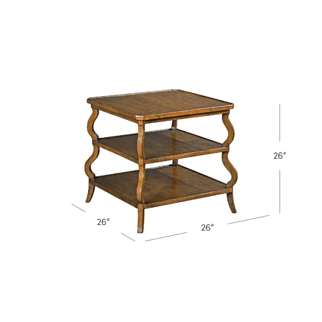 The Aventura end table is highlighted by uniquely shaped cast resin posts that support the top and two shelves, while also visible on the top's surface. The open-back design is finished in a warm and rustic marcona.