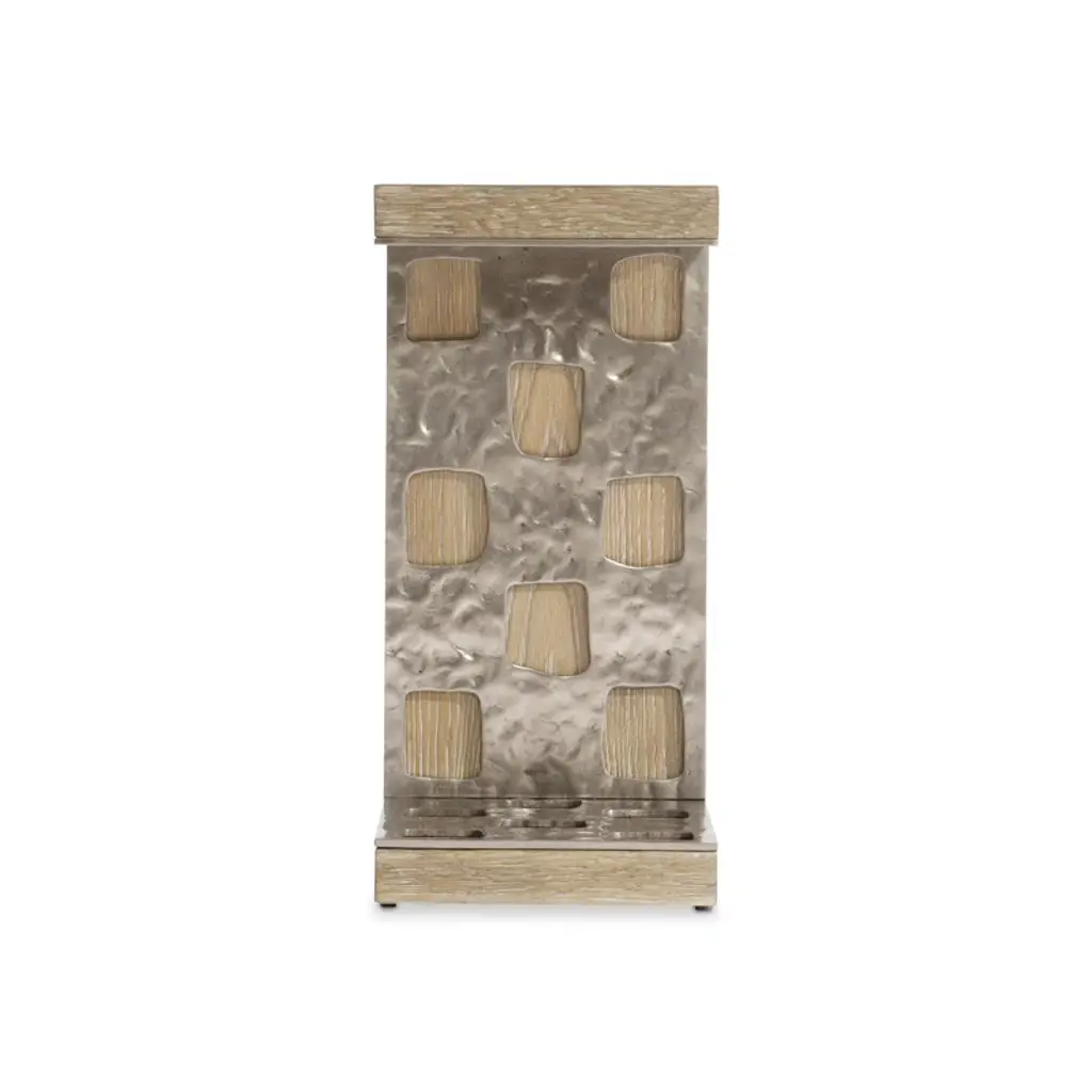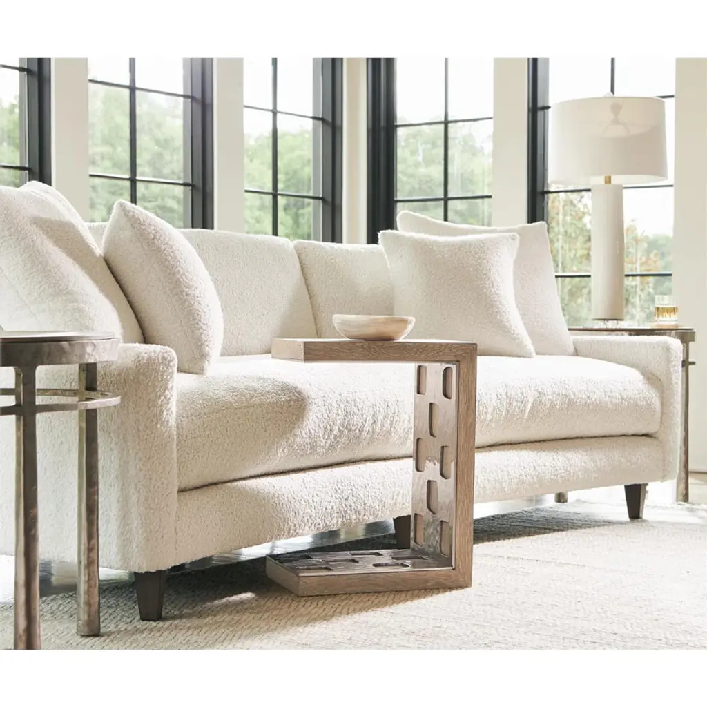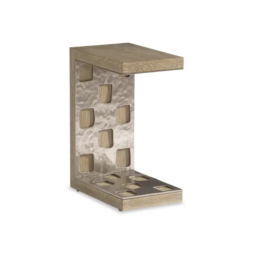 Cool California style finds its form in cast aluminum metal overlays on the Aventura accent table. Openwork freeform squares on the back and base of the C-shaped table reveal the wood frame in our marcona finish.