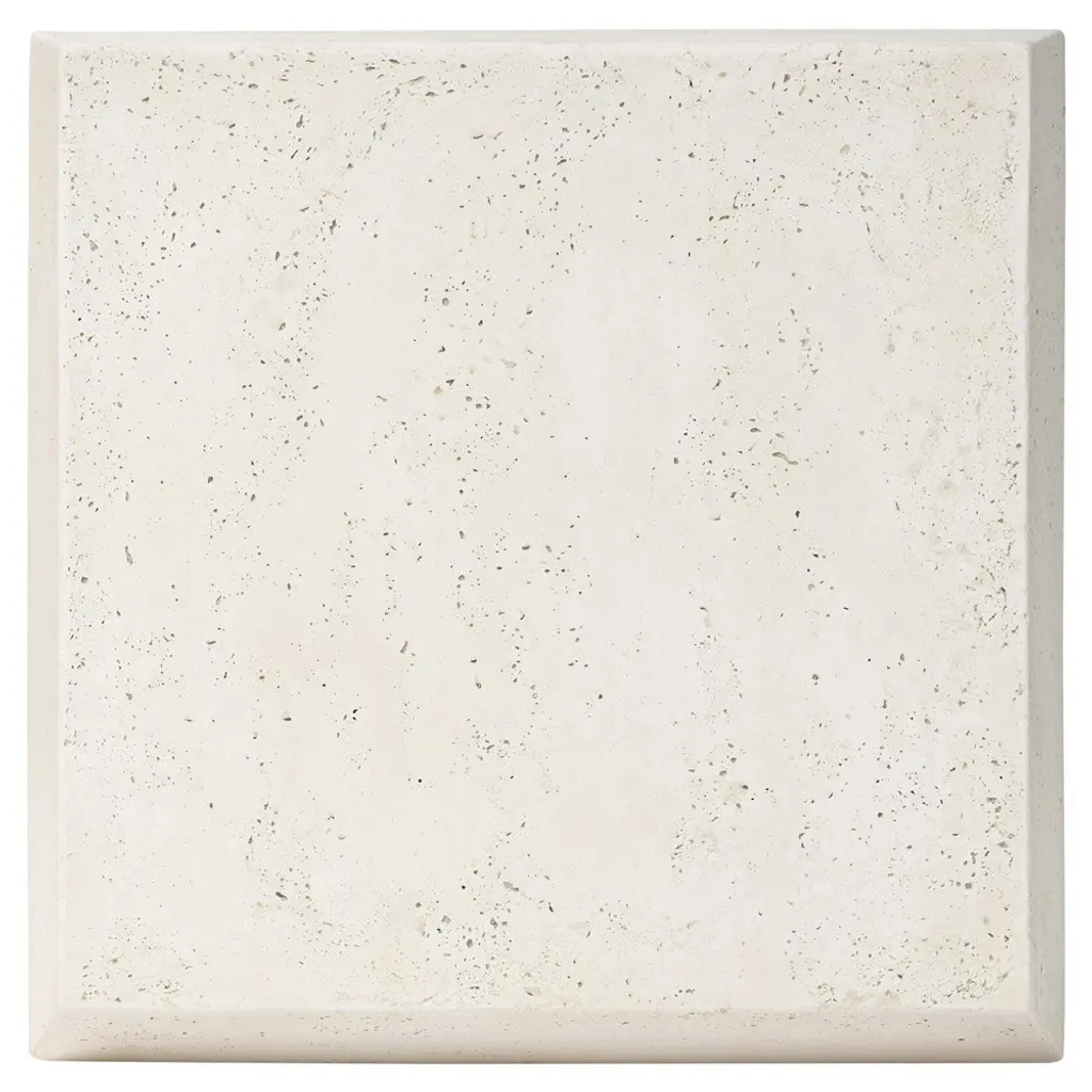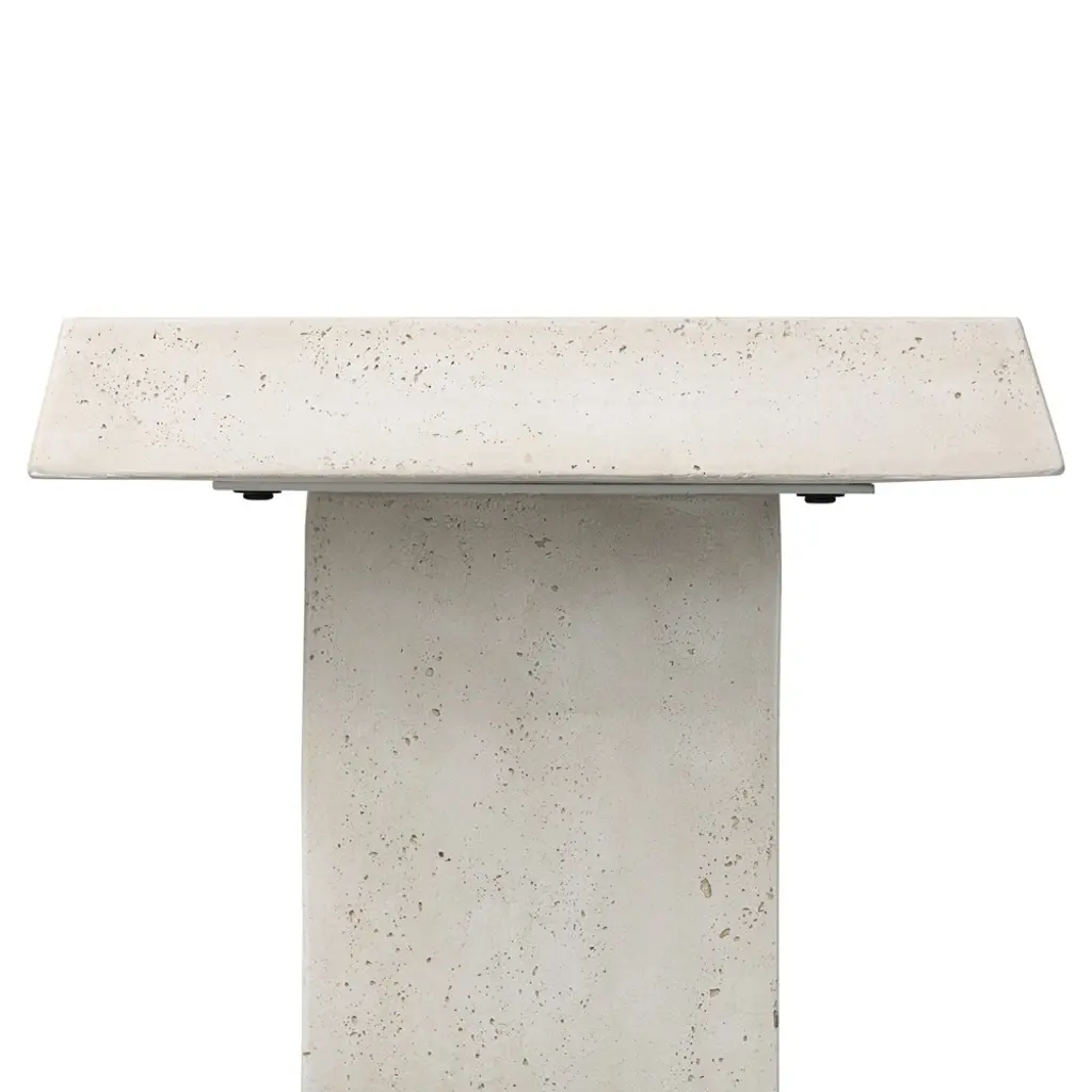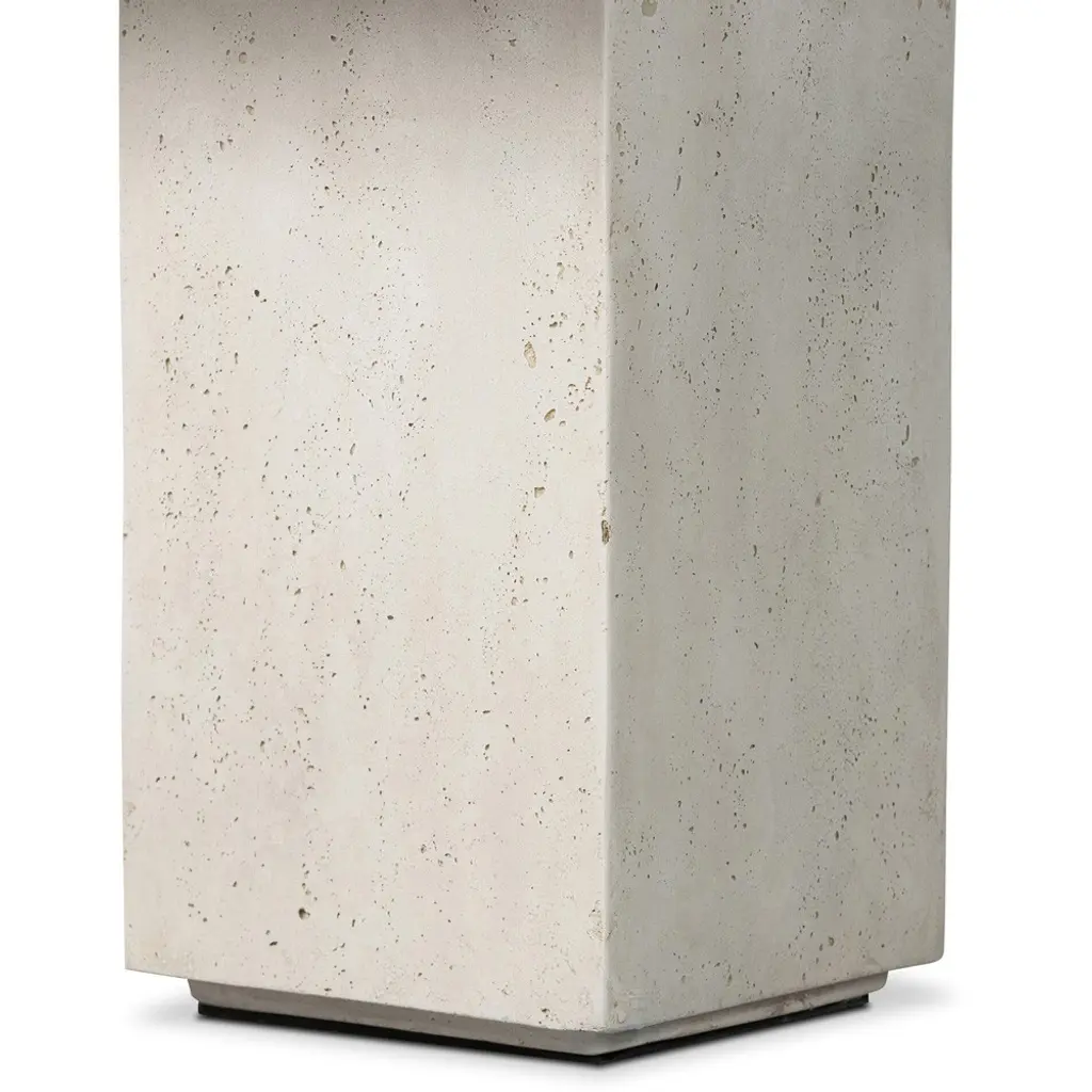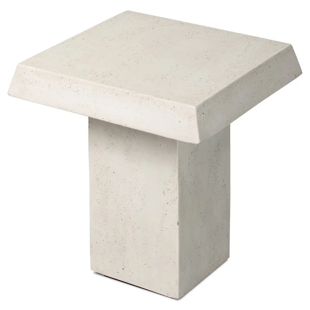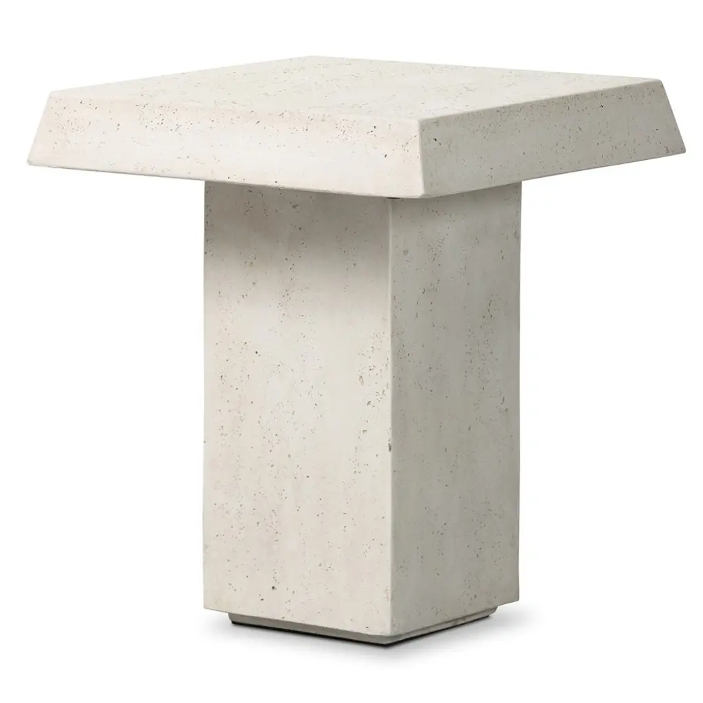 A design collaboration by Amber Lewis and Four Hands. Simply shaped with a square pillar and subtle plinth base, the aged white concrete finish of this outdoor end table features a soft, parchment feel, complemented by a reverse bevel edge for visual intrigue.