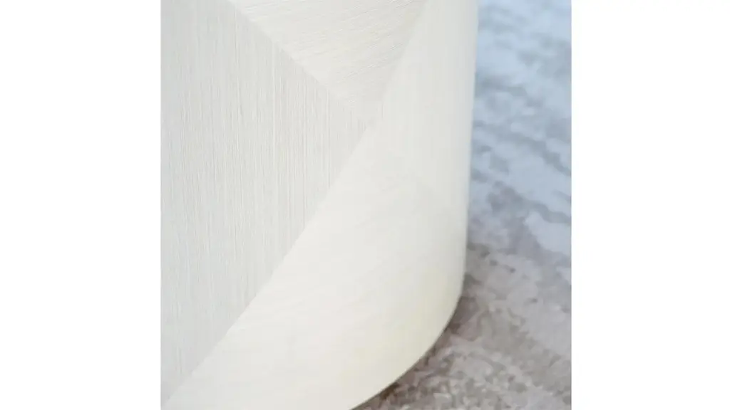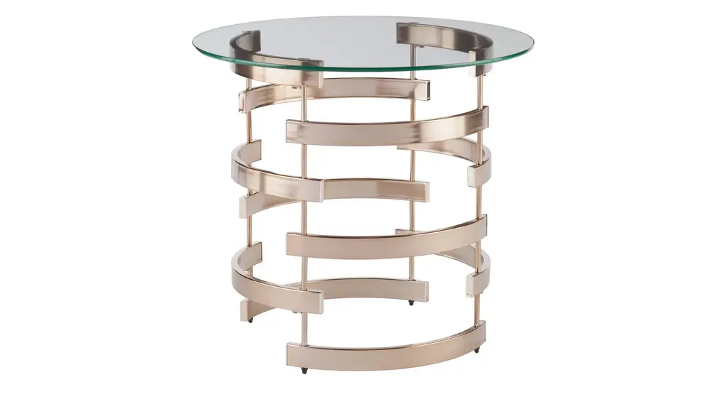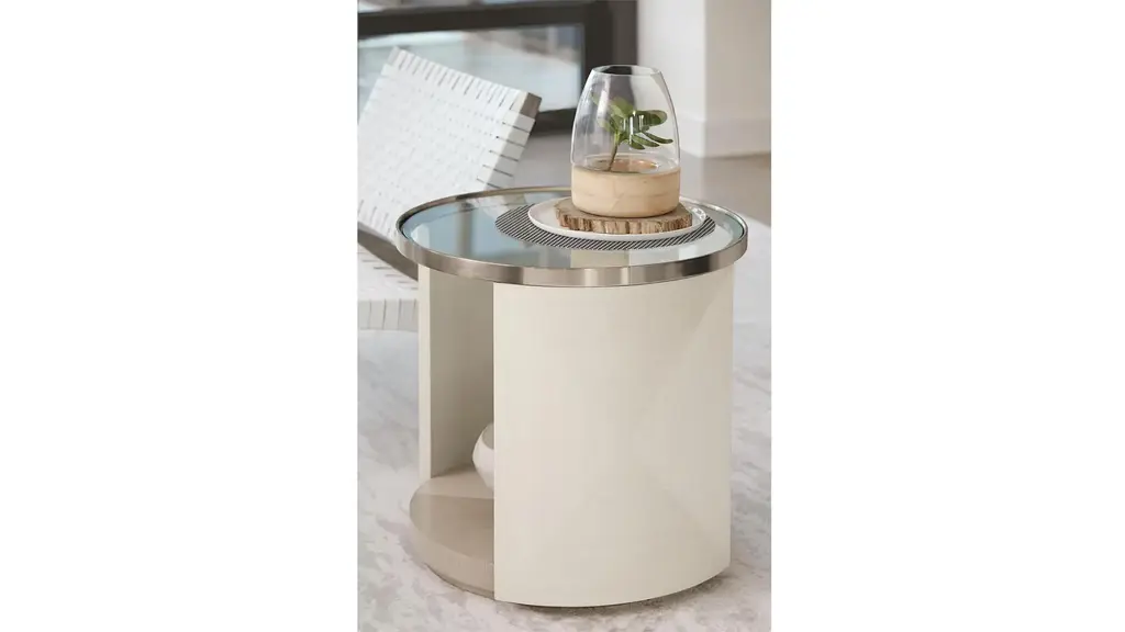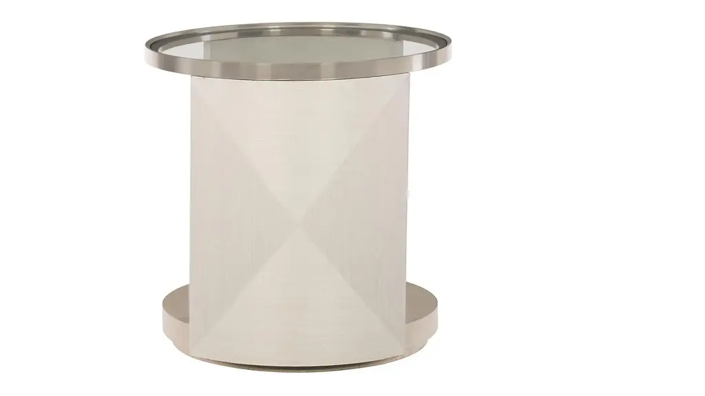 The Axiom chairside table, an uncommon combination of materials and finishes takes center stage. An inset tempered glass top framed in stainless steel sits a top fancy face end panels finished in a low-sheen Linear White. A bottom shelf in Linear Gray allows for storage and display. The curved design and triangular veneer patterns of this sophisticated piece create an appealing visual element that shifts when viewed from various angles