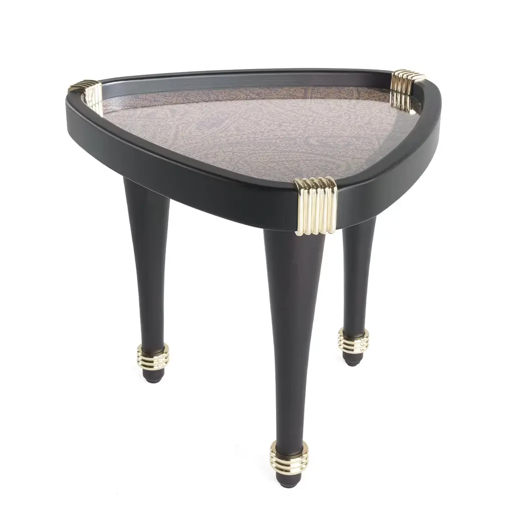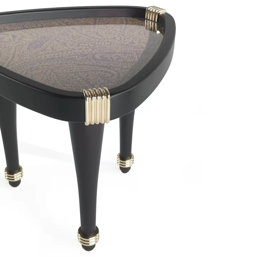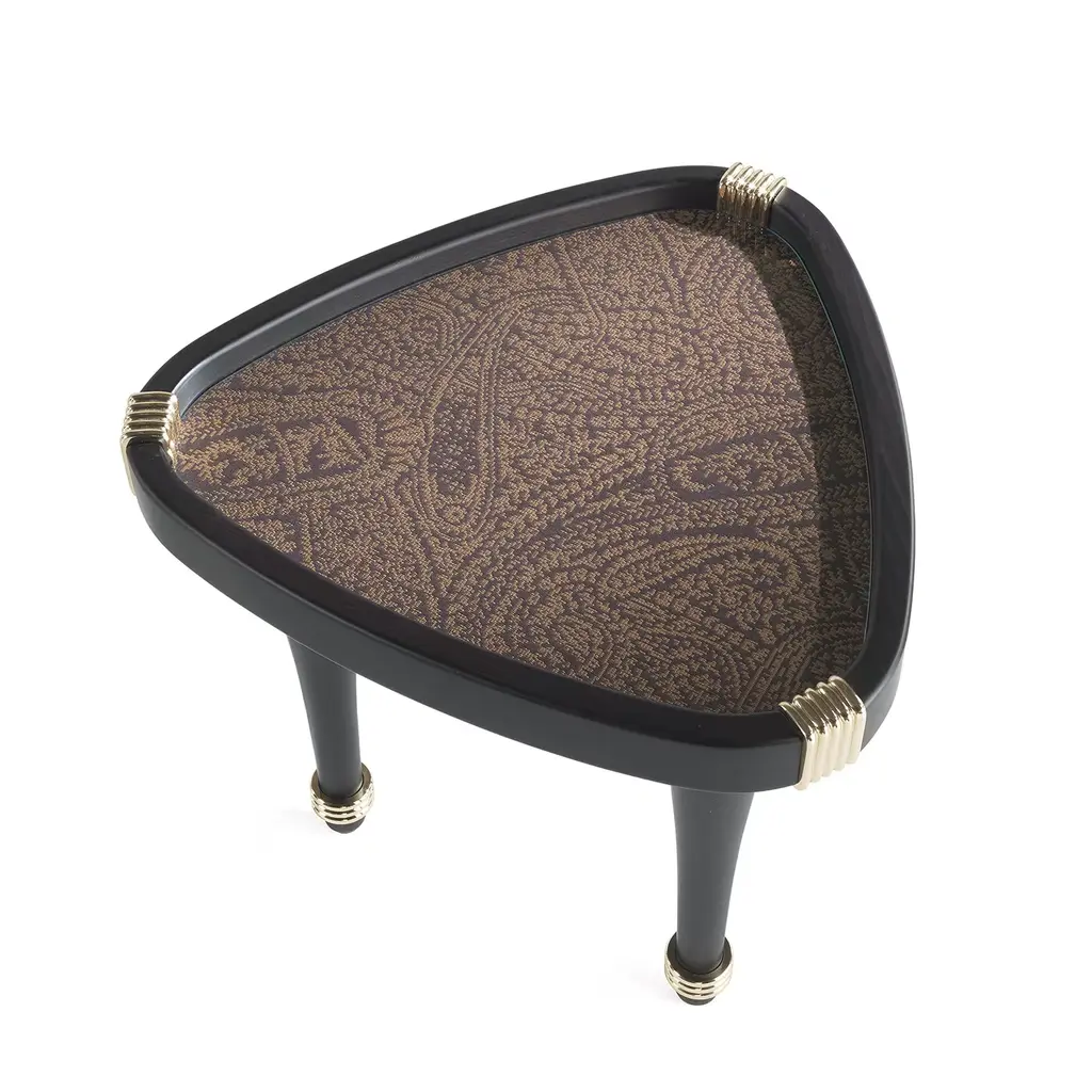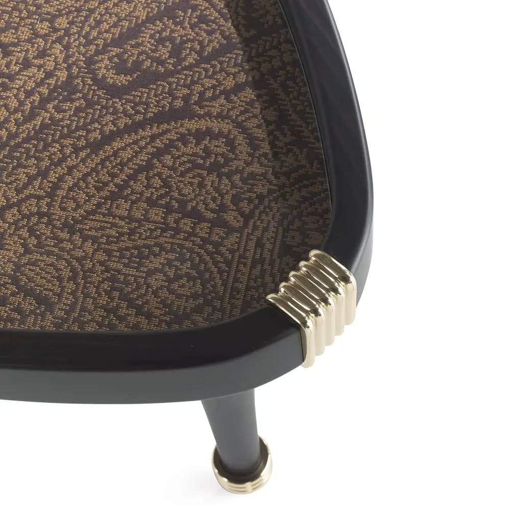 A nomadic inspiration reinterpreted in an ethnic key. The African atmosphere is present in the matte finish of the dark wengè wood, in the polished brass rings reminding the jewels of the African tribes and in the warm colors evoking the drylands of the savannah. The Paisley motif on the fabric is connected to the deepest DNA of the brand contributing to create a wonderful piece of furniture in perfect Etro Home Interiors' style. Structure in matte dark wengè dyed wood and details in polished brass. Top covered with fabric cat. A Zulu col. 1 Tobacco and glass. Please ask the Concierge for available customization options.