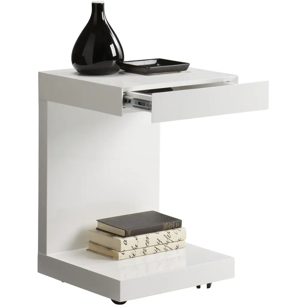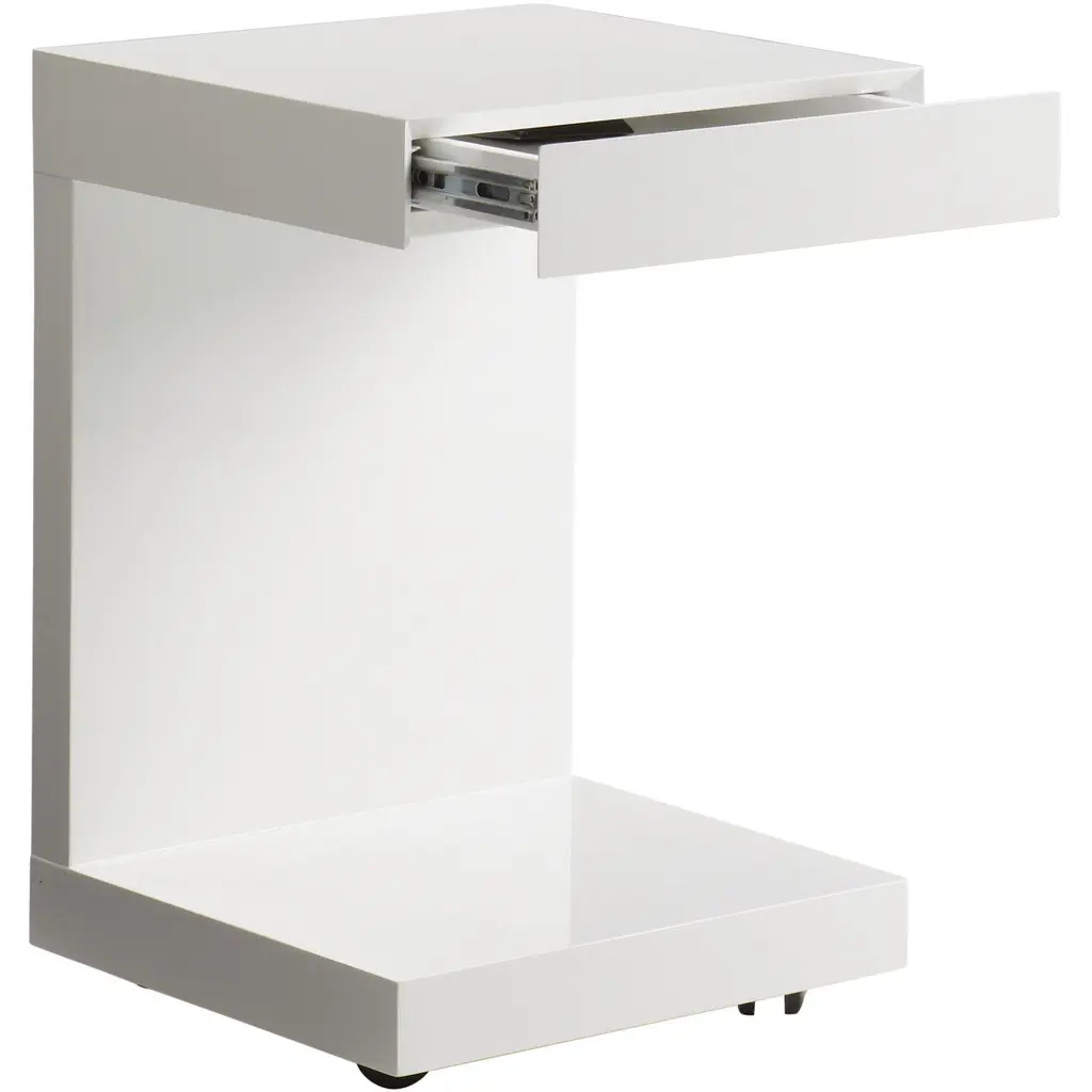 This simple but very functional c-shaped table with drawer can be used with a sofa, chair or even as a nightstand. Stocked in high gloss white. Also available in espresso and driftwood. Castors are included.