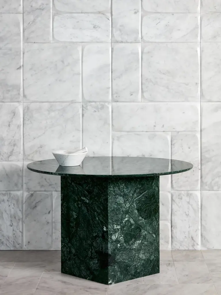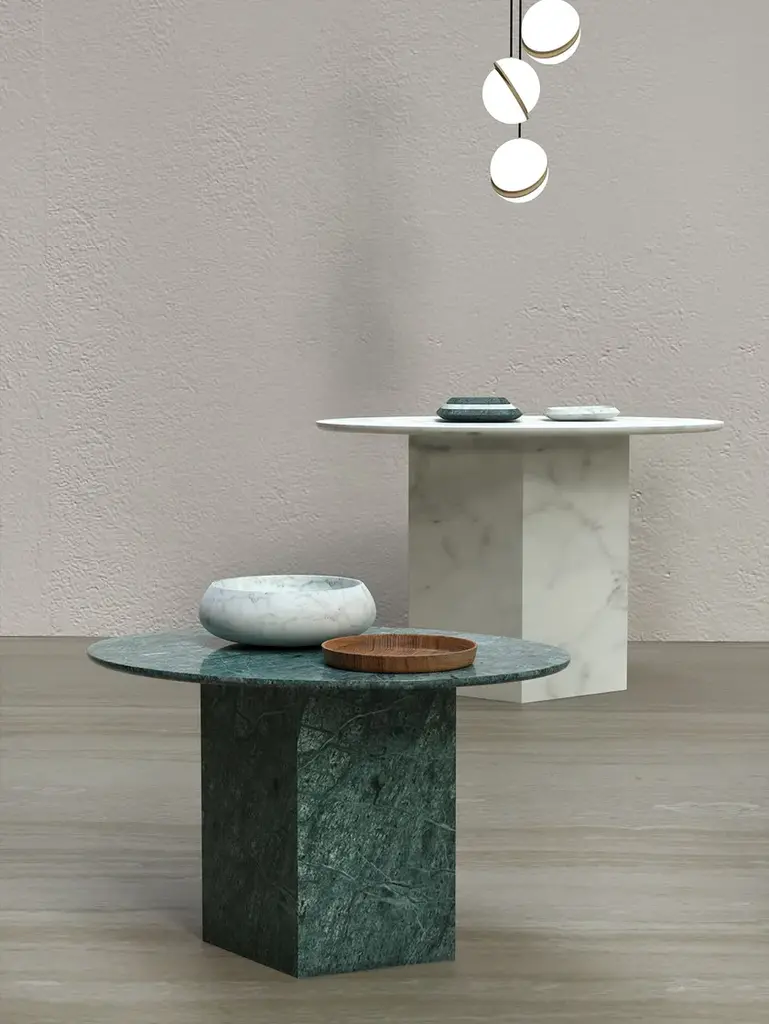 Badisco is a table made entirely of marble, built on a solid rectangular base topped with an oval slab. It is available in White Carrara marble or Imperial Green, in the side table version or in the coffee table one. Despite its majesty, Badisco has a lightness of form and a design that makes it a classy element with fascinating features.