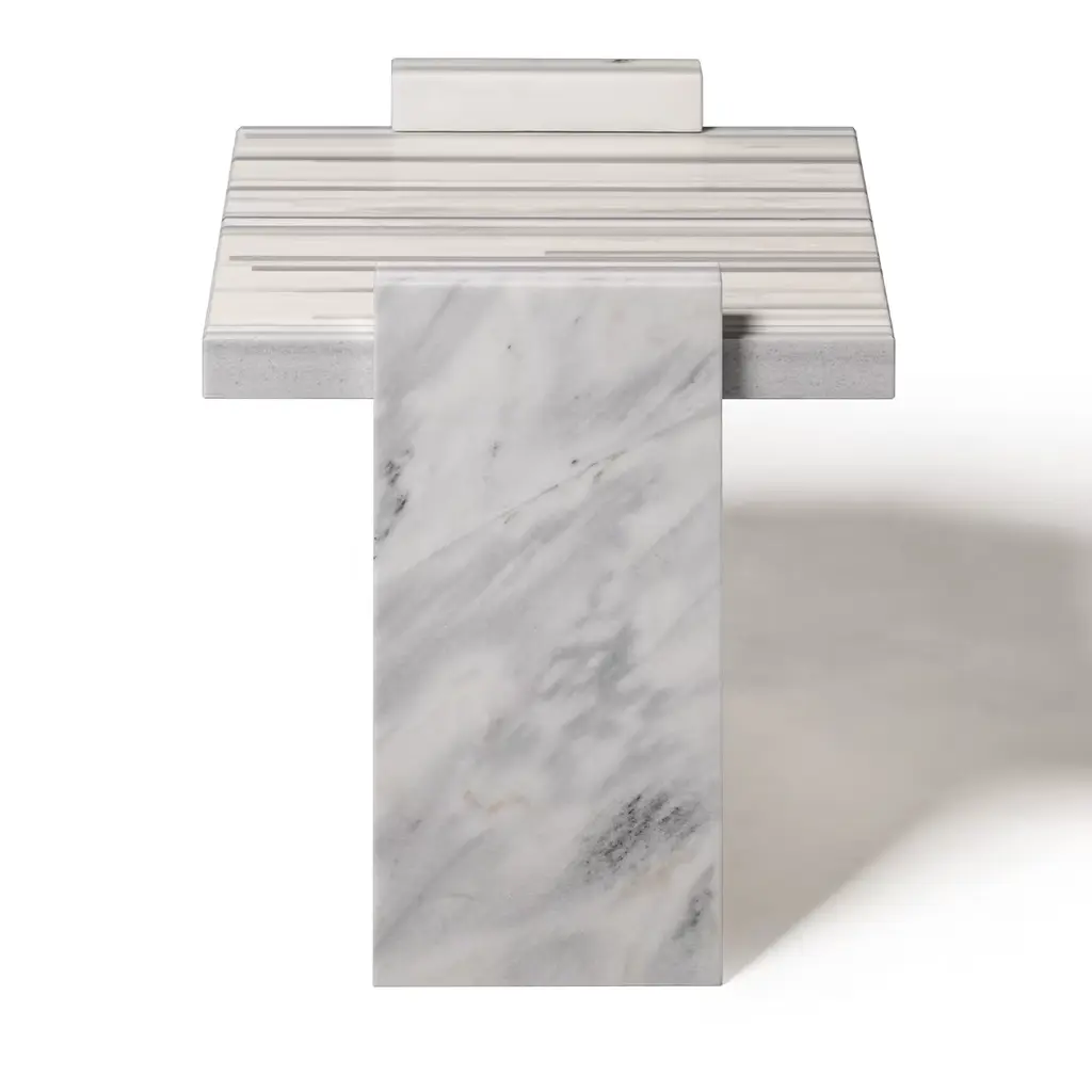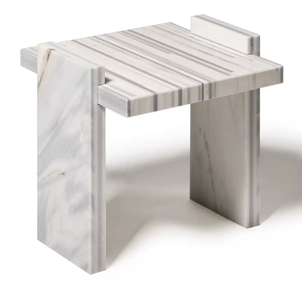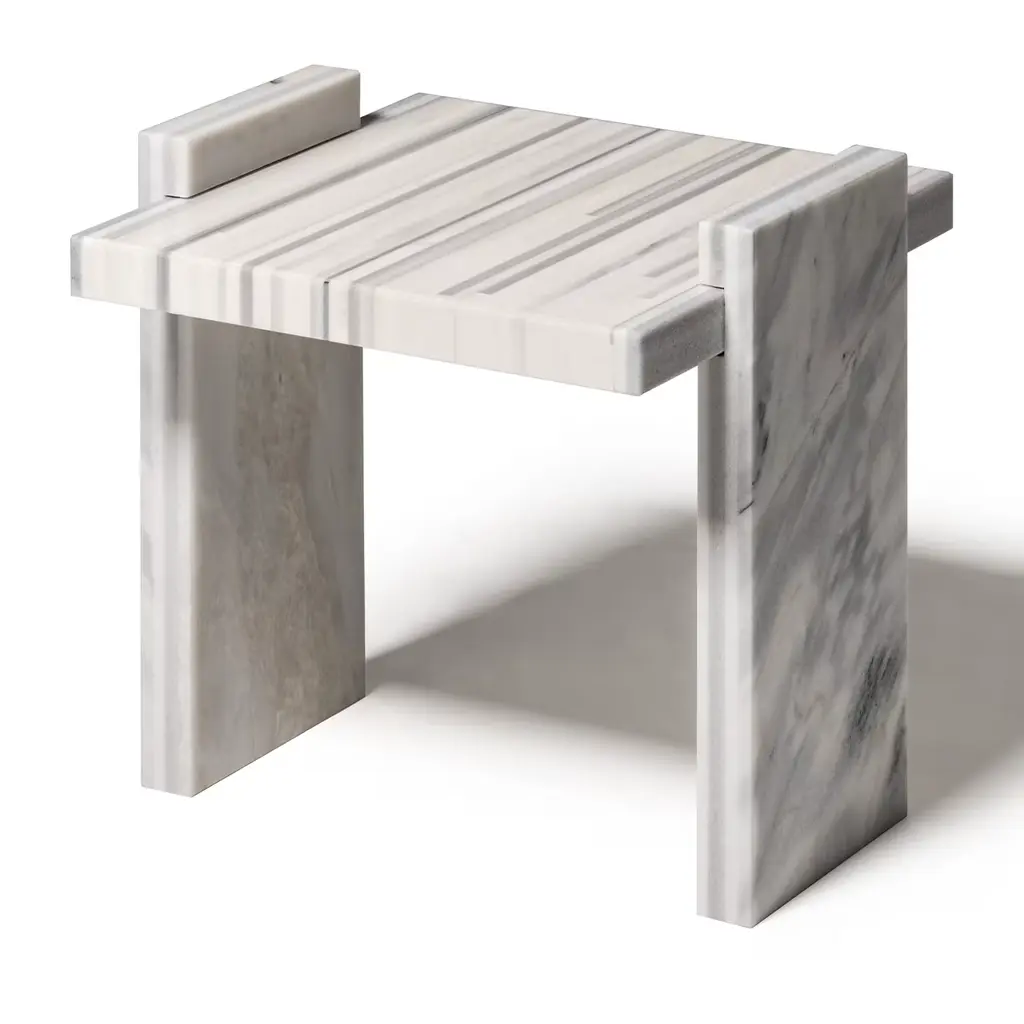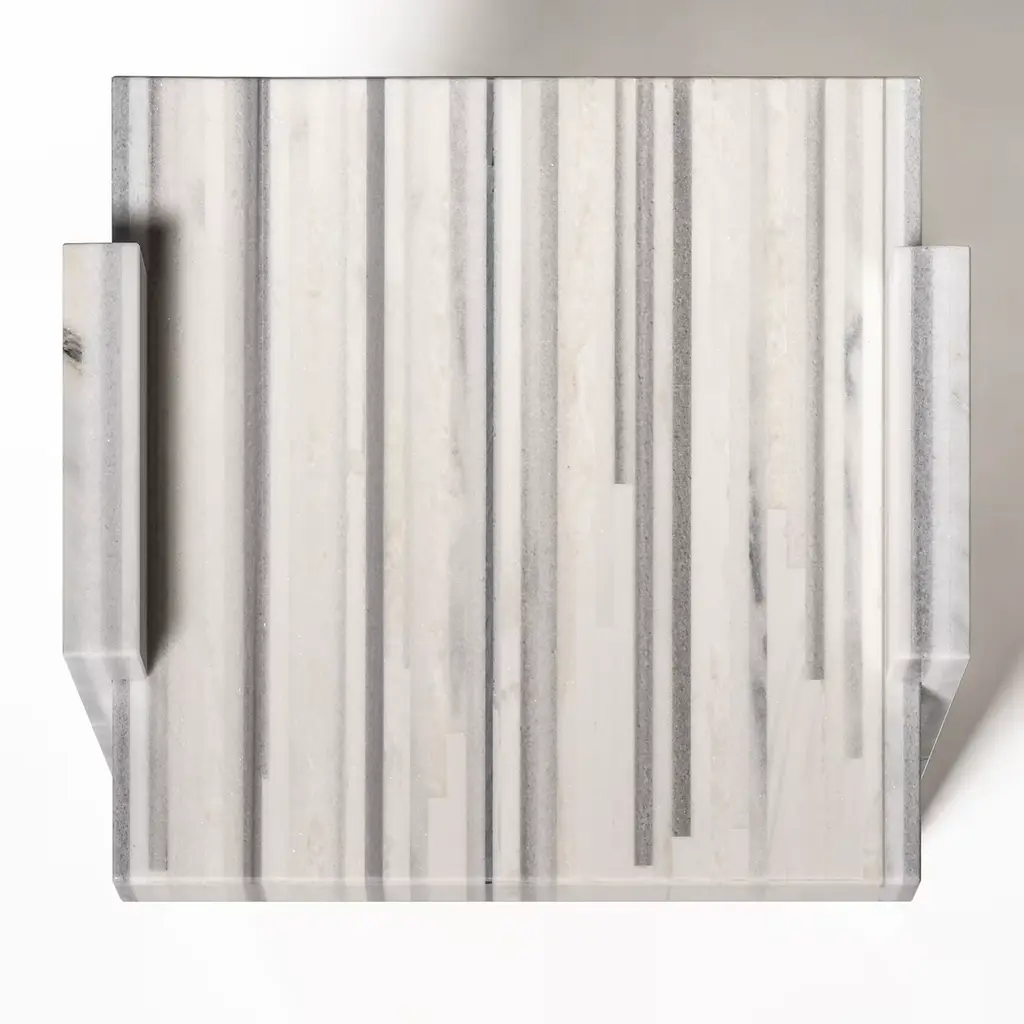 Bakodo Side Tables, from the exclusive Fragment Collection by Gwenael Nicolas for Budri - unveiled at the Milan Design Week 2022, are available in Large and Small sizes, are modular and can be combined with each other. The striped pattern is made up of white and grey rods in Striato Olimpico, Bianco Namibia, Bianco Covelano, and Bianco Sivec marble. Please ask the Concierge for customization options.