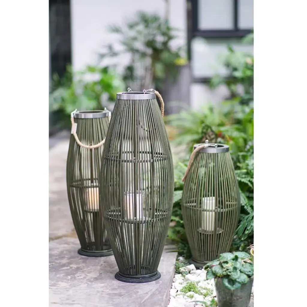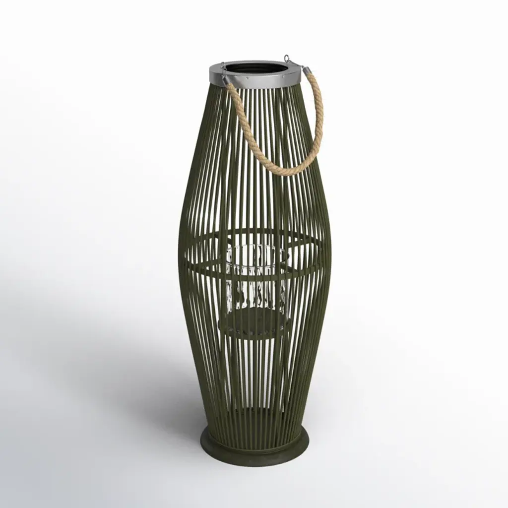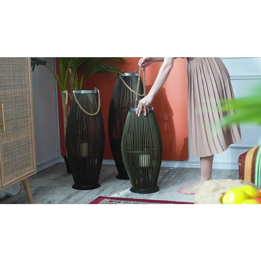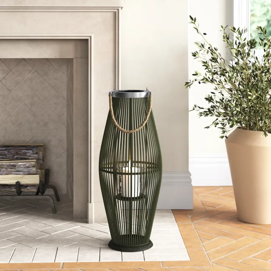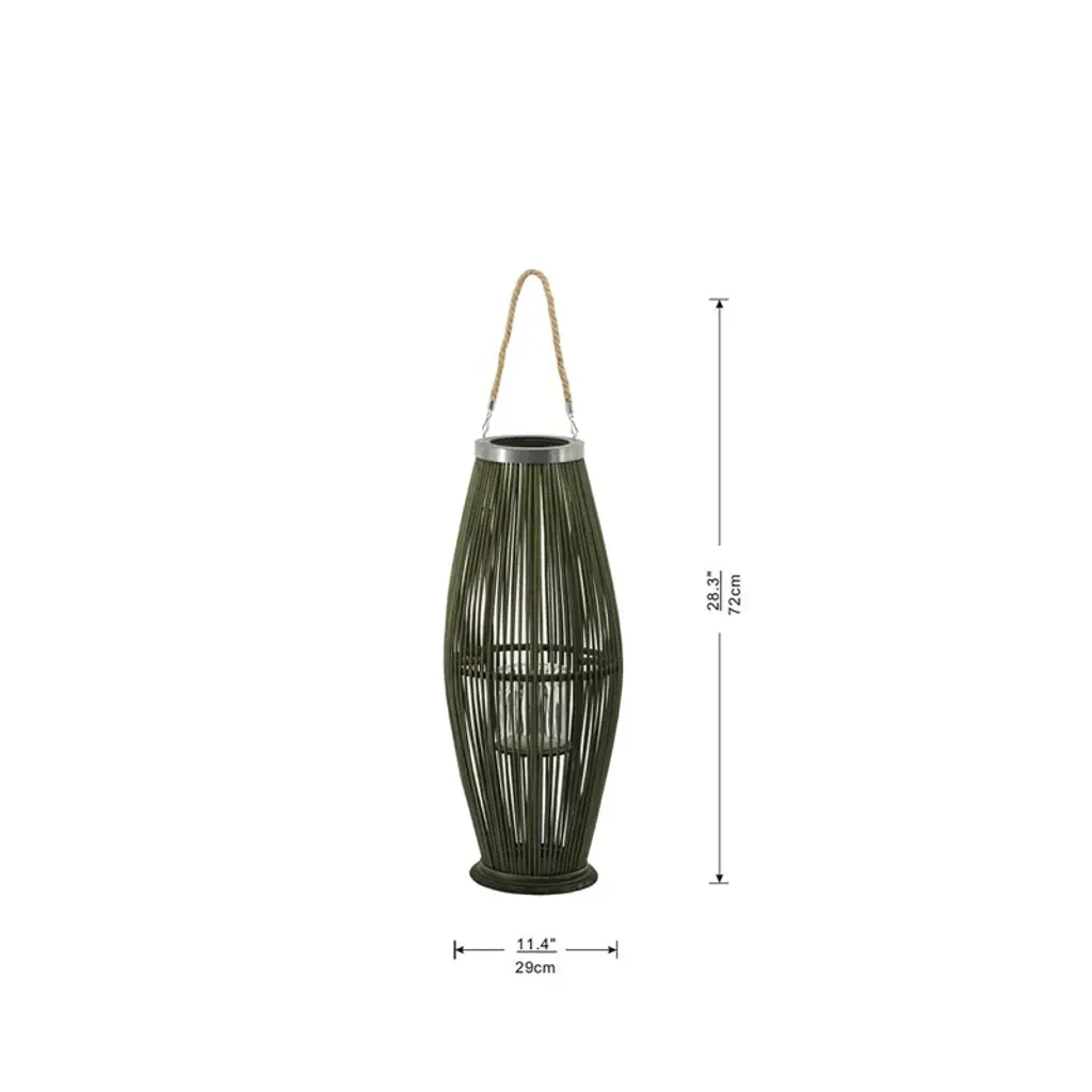 This medium bamboo lantern features a woven design around a glass hurricane for a cool, understated style. Crafted with a simple hemp rope handle, it's a smart designer's favorite touch for neo-southwest décor. With its elegant profile and tapered top and bottom, it does a lot of the heavy lifting when displayed on tabletops or set alongside key furniture pieces. And it's sized perfectly to hang from a sconce or rest on an end table – just add a real or battery-powered candle in the center for a flickering touch.