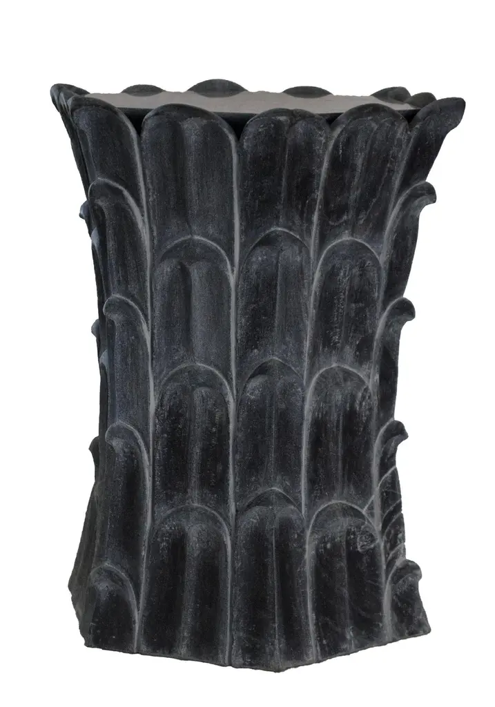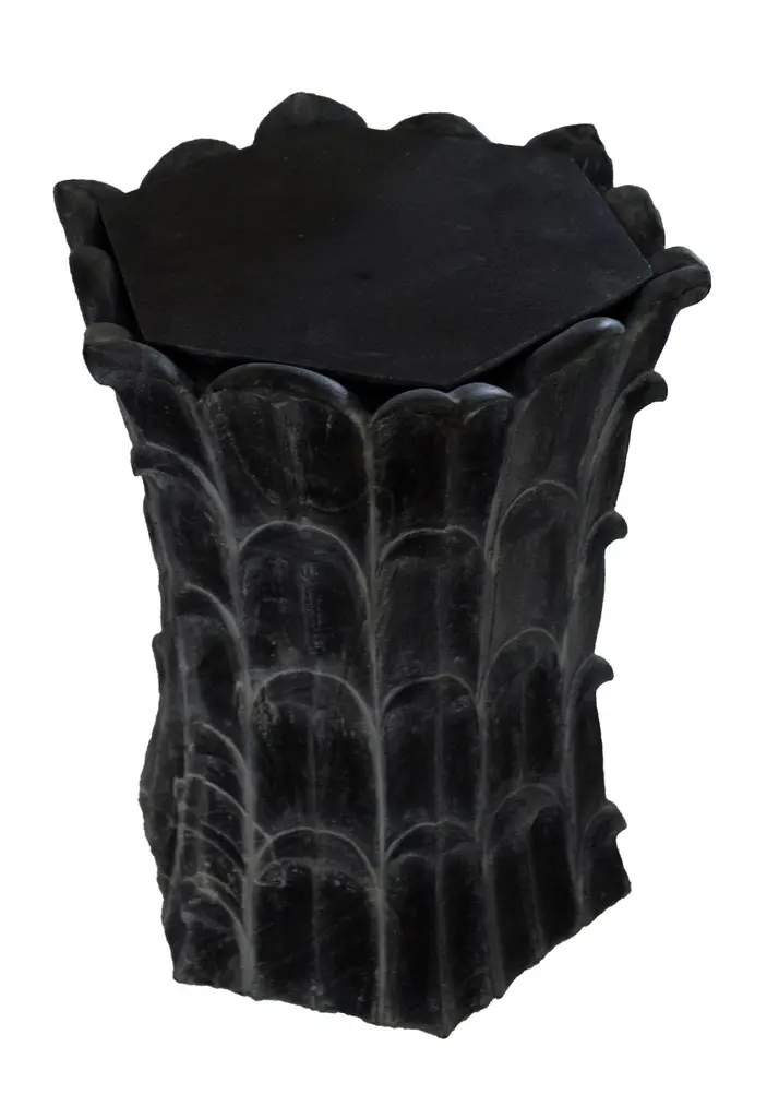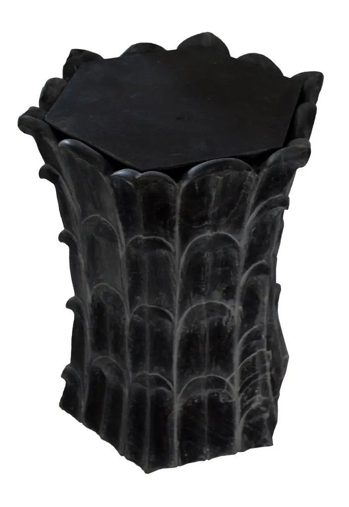 Inspired by the temple carvings in and around Udaipur, Stephanie Odegard designed this unique side table using locally available stones. The arrangement of the carved leaf motif gives the impression of a dense Bamboo Grove. The available options for this table are Agra grey stone, Agra red stone, Jaiselmer/beige stone, Beslana black stone, and Agra white stone.Bamboo Grove Marble Table in Beslana Black StoneSize- 12" x 12" x 18" HMaterials - Beslana Black, Hand Carved, Semi matt finished.Table Shape: Hexagonal cones and Shape is RoundSpecialty- This distinctive table top is detachableBuyer Cancellation-The cancellation charge is 25% which increases to 50% if the production is started.Prices do not include shipping from India (for custom orders) or our MN warehouse (items from stock). That will be additional.