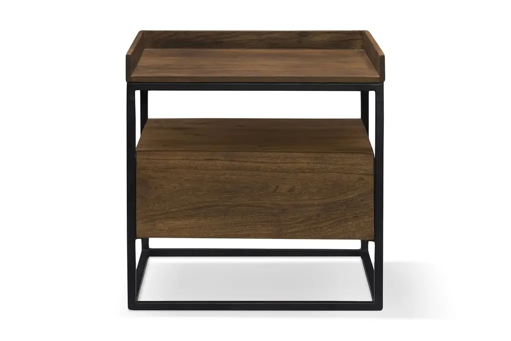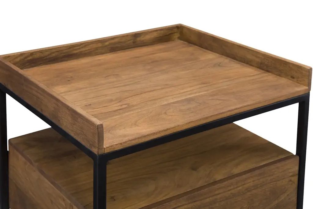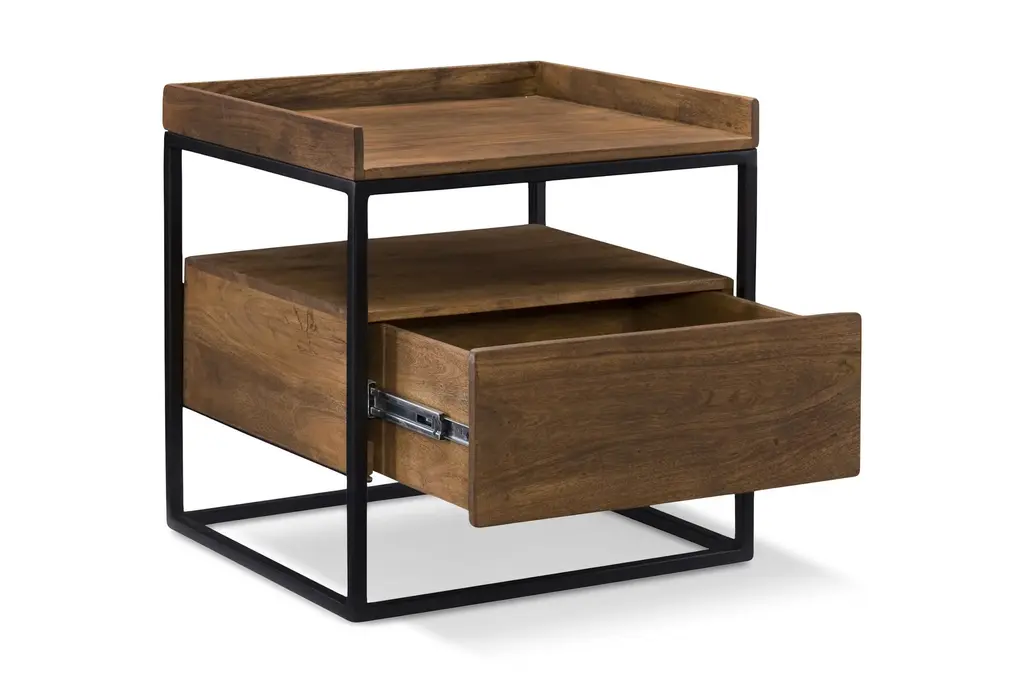 The Bannack Side Table boasts a sleek contemporary style constructed with an iron frame and solid Acacia wood. One storage drawer and a built-in shelf provide maximum storage possibilities.