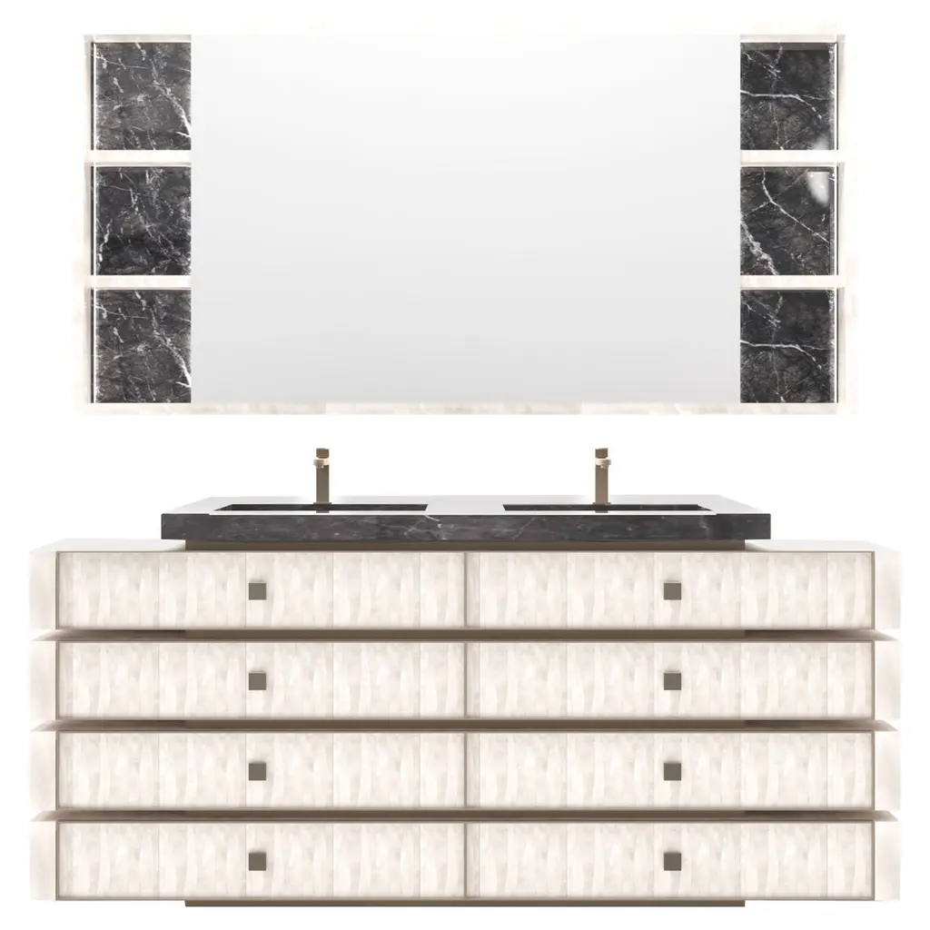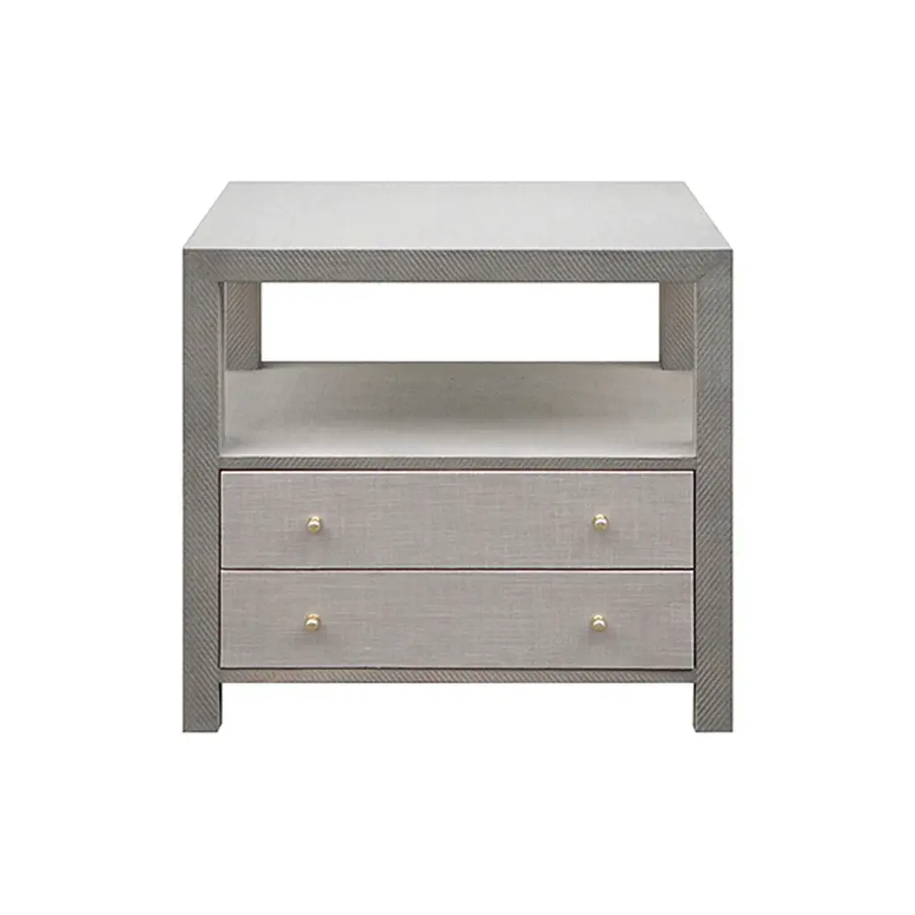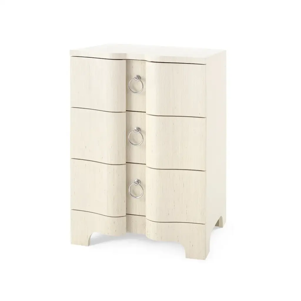 Sweeping serpentine curves give the classic pieces of the Bardot Collection a truly unique touch of surrealism. A tasteful play on form, the facade of our Bardot Side Table evokes a sense of fluid movement, with drawers expertly crafted to resemble rippling waves. Its Art Deco-inspired glamour is furthered by its polished nickel pulls, while the full sense of its quality can be felt in the outer layer of lacquered grasscloth. From its natural texture to its soft coloring, this lovely furnishing is made to withstand the test of time in both craftsmanship and aesthetic. For while it certainly stands out, you’ll find that it feels right at home in any style of decor.