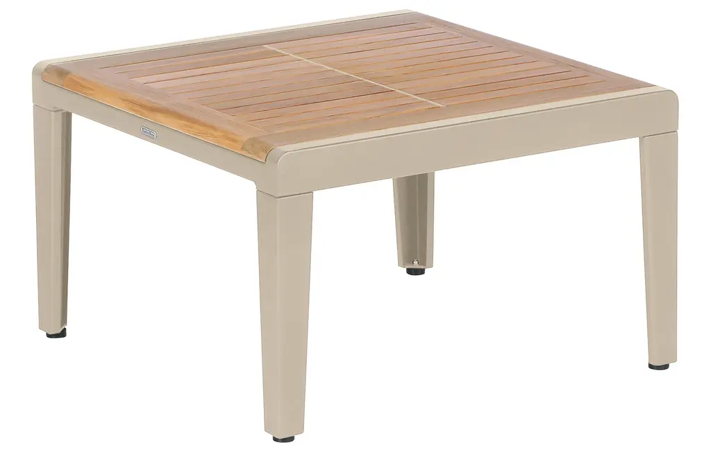 A lovely little table with a powder coated aluminum frame and teak top. Can be used with the Aura lounger or deep seating armchair.Please Note: Fabrics, canopies, cushions, covers, special order sling colors, and special order finishes are considered customized and may have longer lead times. These items cannot be cancelled, returned, or exchanged.