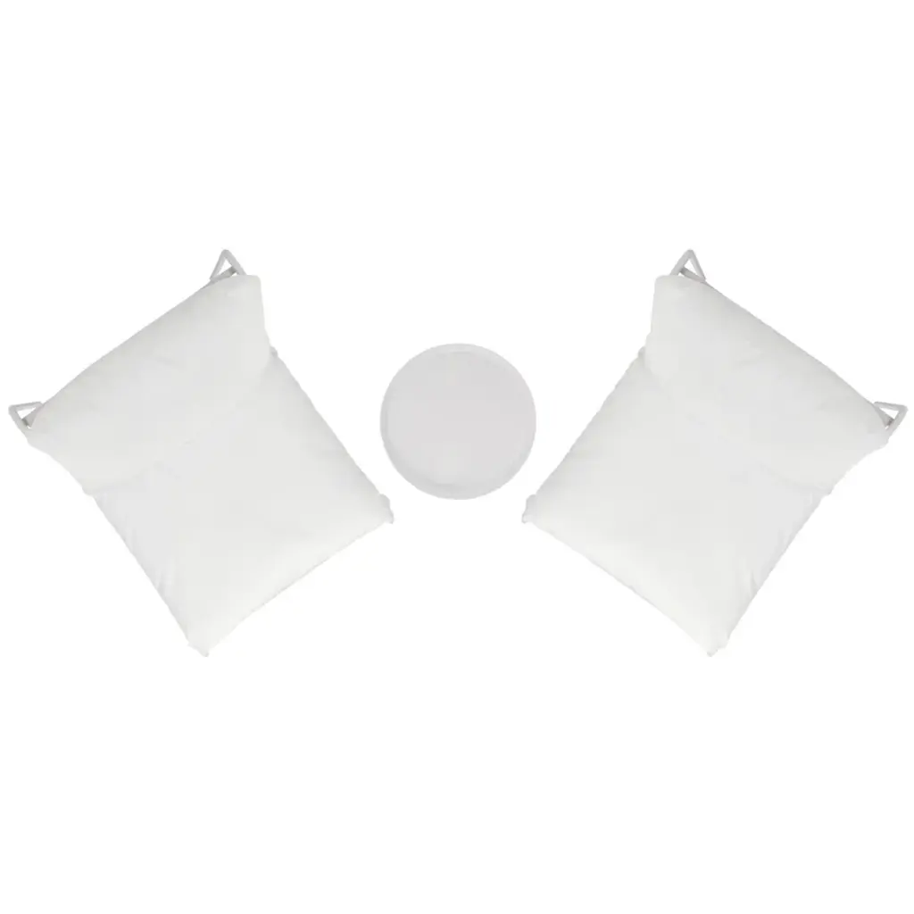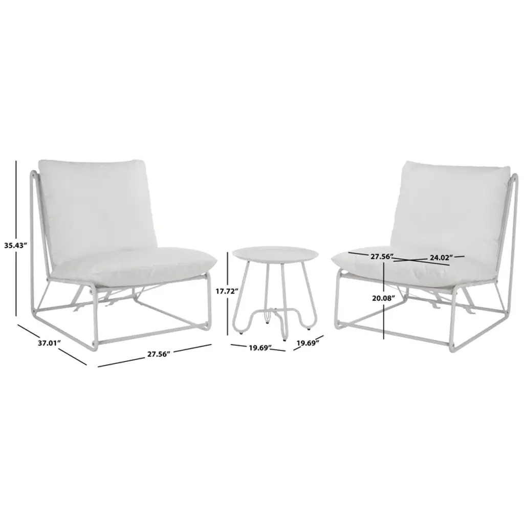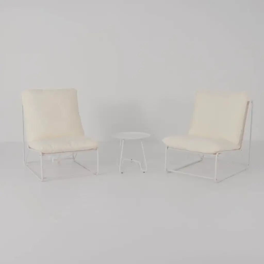 Bring inviting comfort and sleek style to your outdoor space with our Archie 3 piece set. Featuring two stylish accent chairs and a side table, our outdoor living set lends effortless comfort and lasting quality to any al fresco setting. The slender and refined, white steel frame of the chairs offers a sleek and sophisticated style. It is complemented with generously padded beige cushions to promise a comfortable stay. The cushions are neatly tailored in durable and easy-to-care PVC-coated polyester fabric. Our outdoor living set offers indoor-like comfort all year round, creating a perfect spot for lounging and chatting in a balcony, patio, or backyard.