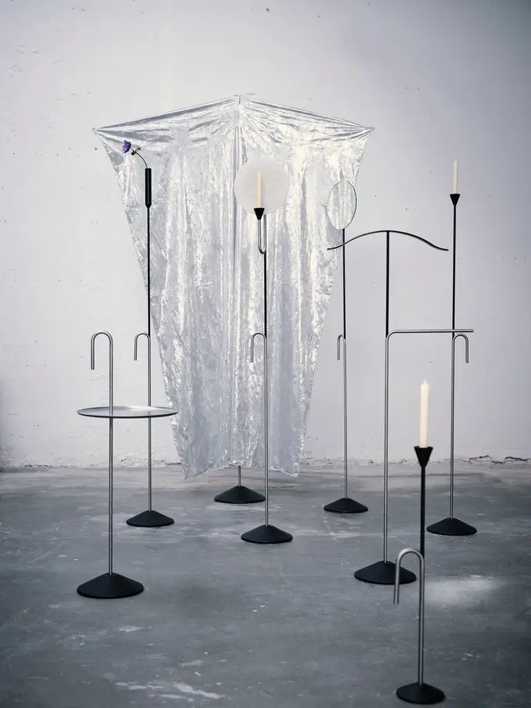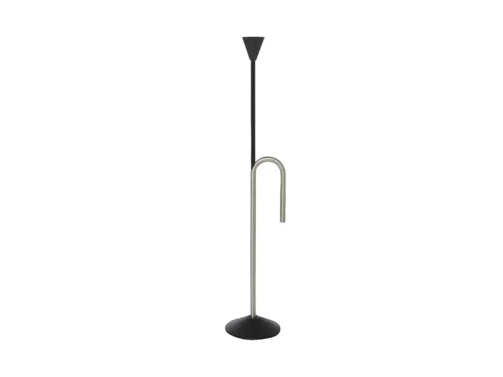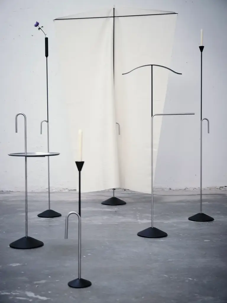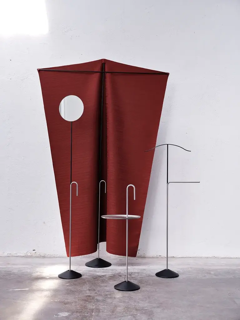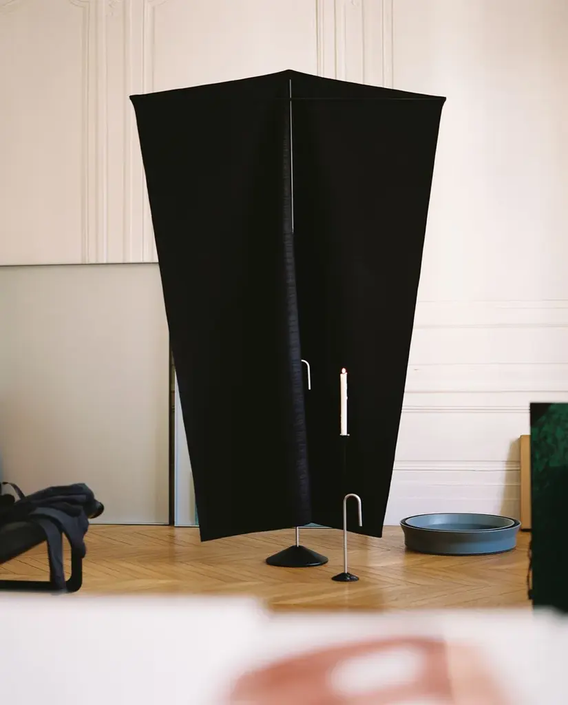The Baton collection was designed by Ronan Bouroullec and is produced by BD. Its sublime simplicity carves around the shape of a cane. The Baton finds its place in a room as a screen divider, a candleholder, a vase, a valet stand, a side table or a mirror. It strikes a balance between a fluent, curving line and a slim and unimposing frame. As a standalone or group, the Baton represents Bouroullec’s emphasis on refining function and form. The system changes interiors. It generates an intimate feeling in the home or a shared space, with an appealing design that is subtle and concise. A minimal frame with multiple uses.Materials and finishesBase in gravity die casting steel, polished and powder coated in textured black. Inox steel polished curved tube. Steel rod fixed to the base, powder coated in black matt. Different options available for the fabric space divider. When folded, horizontal rod used to hang the fabric is stored fixed on the vertical rod by two clipping systems.