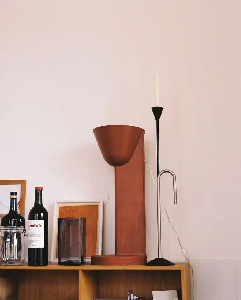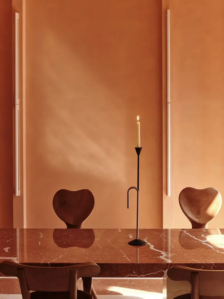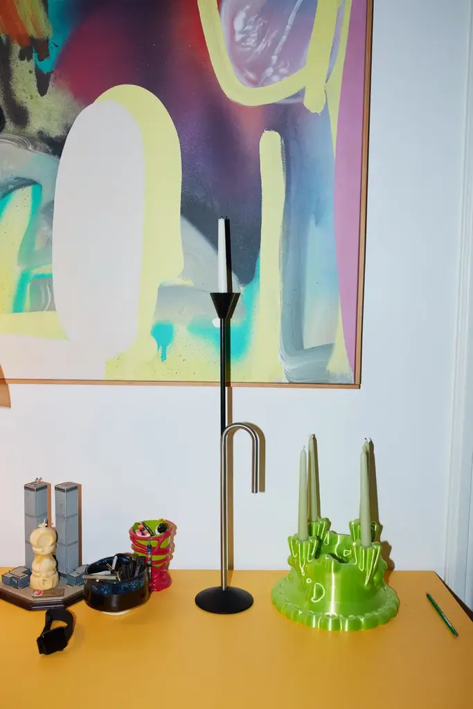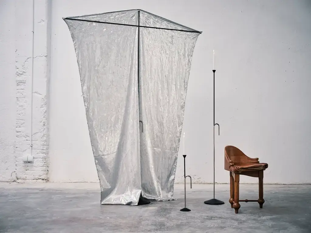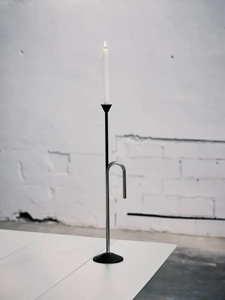 The Baton collection was designed by Ronan Bouroullec and is produced by BD. Its sublime simplicity carves around the shape of a cane. The Baton finds its place in a room as a screen divider, a candleholder, a vase, a valet stand, a side table or a mirror. It strikes a balance between a fluent, curving line and a slim and unimposing frame. As a standalone or group, the Baton represents Bouroullec’s emphasis on refining function and form. The system changes interiors. It generates an intimate feeling in the home or a shared space, with an appealing design that is subtle and concise. A minimal frame with multiple uses.Materials and finishesBase in gravity die casting steel, polished and powder coated in textured black. Inox steel polished curved tube. Steel rod fixed to the base, powder coated in black matt. Different options available for the fabric space divider. When folded, horizontal rod used to hang the fabric is stored fixed on the vertical rod by two clipping systems.