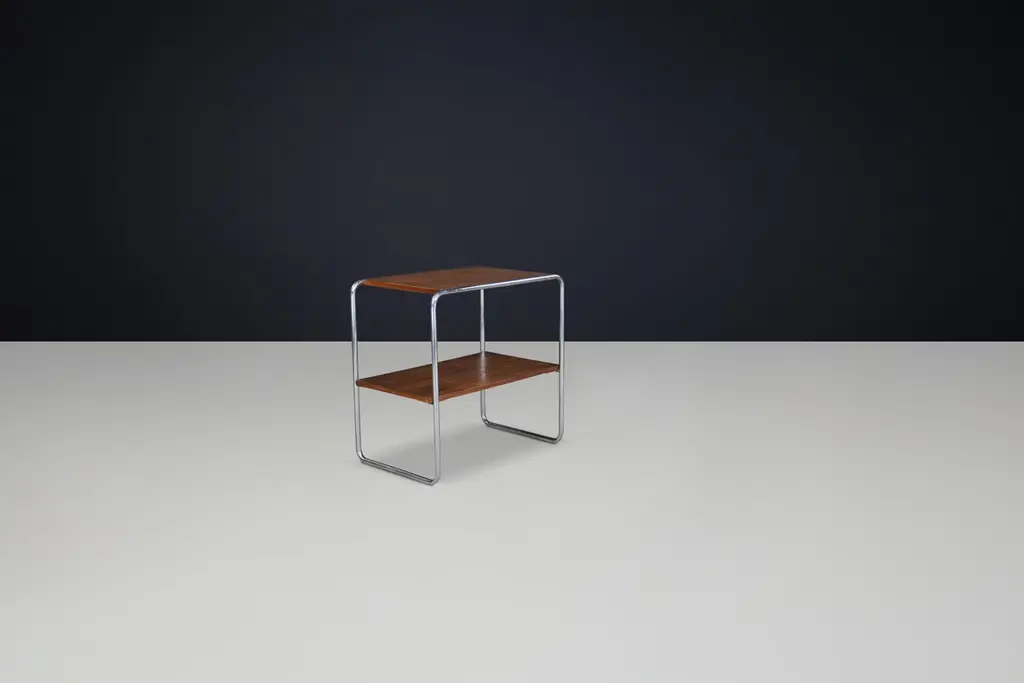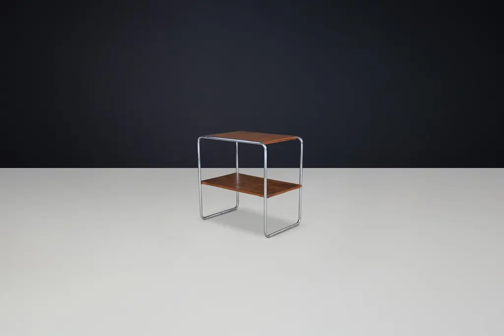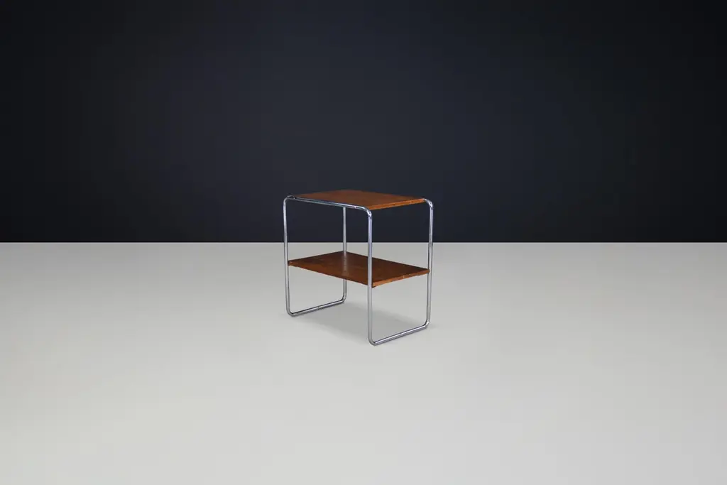 Bauhaus Tubular Steel and Wood Console Table, Model B12 by Marcel Breuer for Thonet, Prague, 1930s2 available – priced per tableDimensions: H 70 cm x W 70 cm x D 45 cmA timeless Bauhaus design classic, this model B12 console table was created by Marcel Breuer and produced by Thonet in Prague during the 1930s. Known for pioneering the use of tubular steel in furniture, Breuer’s design here is a masterful exercise in clarity, utility, and modernist purity. The table features a continuous chromed steel frame that supports two wooden surfaces—one serving as the tabletop and the other as a lower shelf, offering a practical storage or display solution.The sleek profile and restrained form exemplify Breuer’s commitment to industrial materials and functional aesthetics. Its curved steel tubing gives the piece a visual lightness and structural integrity, while the rich wooden elements add warmth and tactile contrast. The proportions are exceptionally balanced, making it suitable as a side table, nightstand, or console in a variety of settings, from residential to gallery or office environments.The tables remain in good vintage condition with signs of wear consistent with age, including light patina and surface marks to the wood and chrome. These imperfections add authenticity and underline the historical value of the piece.Wholly original and unaltered, this design is a rare and sought-after example of early 20th-century European modernism. With its iconic form and design pedigree, the B12 model is an essential acquisition for collectors and admirers of Bauhaus furniture and modernist heritage.Sold individually. 2 available.