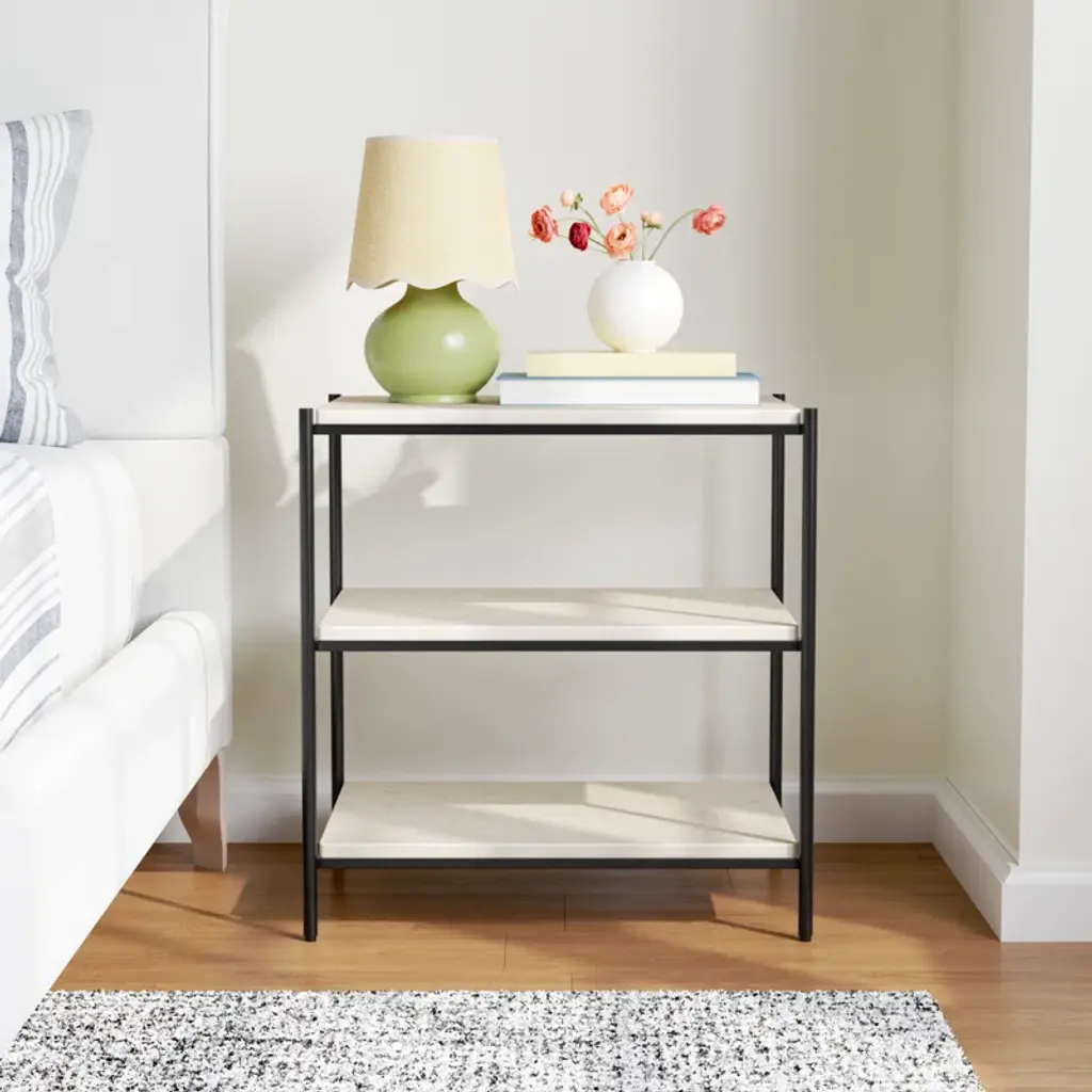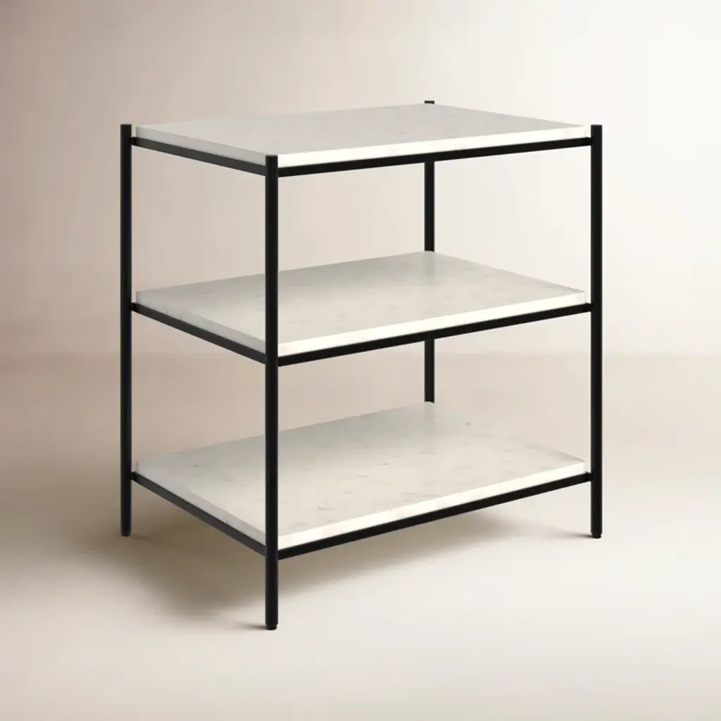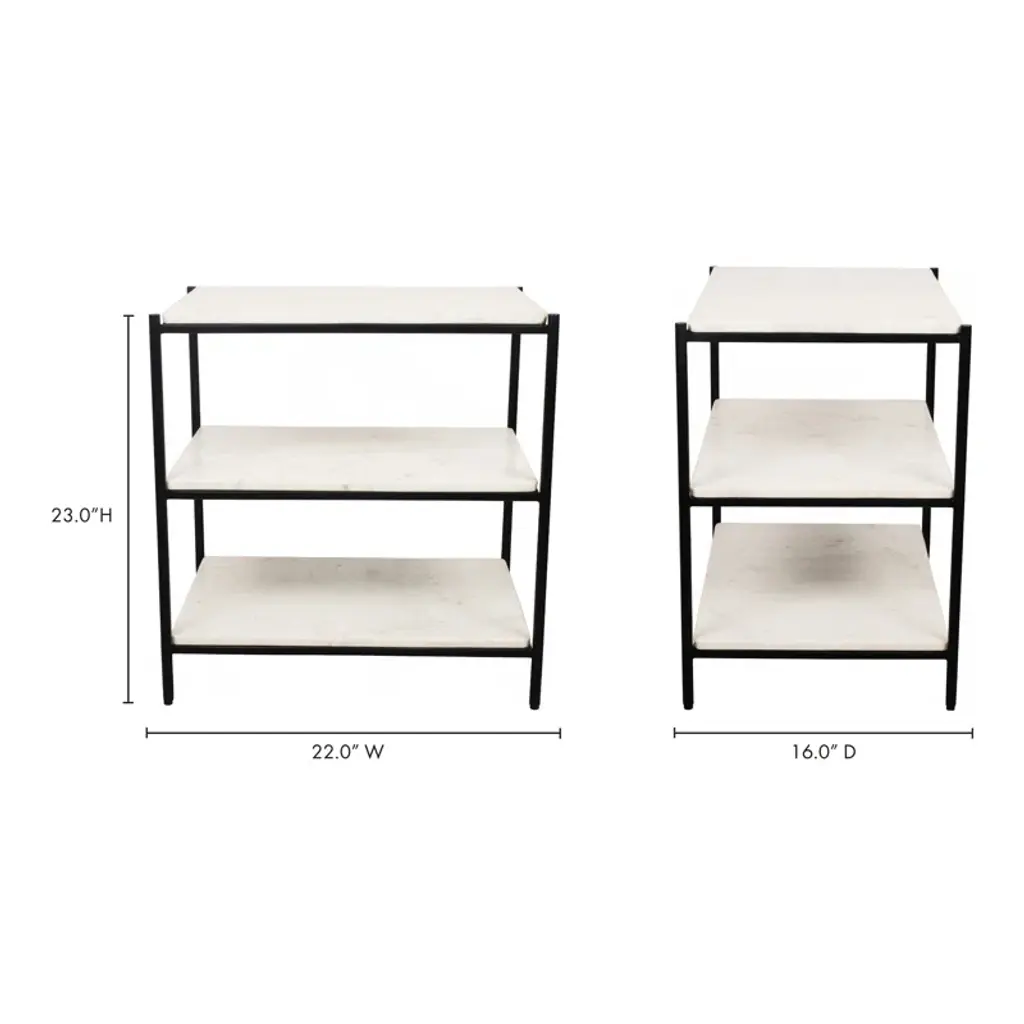 The Bayshore nightstand builds a story around elemental bursts of marble and iron. Three tiers of white marble are joined together by a sturdy semi-gloss iron frame to create something as functional as it is elegant. This versatile nightstand keeps things neat and organized in the bedroom but would look great in any room setting.