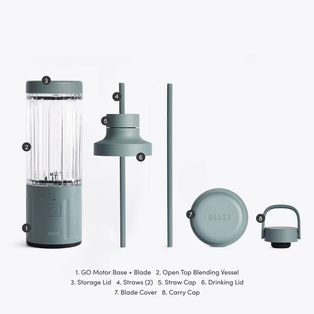 Blend without limits: Beast GO Cordless.The Beast GO is the world’s first premium portable blender, designed for blending anywhere, anytime. The GO comes with a rechargeable 3-cell battery 50% stronger than the average portable blender. From blended beverages, to sauces and dressings, or even grinding coffee beans and grating cheese, the GO delivers free-range functionality. The GO is engineered with precision. Made of premium materials, featuring a compact, easy to use and easy to clean design. Experience powerful Beast blending performance right in the palm of your hand. Each charge powers 13x, 30 second blend cycles with quick and easy charging via the USB-C cord. Plus: Blend-Sip-Go! Your blending cup is also your drinking cup, with Beast’s signature drinking lids and spill-proof straw system.
