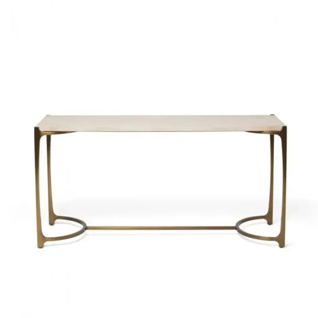 Thanks to the pairing of a raw travertine top and a graceful golden bronze-finished metal base, the Beaumont Console Table makes for an elegant accent. Granite and marble are natural materials; variations in coloration, veining and texture are to be expected. Veins, smooth to the touch, are not defects, but rather natural imperfections that add to the uniqueness and charm of each piece.
